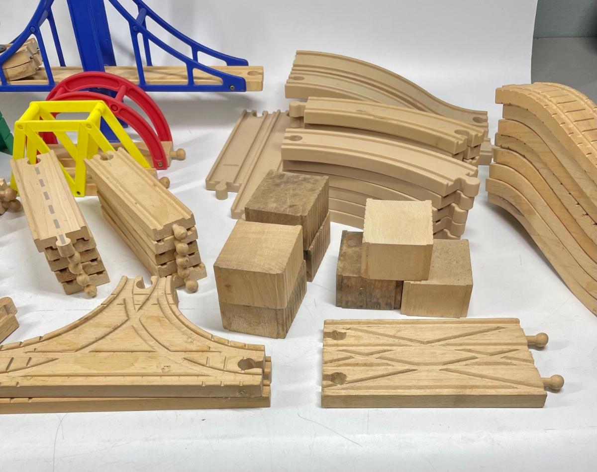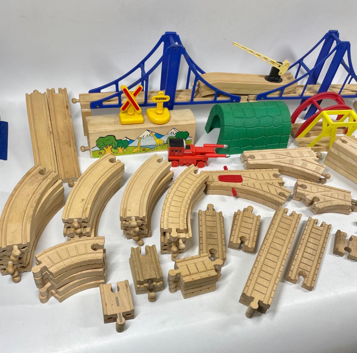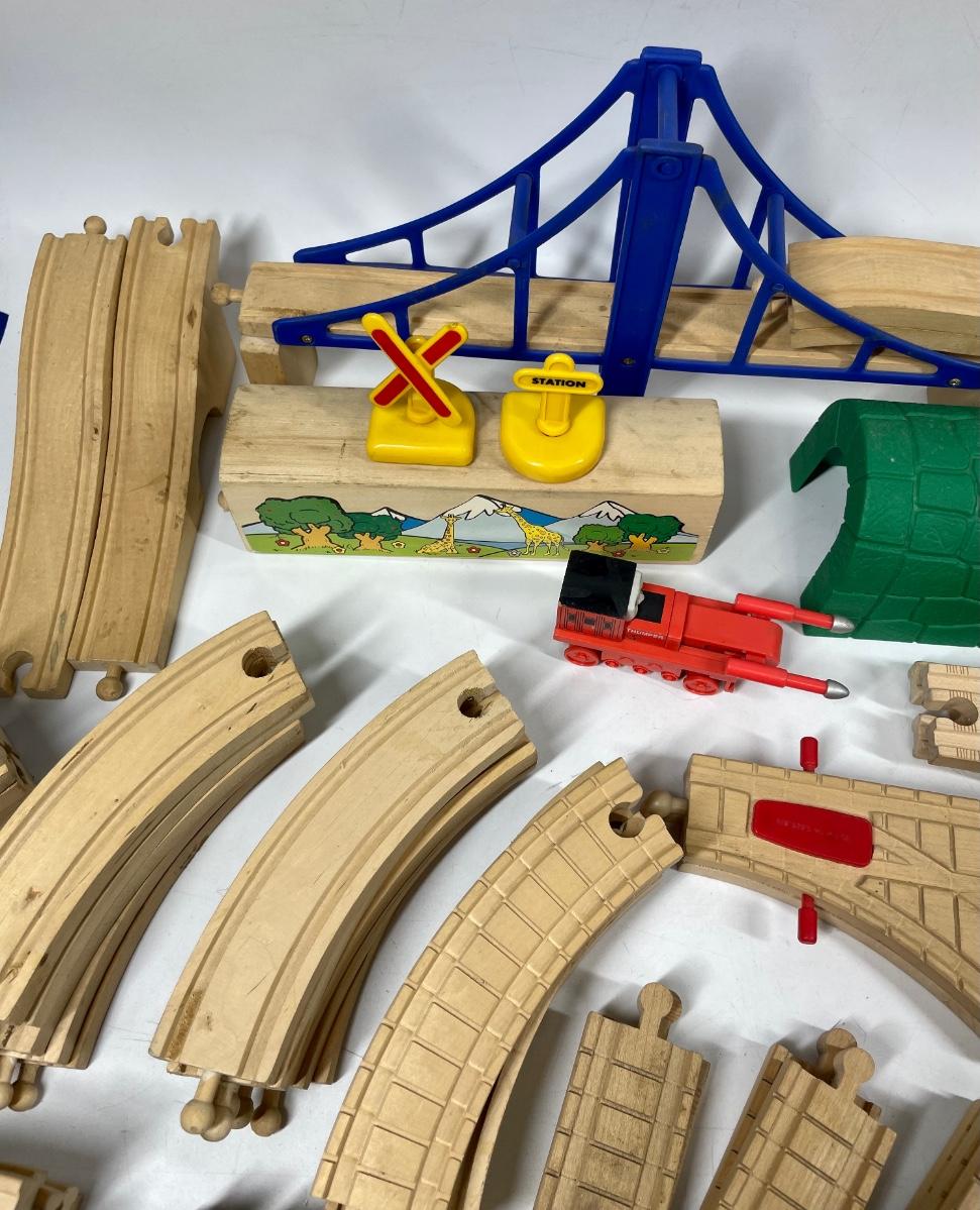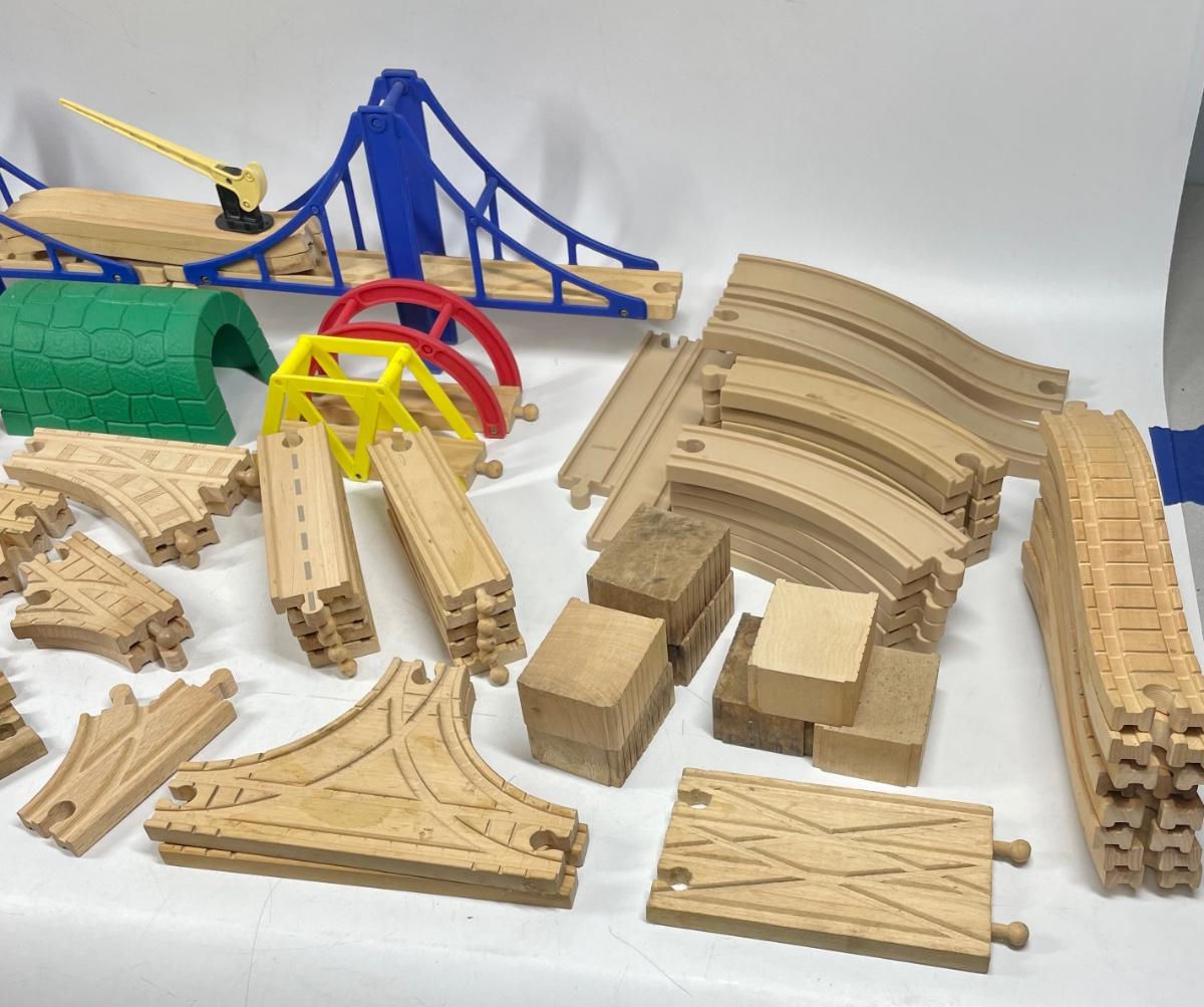 Includes everything in photo: 74 wood track parts, 21 accessories (bridges, tunnels, signs, track supports, train) and 16 plastic track parts. Playset is compatible with Kid Kraft, IKEA, B. Toys, and others. Clean, used condition.
