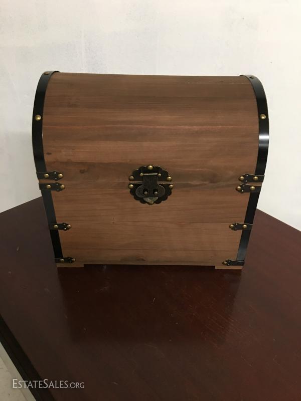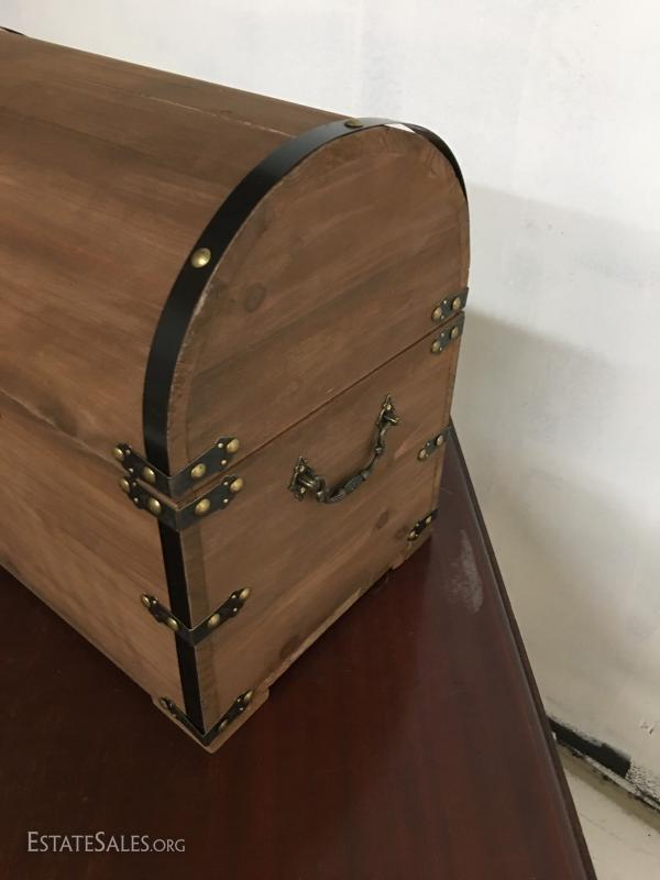 Chest is banded with steel and made of wood. Brand new in the box, measures 15" wide, 10" deep and 14" tall. 2 available.