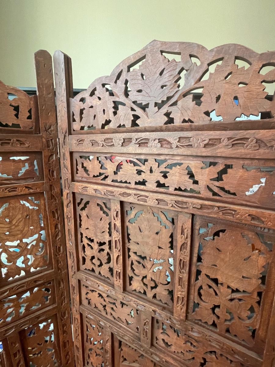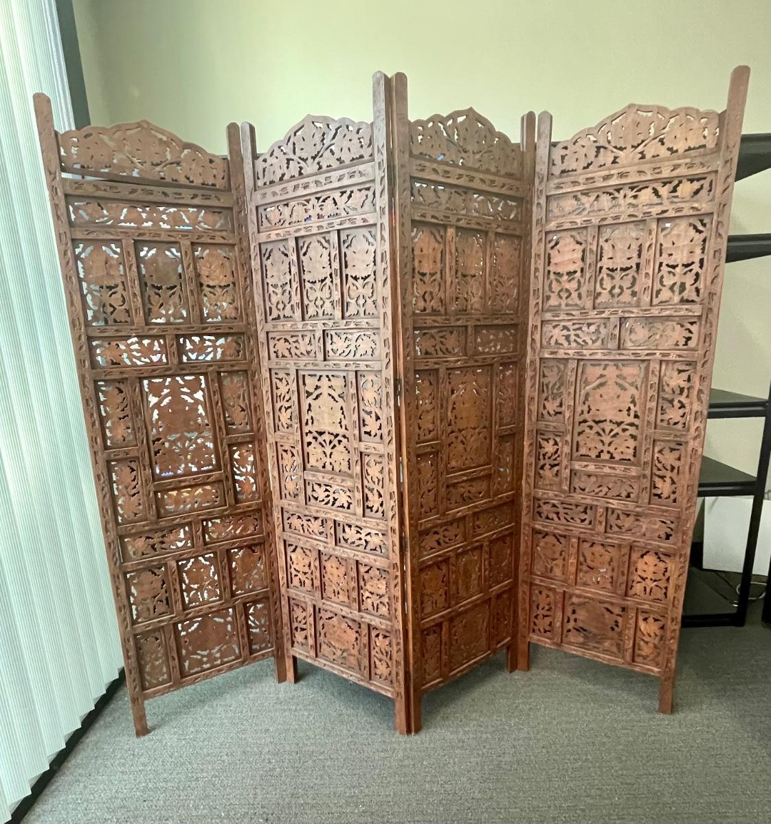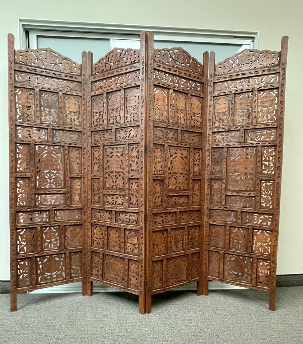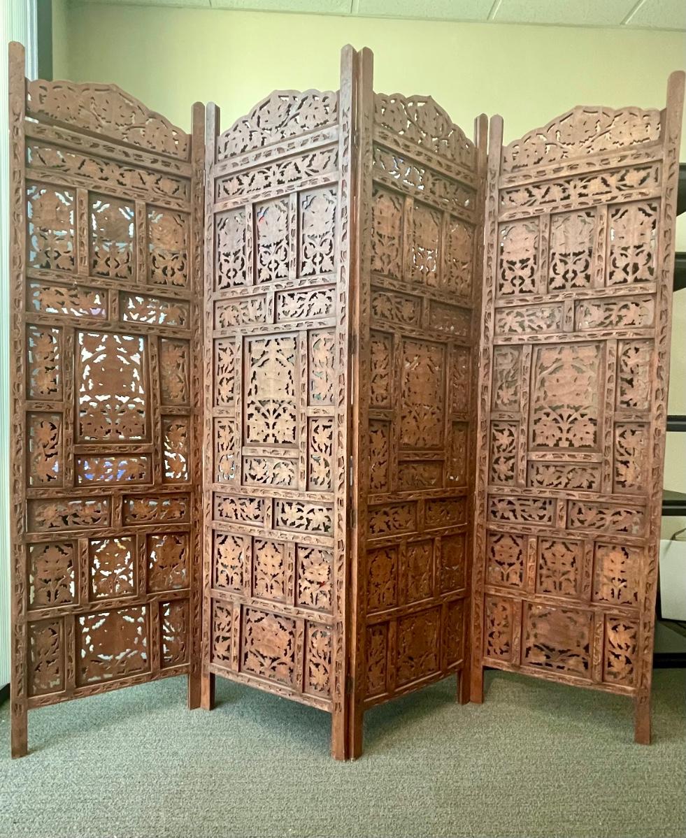 Hinged 4-panel carved wood room divider. 72" tall, each panel is 20" wide. Makes an excellent ornate room divider/decor piece, also can be used as a photo backdrop.