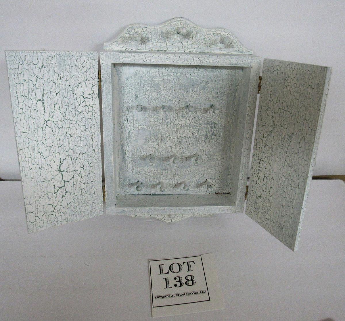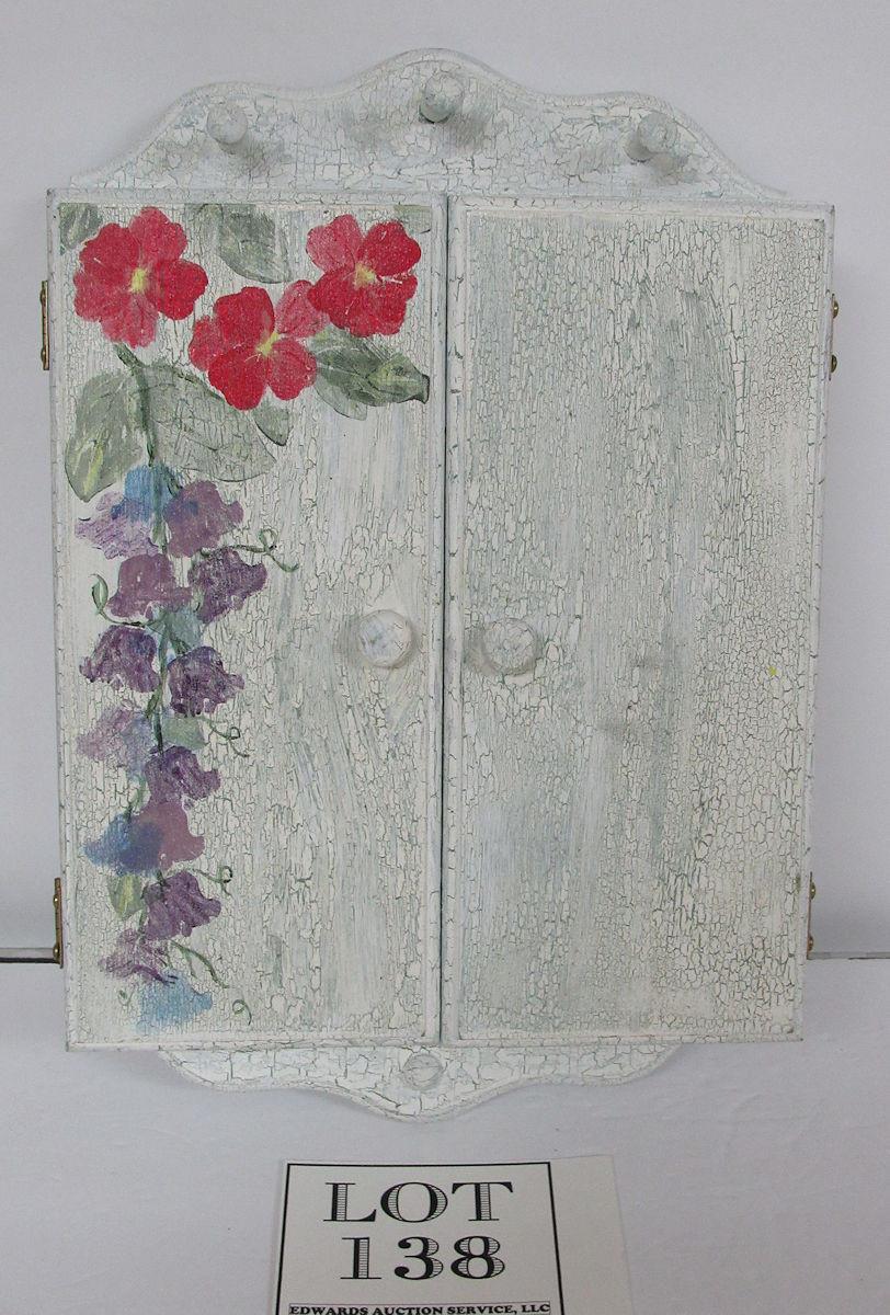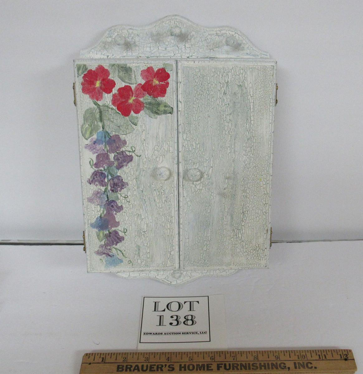 Wood Wall Keys Cabinet, White Distressed Look Paint With Flowers