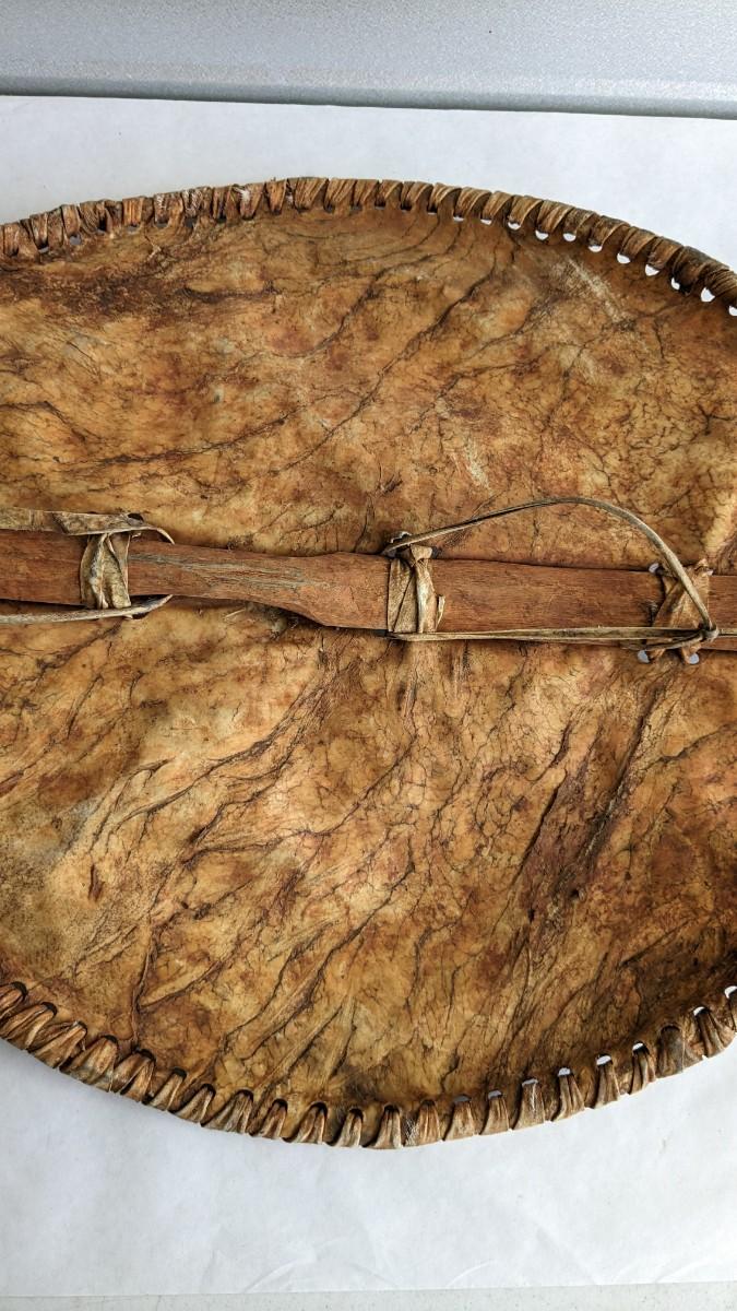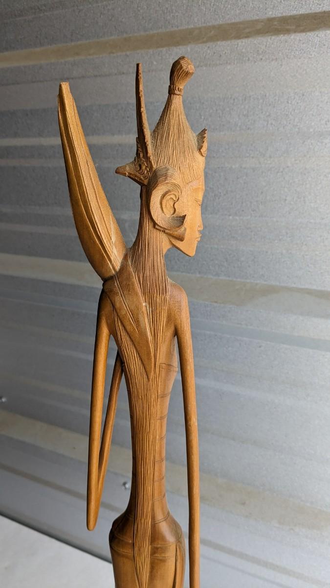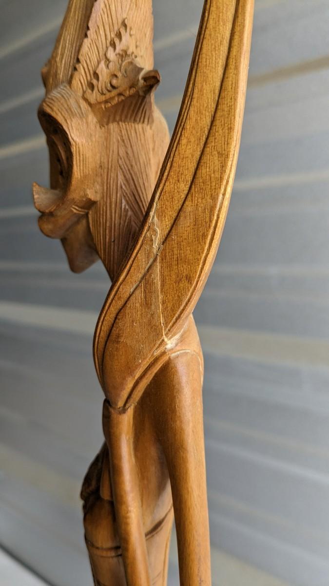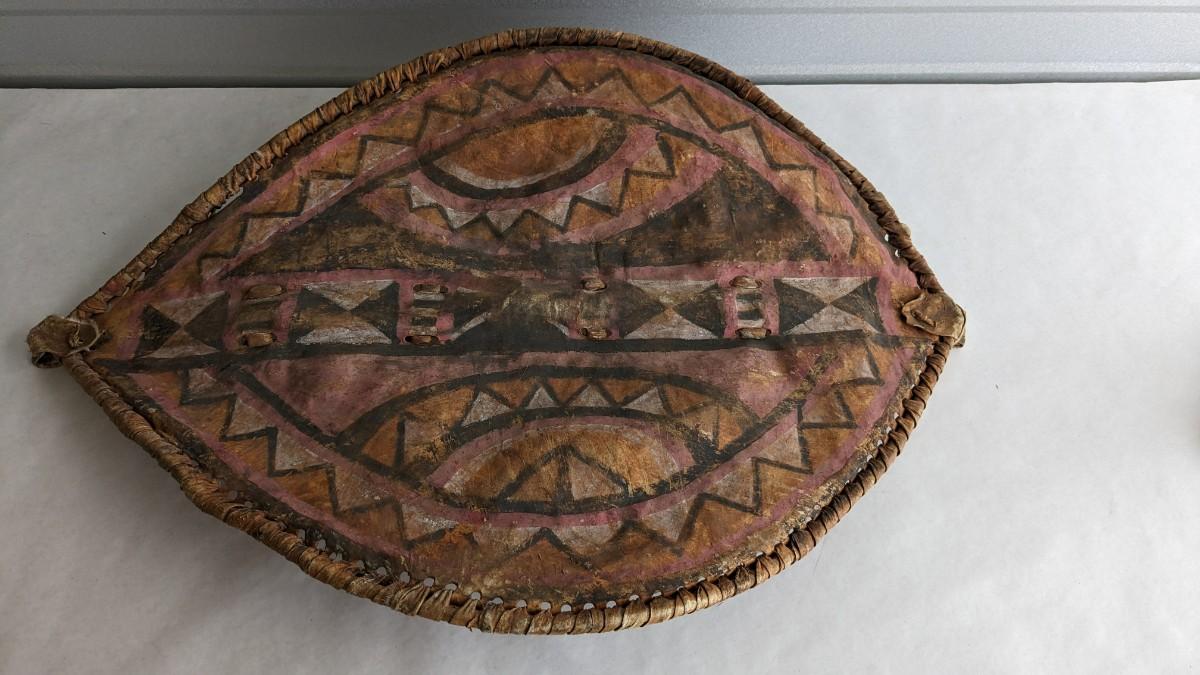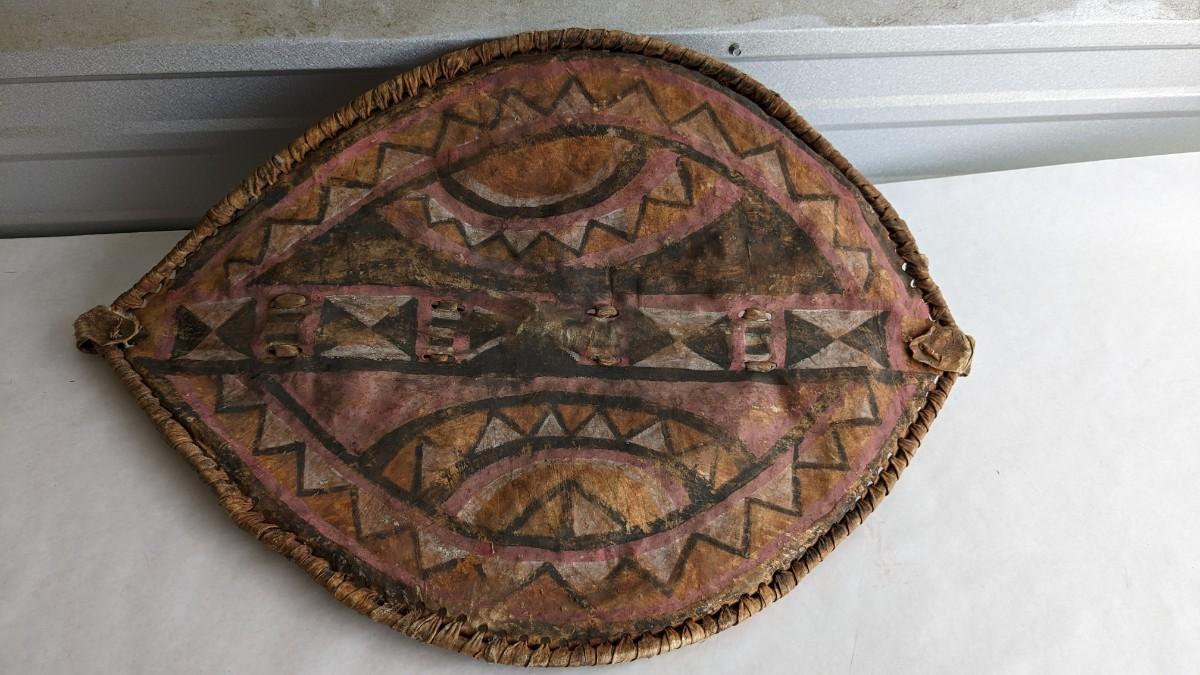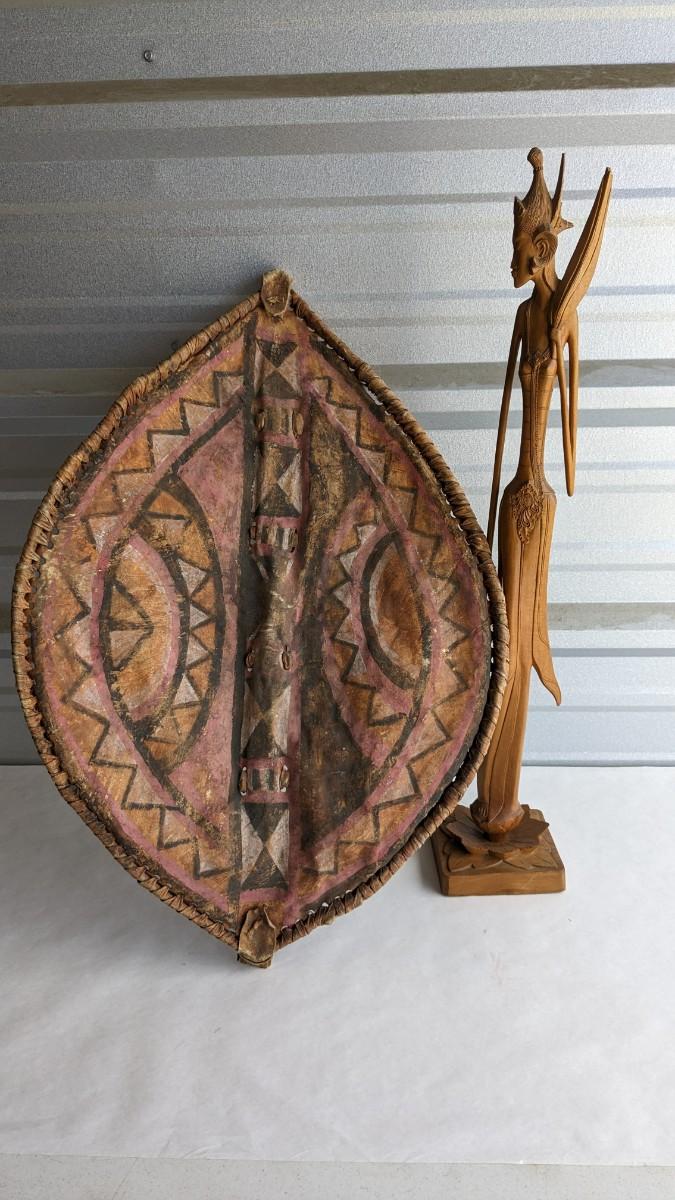 2 beautiful souvenirs including 30" carved statue from Bali, please note repair made to her fan and dry wood conditions as noted in photos. Also includes 30.25"x19" hand painted tribal shield, this stunning piece is handcrafted out of wood and animal hide with beautiful detail to the front, wear is noted, no broken pieces or holes punched through. No shipping, 2616
