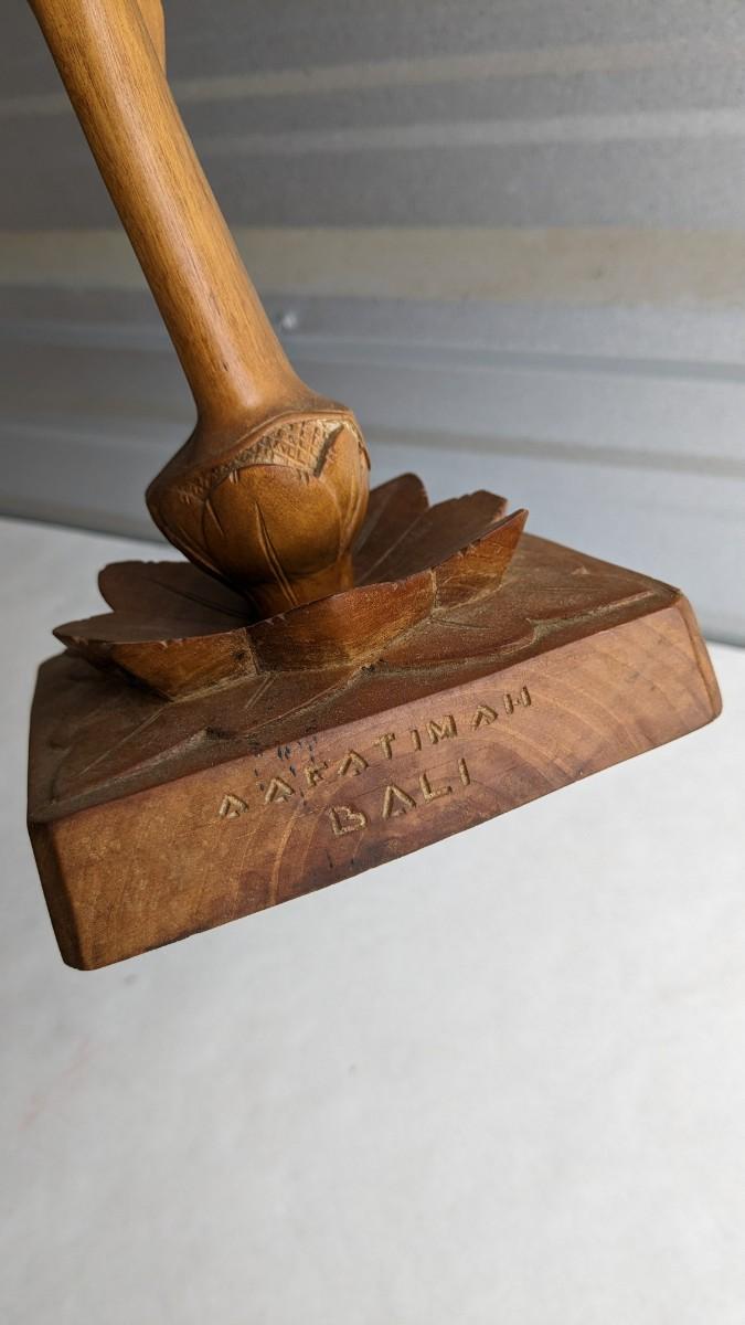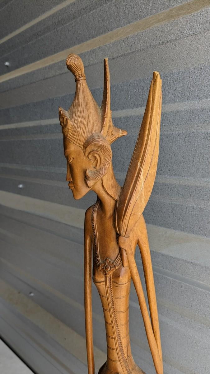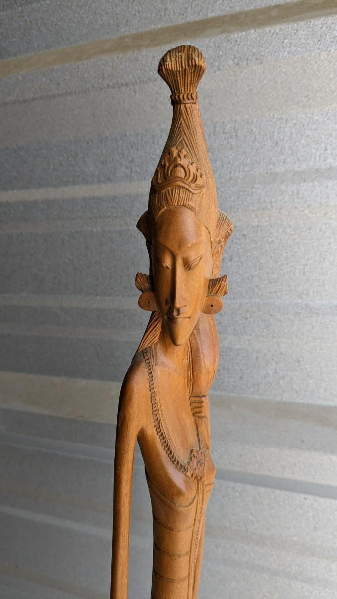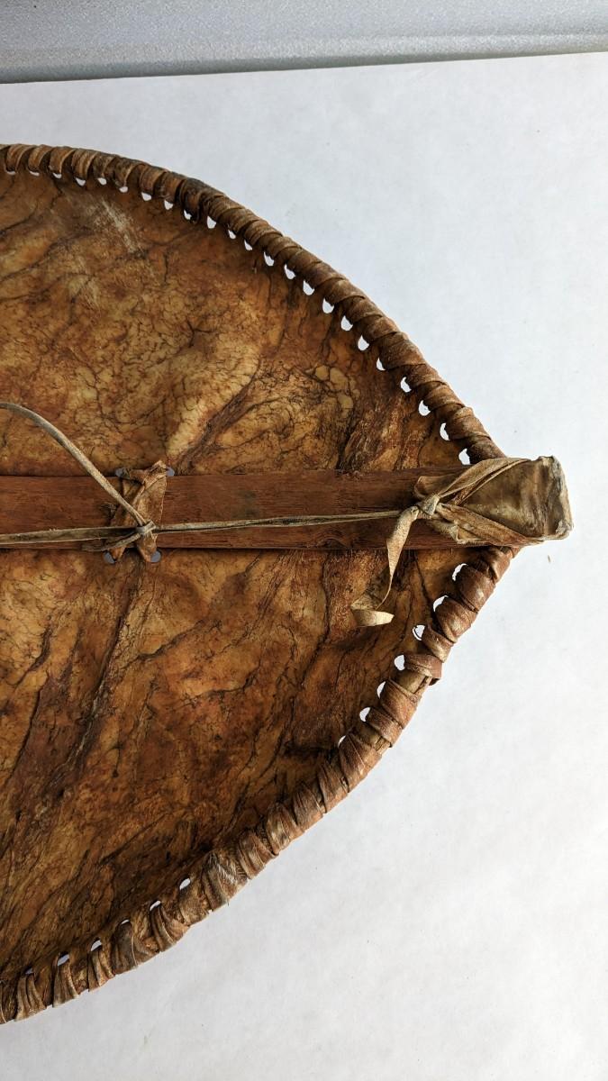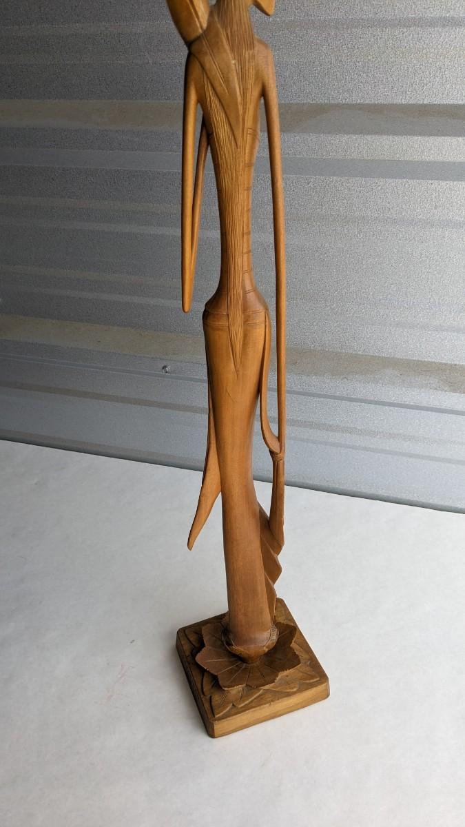 2 beautiful souvenirs including 30" carved statue from Bali, please note repair made to her fan and dry wood conditions as noted in photos. Also includes 30.25"x19" hand painted tribal shield, this stunning piece is handcrafted out of wood and animal hide with beautiful detail to the front, wear is noted, no broken pieces or holes punched through. No shipping, 2616