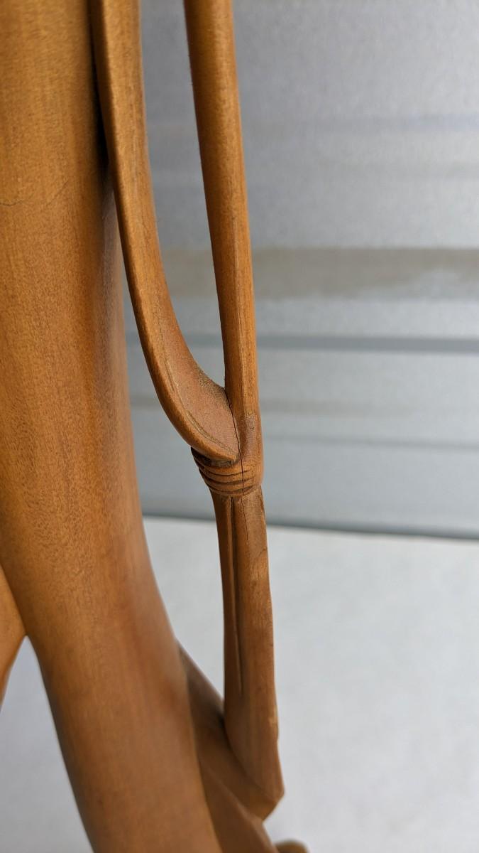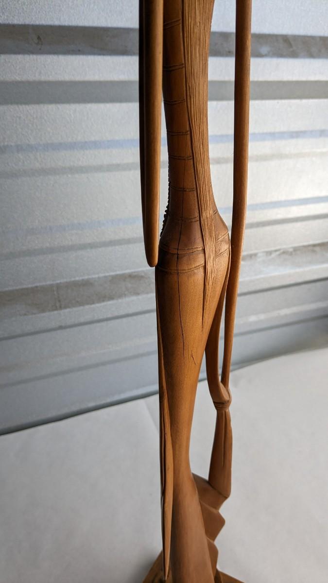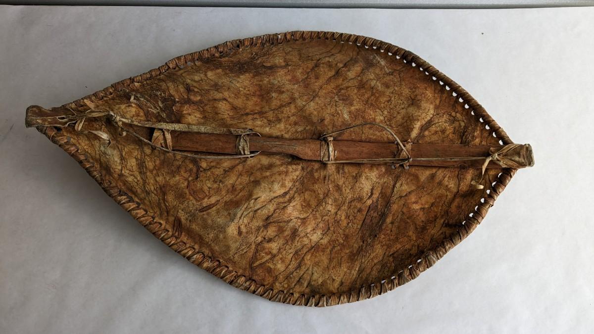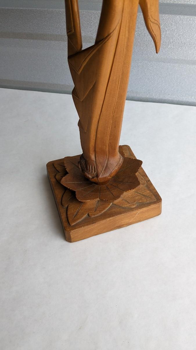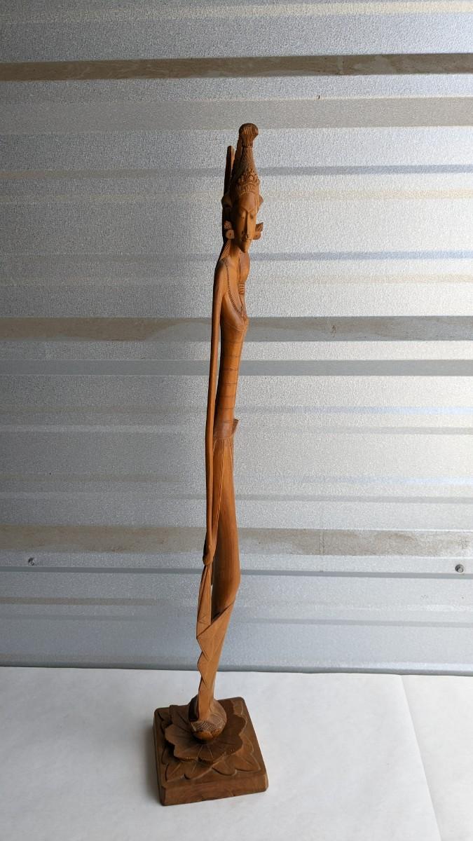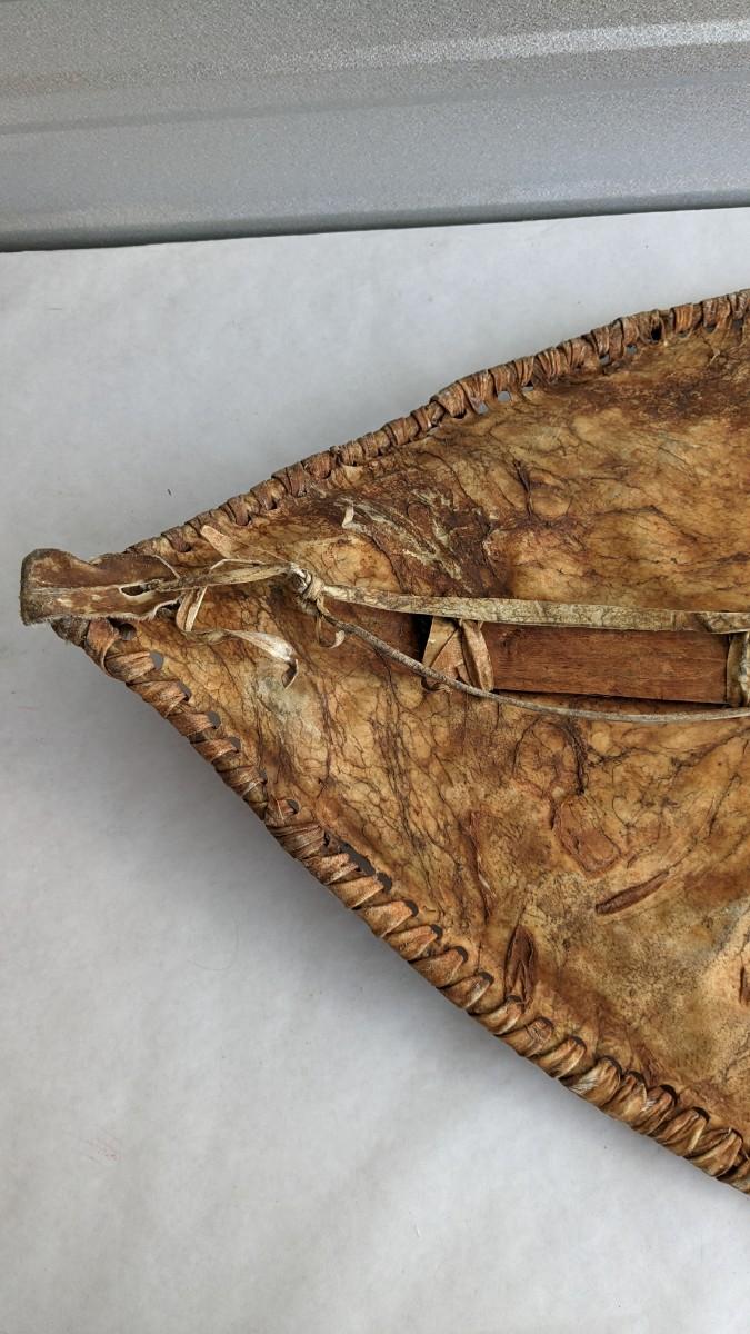 2 beautiful souvenirs including 30" carved statue from Bali, please note repair made to her fan and dry wood conditions as noted in photos. Also includes 30.25"x19" hand painted tribal shield, this stunning piece is handcrafted out of wood and animal hide with beautiful detail to the front, wear is noted, no broken pieces or holes punched through. No shipping, 2616