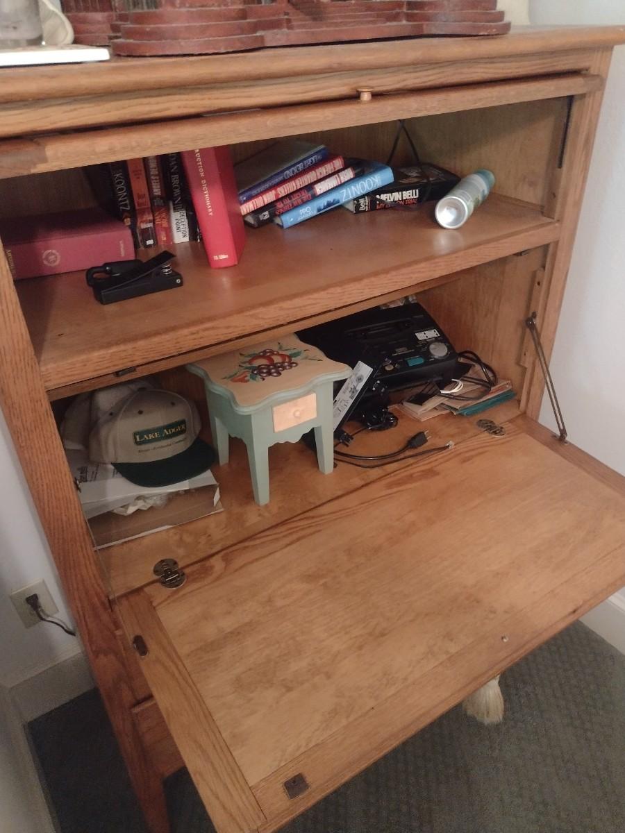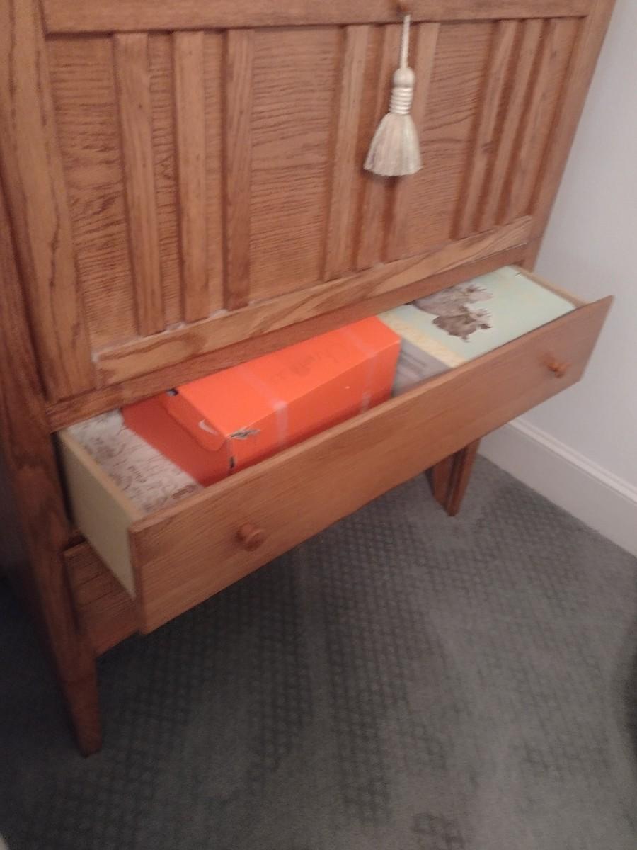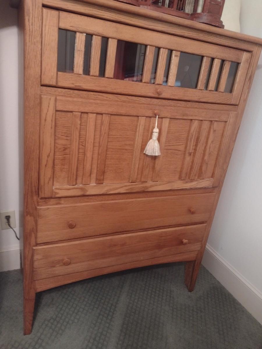 Wood Writing Desk with Double Drawer Storage. Bring assistance to remove. Lower-level item with stairs to the main floor