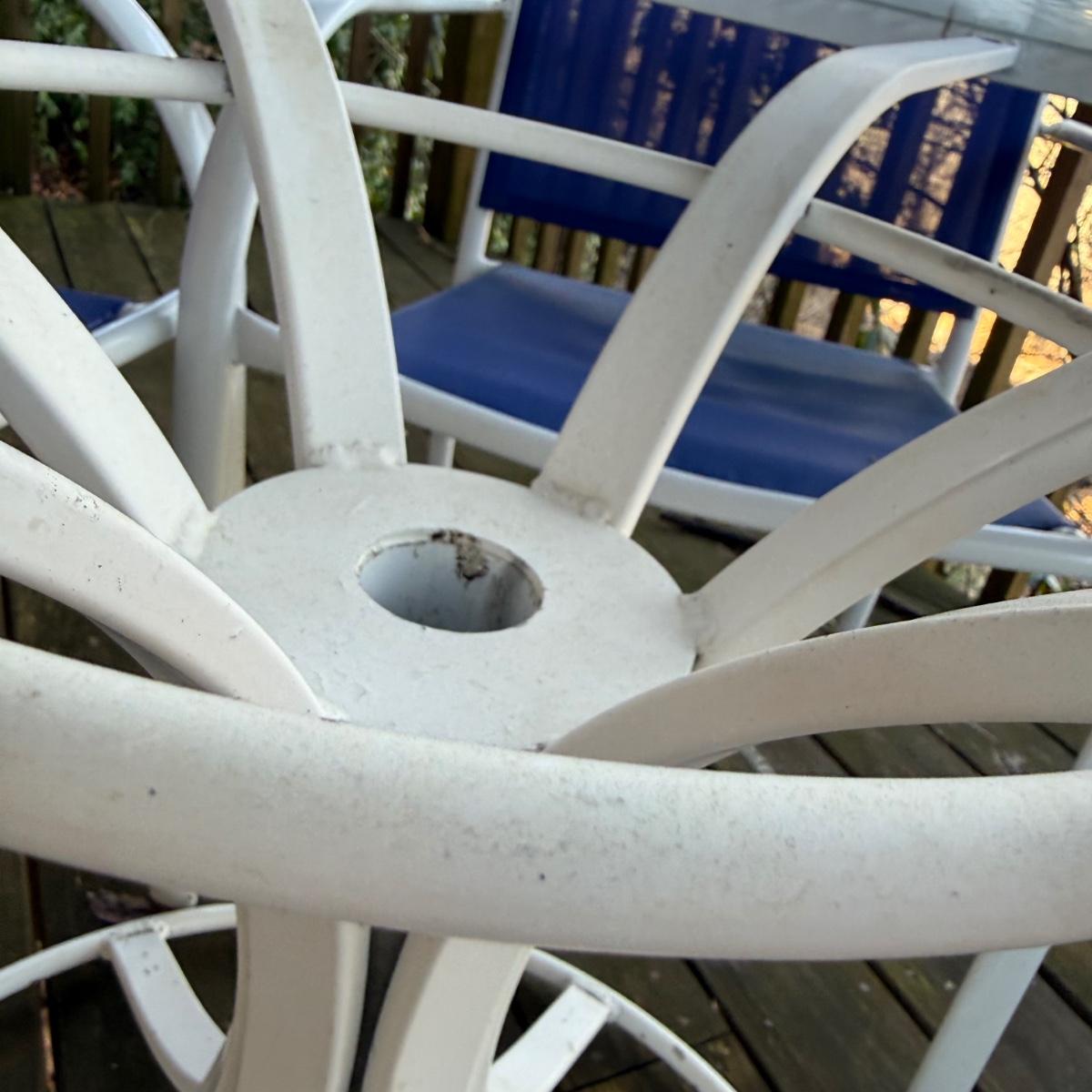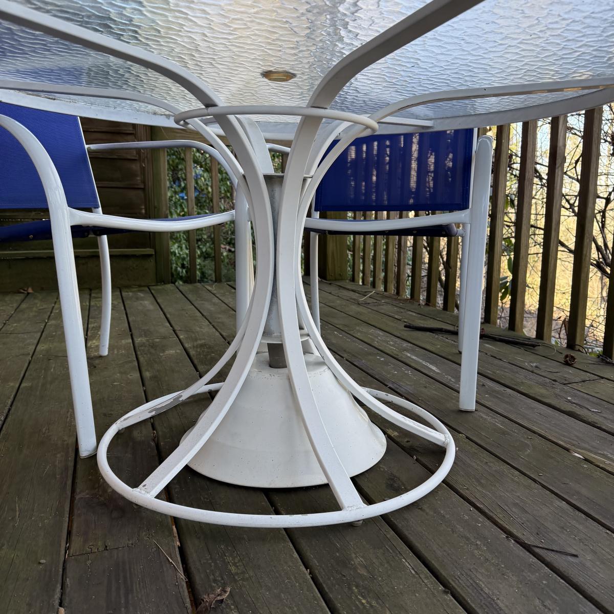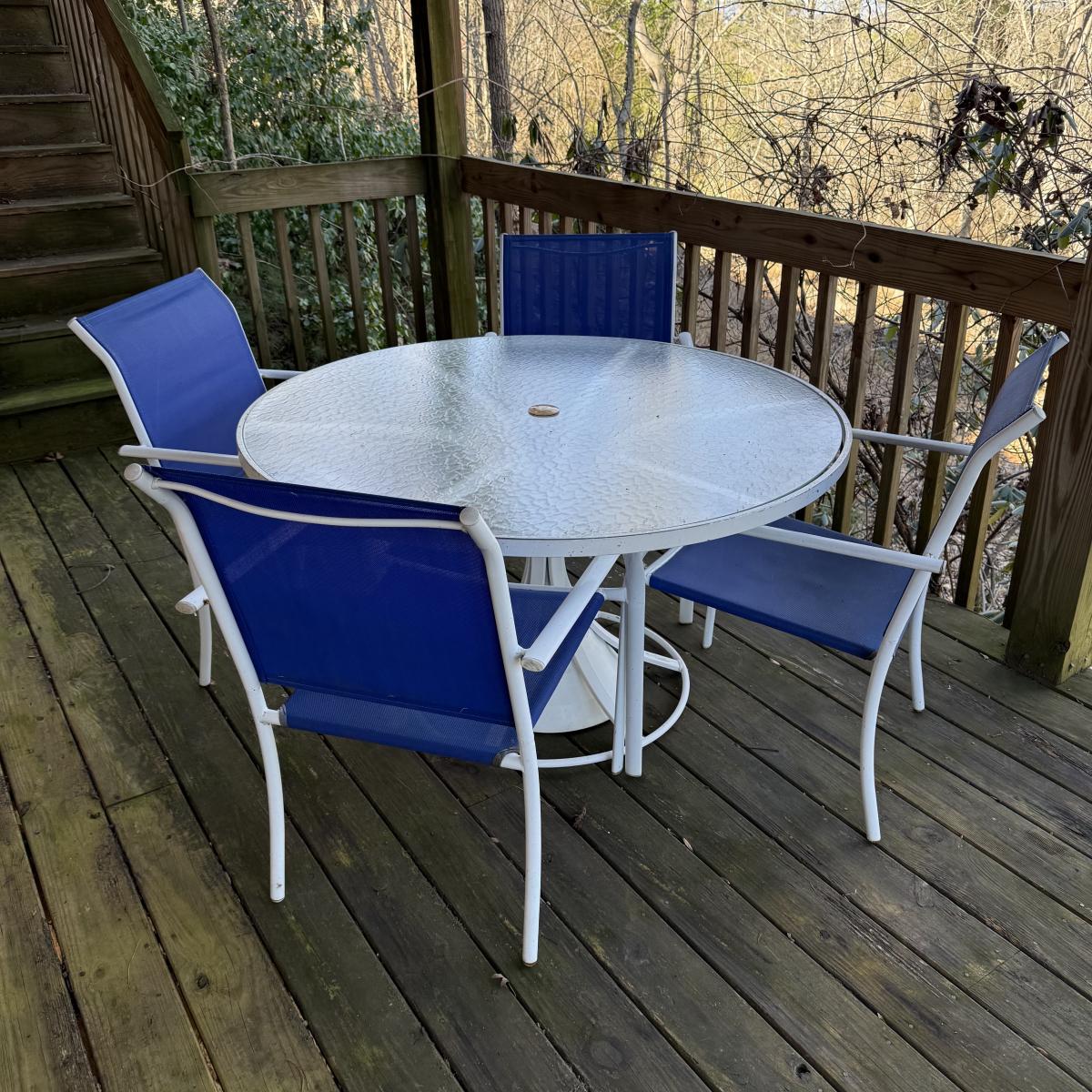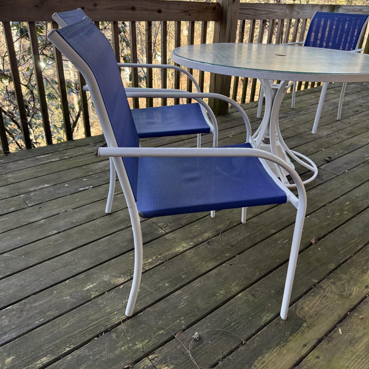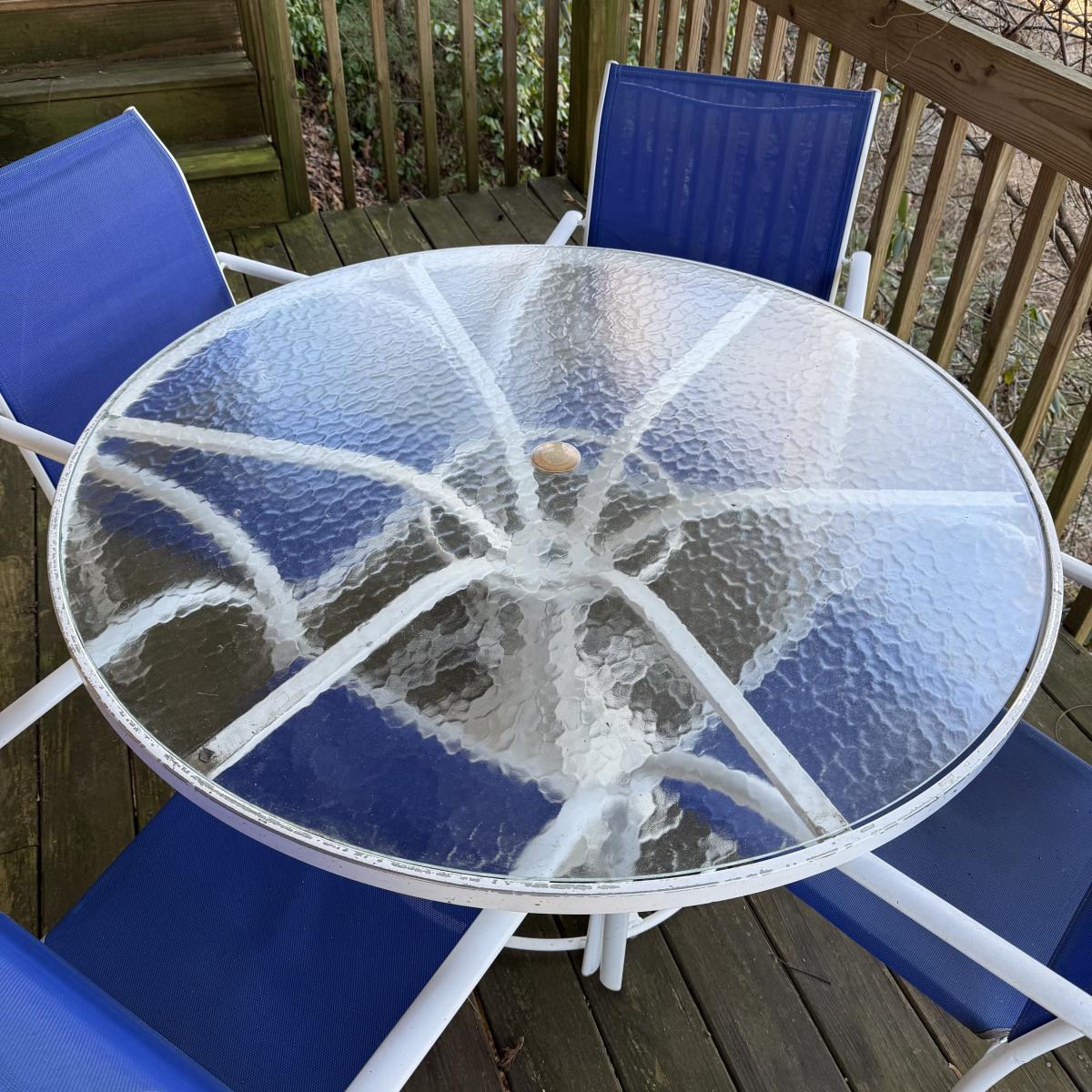 Woodard brand aluminum patio table with glass top comes with four aluminum chairs that have blue mesh fabric seats and backs. The table is 48”D x 27”H and the chairs are 23.5” x 21” x 34”H with a 17” seat height. The glass is not attached to the base. There is some wear to the white finish.