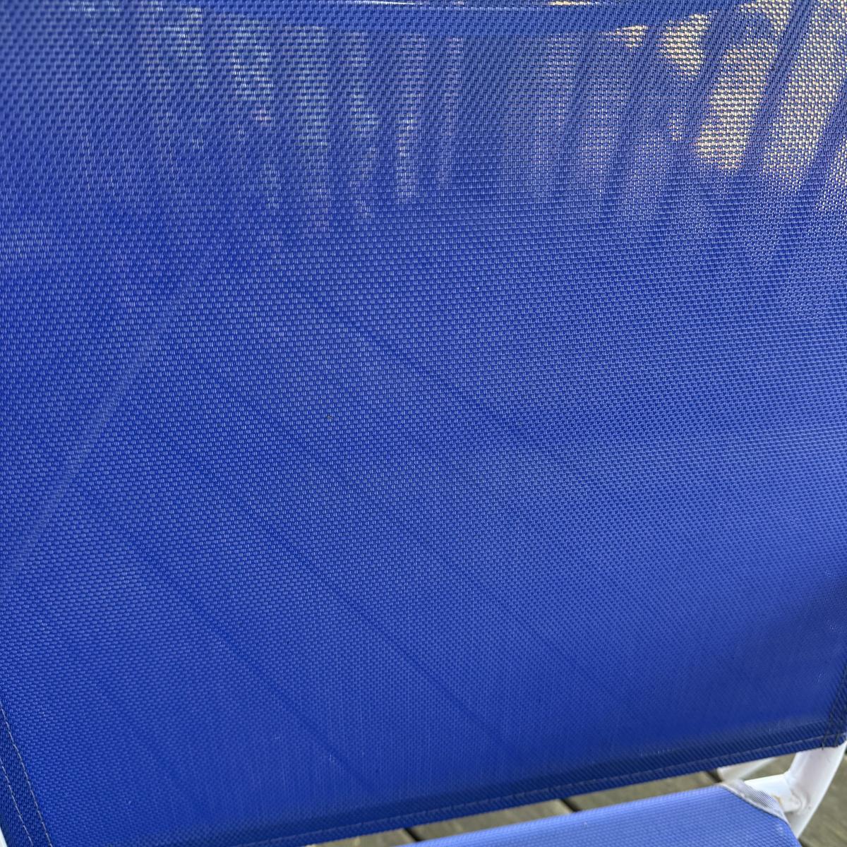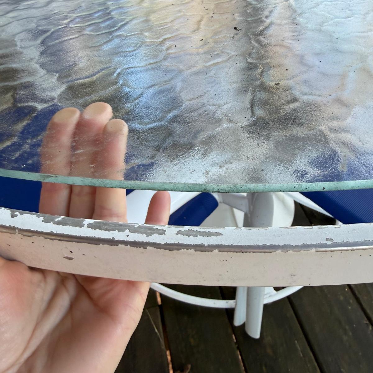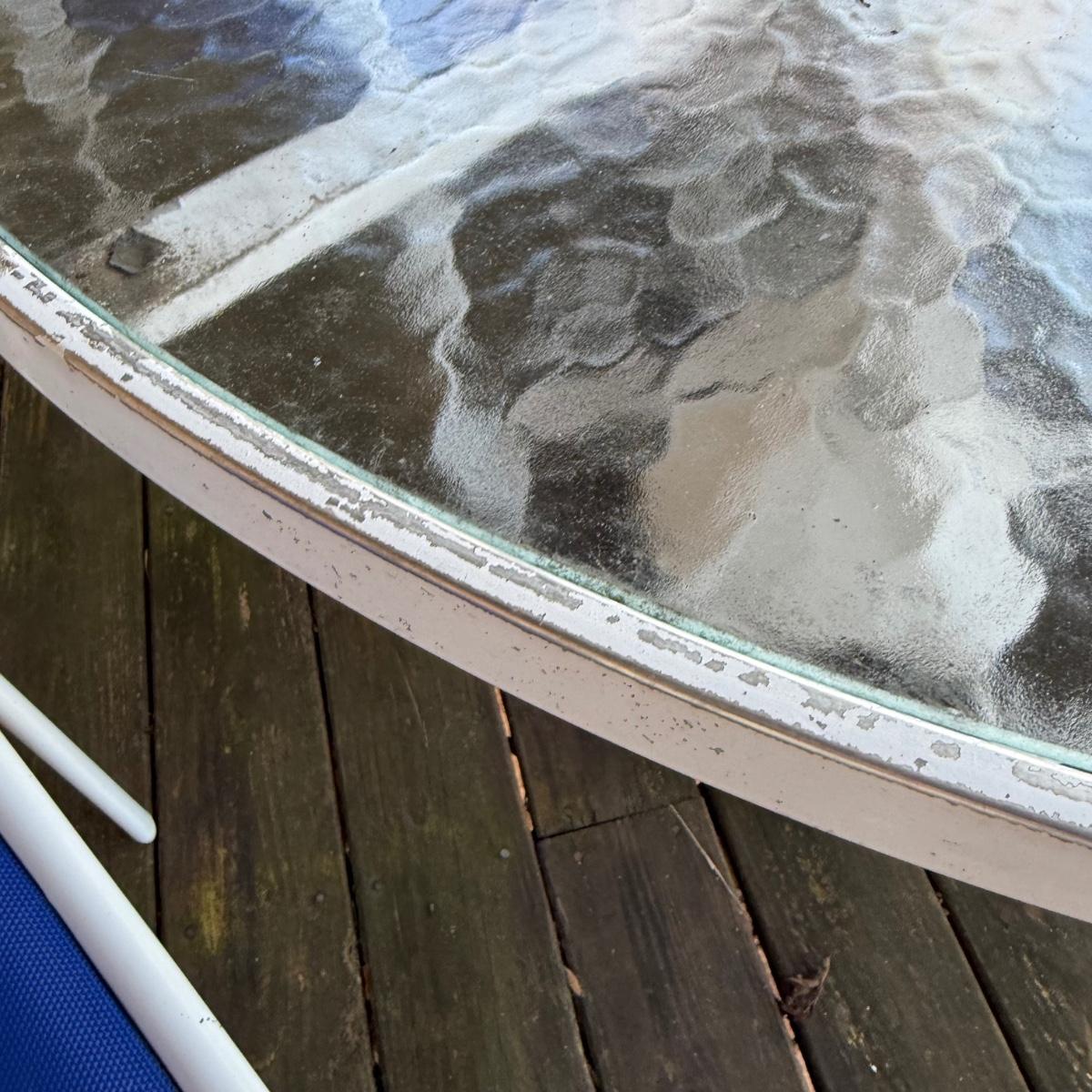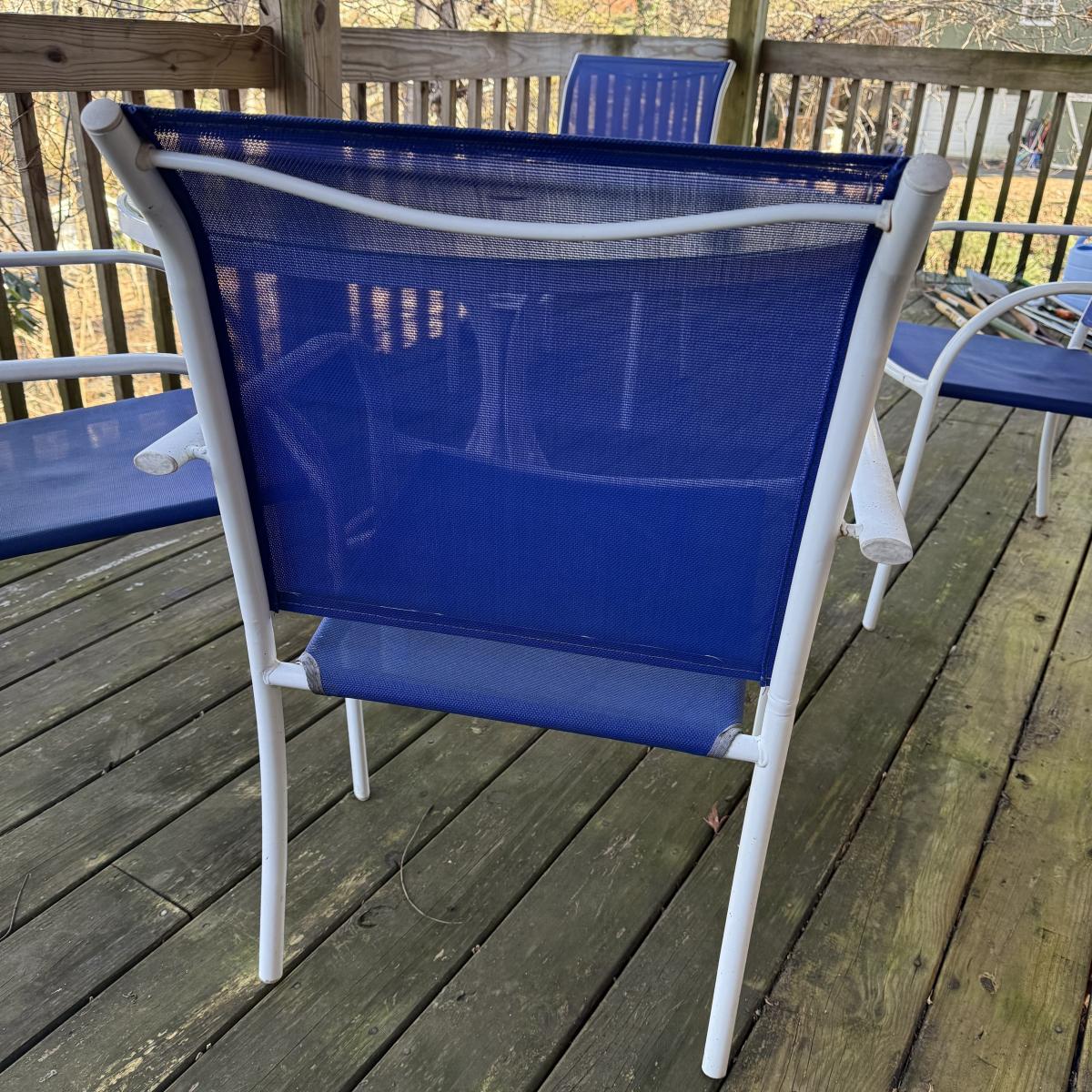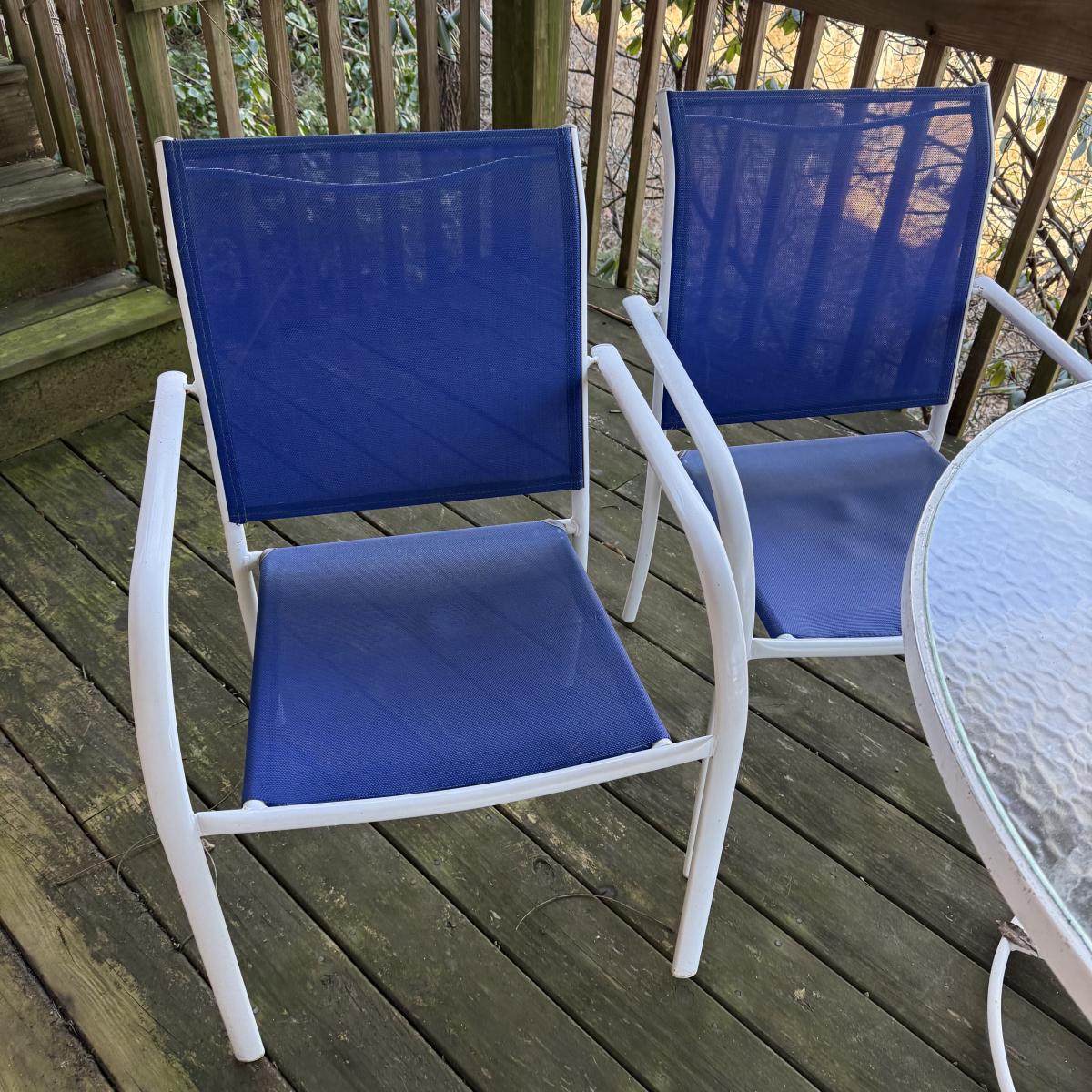 Woodard brand aluminum patio table with glass top comes with four aluminum chairs that have blue mesh fabric seats and backs. The table is 48”D x 27”H and the chairs are 23.5” x 21” x 34”H with a 17” seat height. The glass is not attached to the base. There is some wear to the white finish.