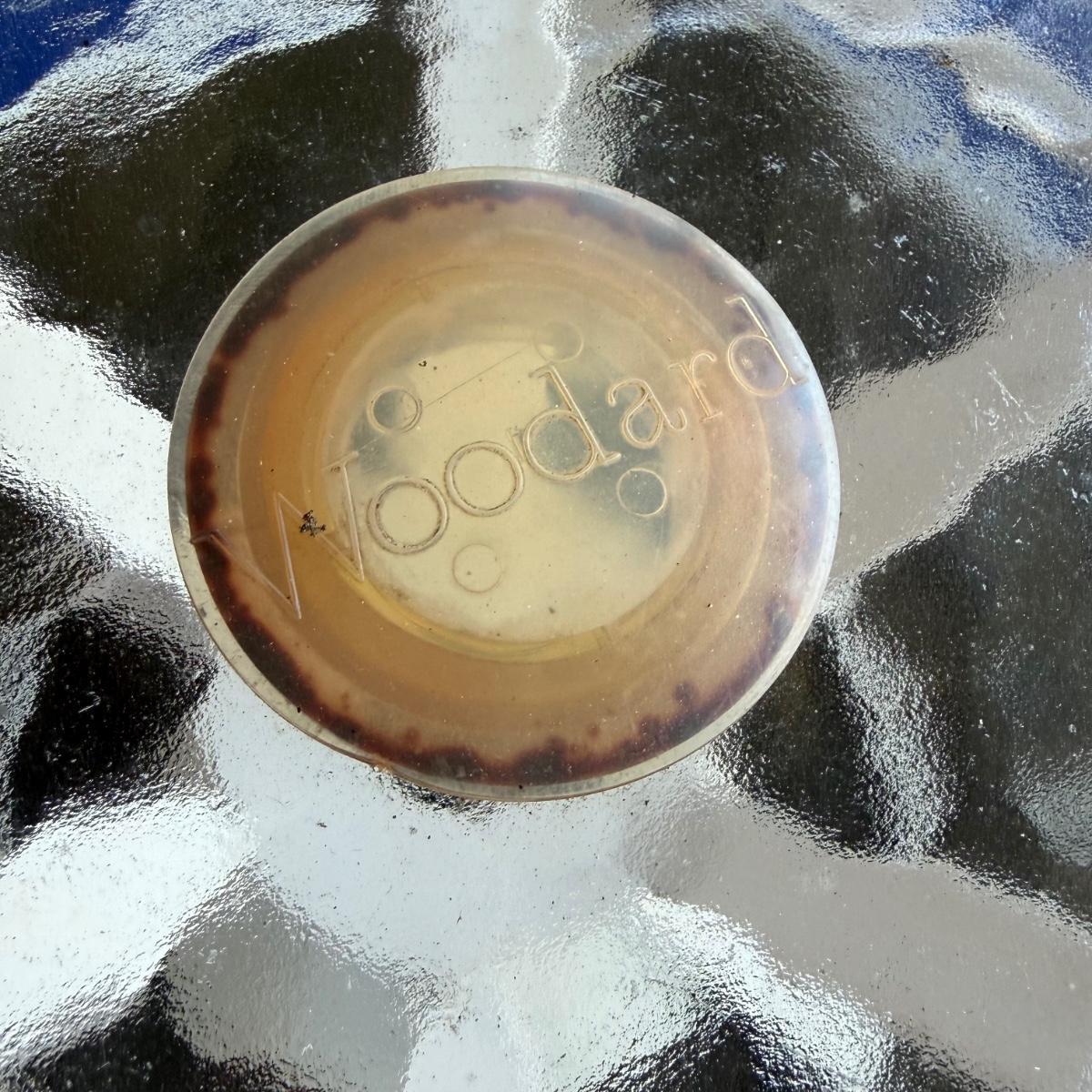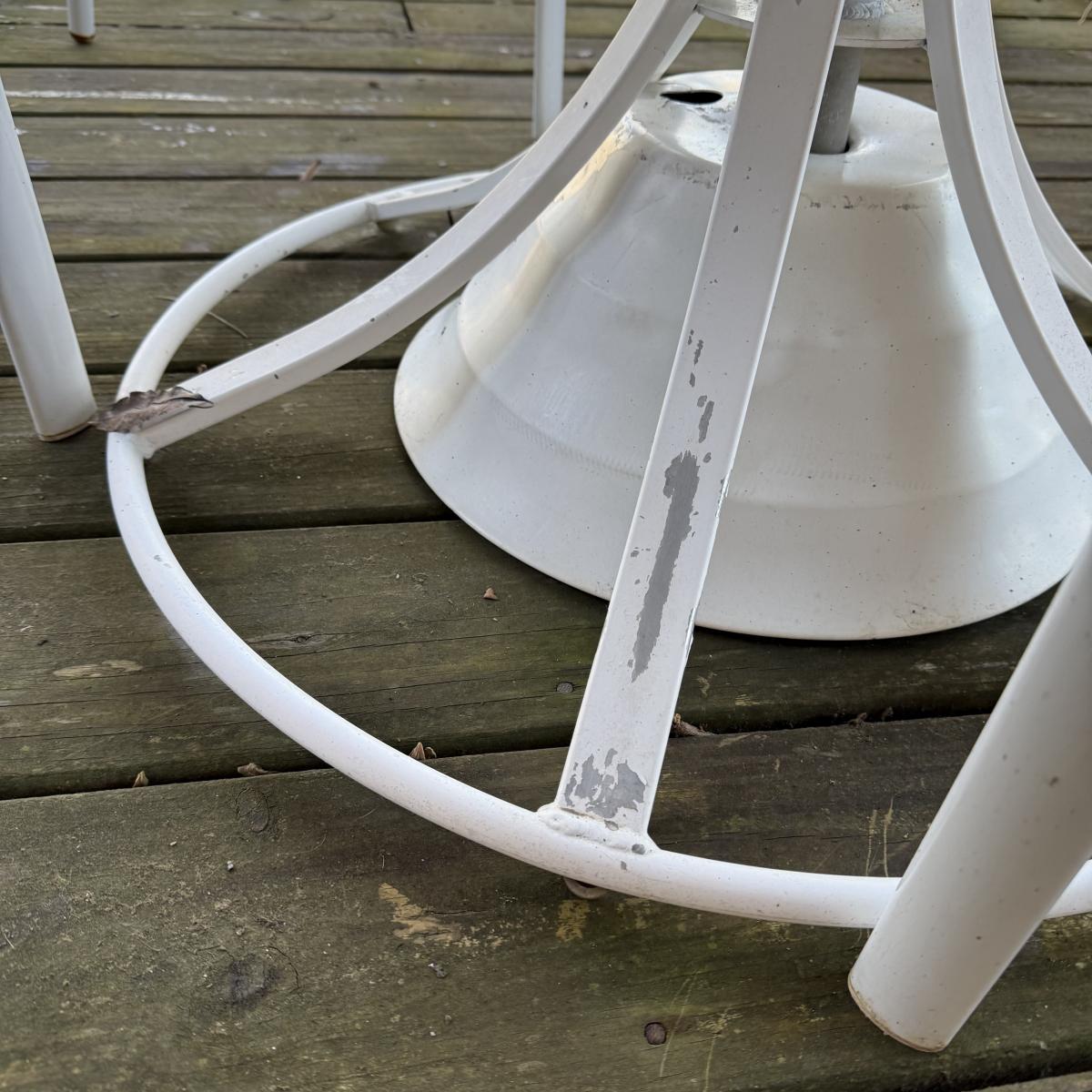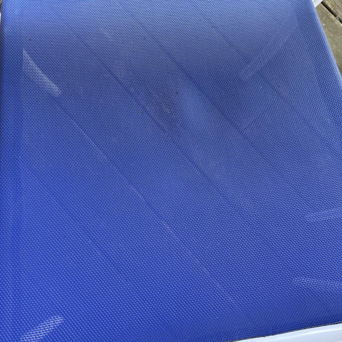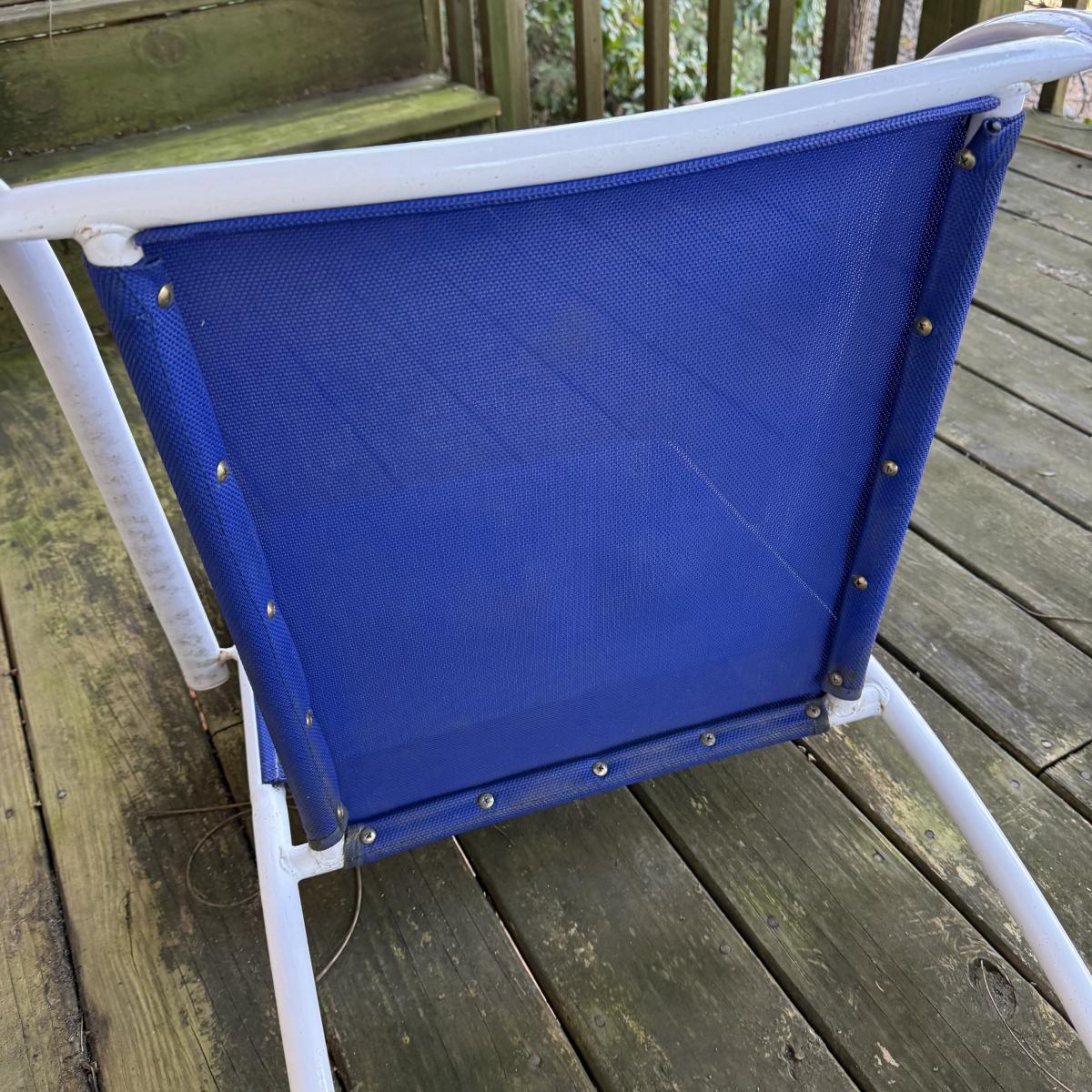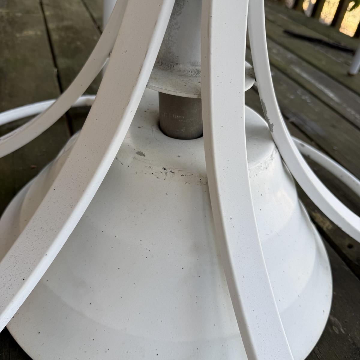 Woodard brand aluminum patio table with glass top comes with four aluminum chairs that have blue mesh fabric seats and backs. The table is 48”D x 27”H and the chairs are 23.5” x 21” x 34”H with a 17” seat height. The glass is not attached to the base. There is some wear to the white finish.