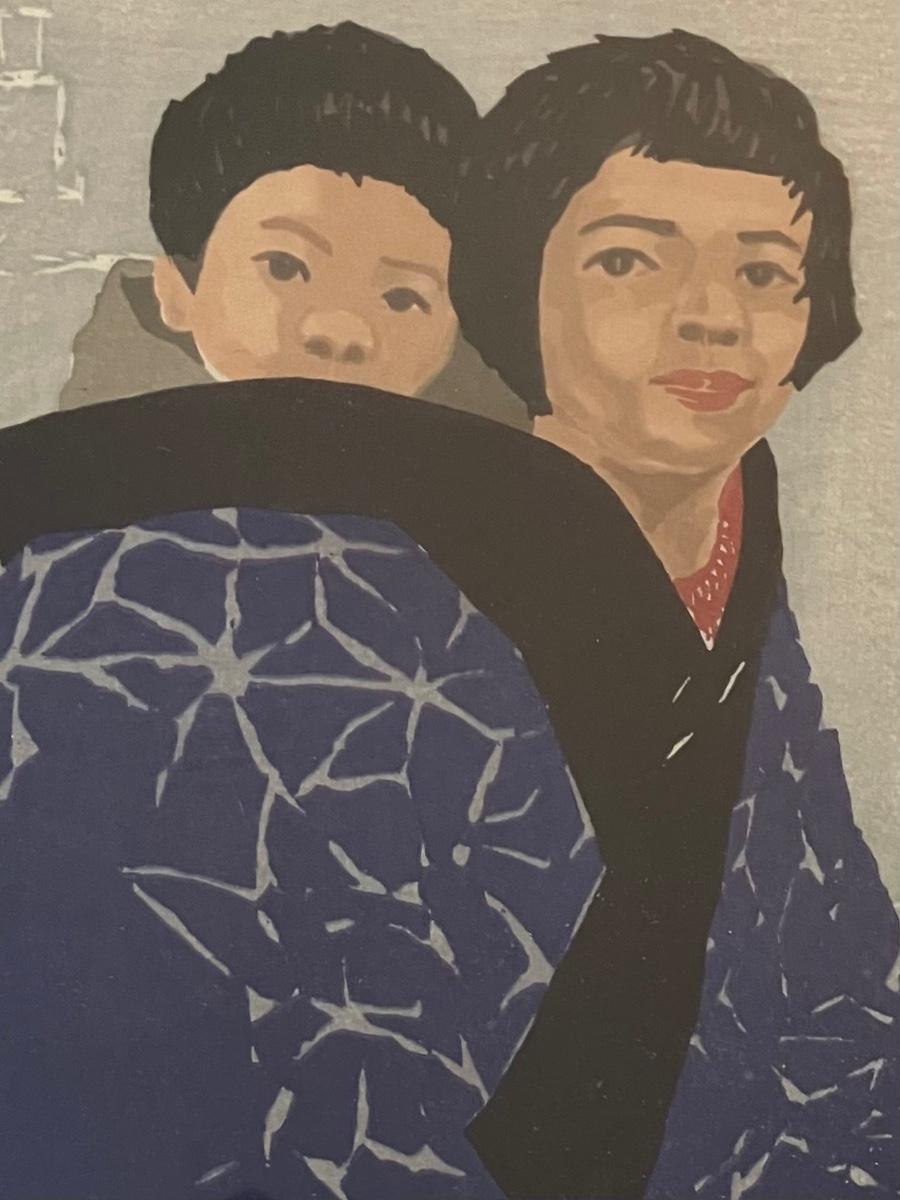This woodblock print, "Kyōdai" (姉弟, "Siblings") by Seiichiro Konishi (b. 1919), is a self-carved and self-printed Sosaku-hanga work, a hallmark of the Creative Print movement emphasizing artist autonomy. The image size (approximately 13 x 17 inches, or 33 x 43 cm) aligns with Konishi's typical oban tate-e format, and the visible signatures, seal, title, and edition number (e.g., 53/200 in documented examples) confirm it as part of a limited edition run of 200 impressions. Konishi's oeuvre focuses on Kyoto's architecture, sites, and human scenes, with this piece depicting a tender sibling moment—likely a sister carrying her brother—evoking cultural motifs of familial bonds.