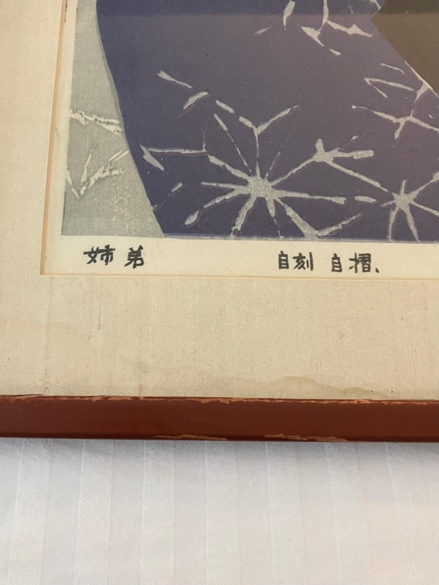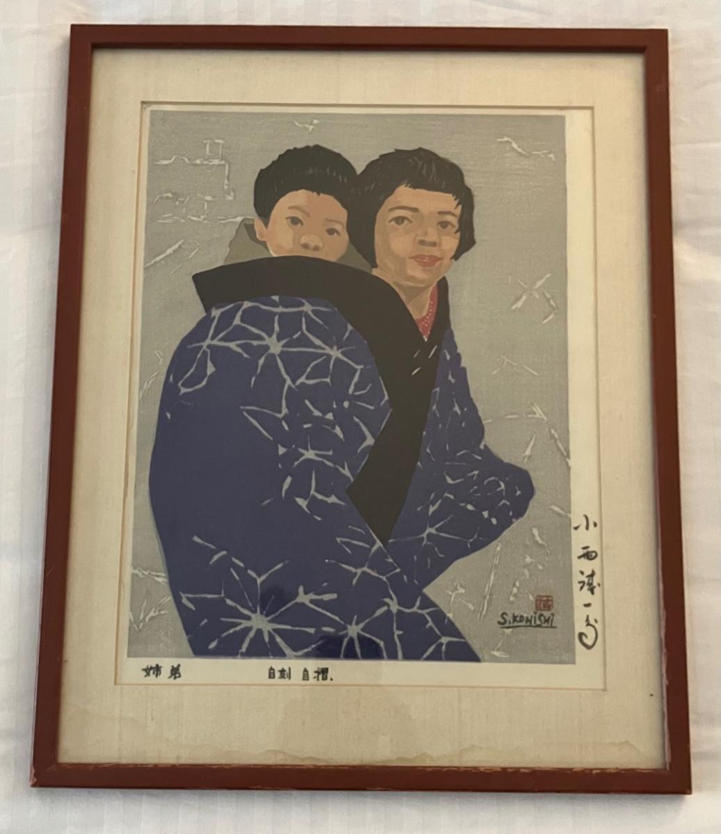 This woodblock print, "Kyōdai" (姉弟, "Siblings") by Seiichiro Konishi (b. 1919), is a self-carved and self-printed Sosaku-hanga work, a hallmark of the Creative Print movement emphasizing artist autonomy. The image size (approximately 13 x 17 inches, or 33 x 43 cm) aligns with Konishi's typical oban tate-e format, and the visible signatures, seal, title, and edition number (e.g., 53/200 in documented examples) confirm it as part of a limited edition run of 200 impressions. Konishi's oeuvre focuses on Kyoto's architecture, sites, and human scenes, with this piece depicting a tender sibling moment—likely a sister carrying her brother—evoking cultural motifs of familial bonds.