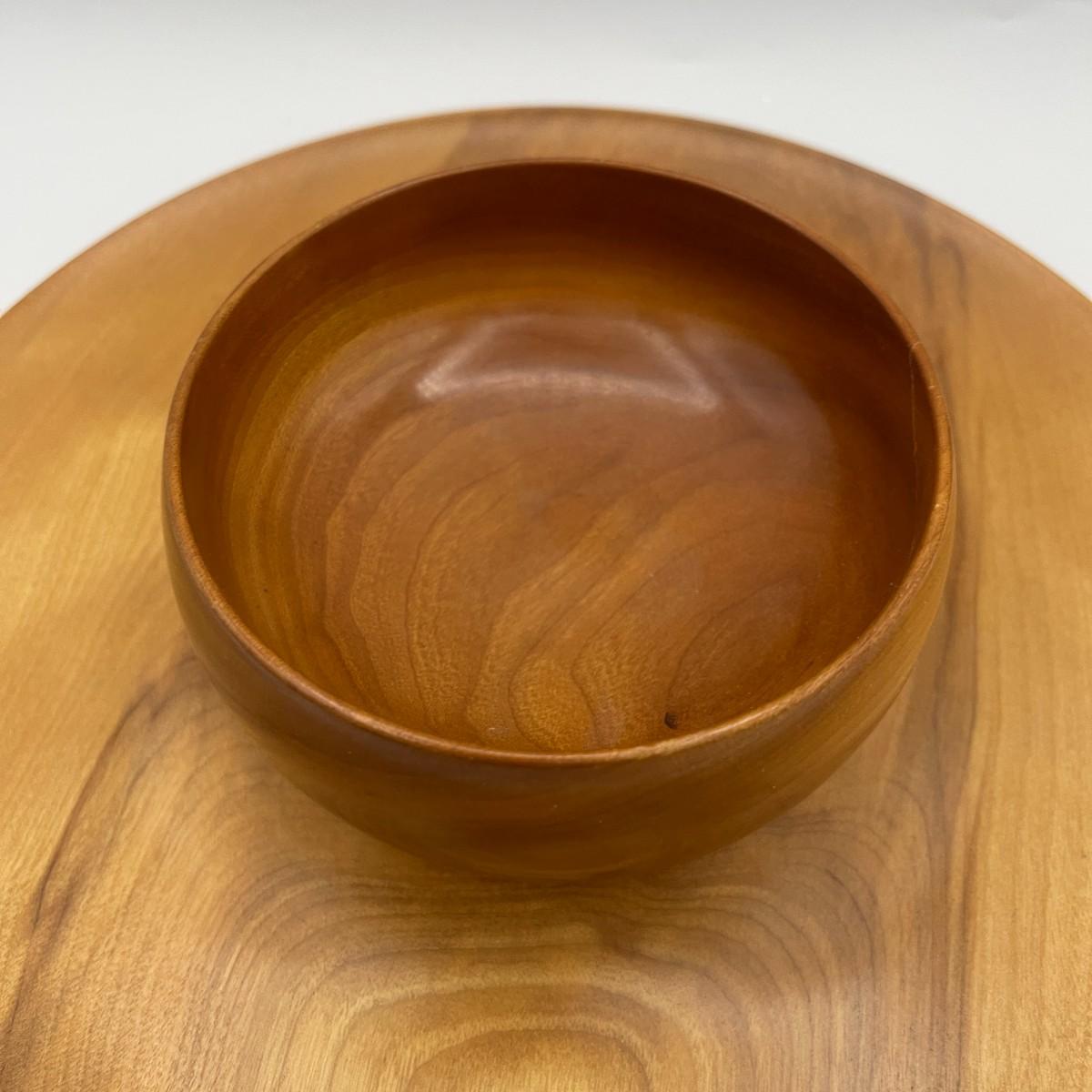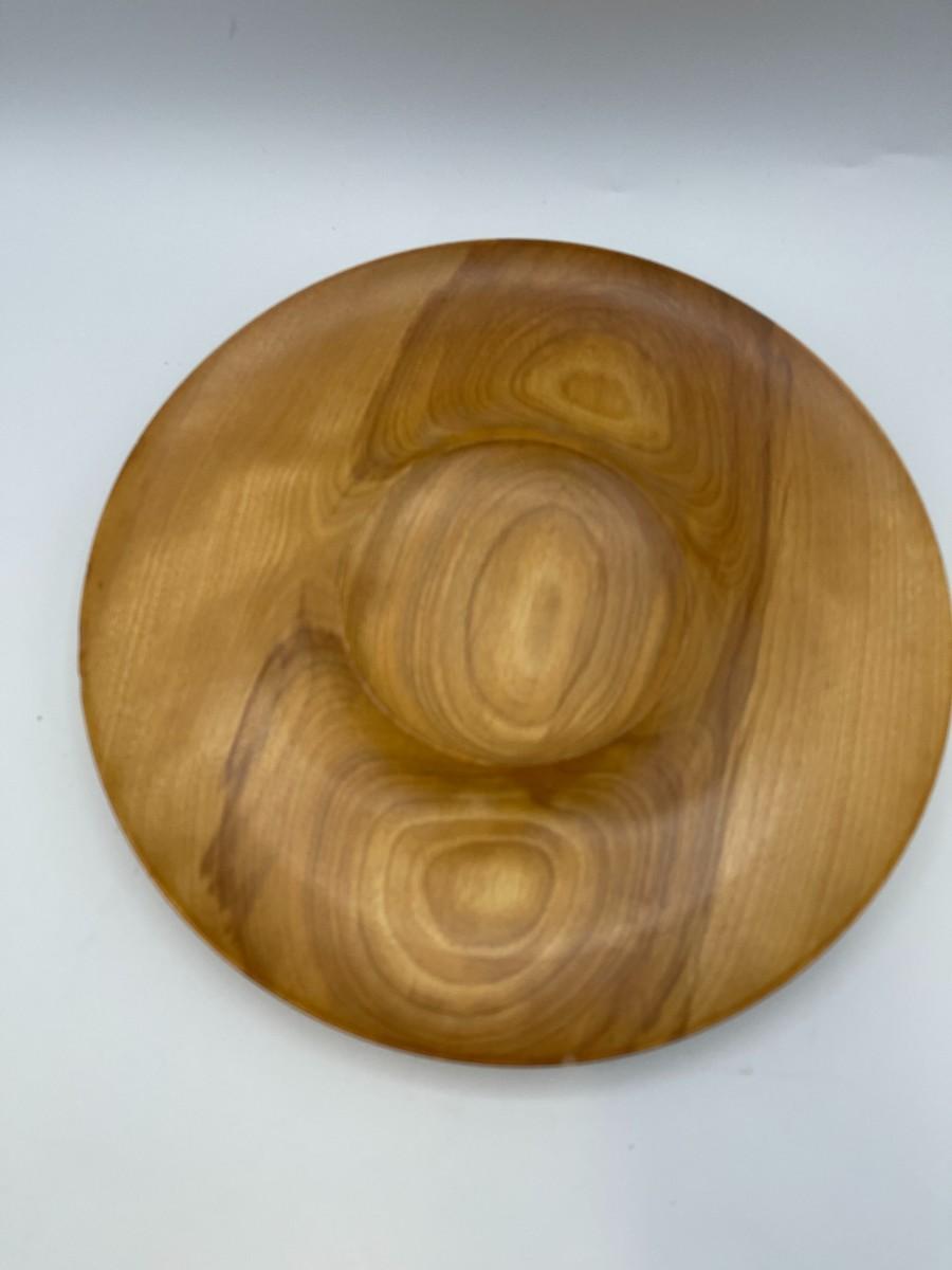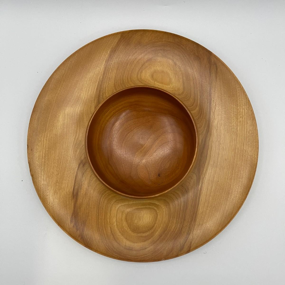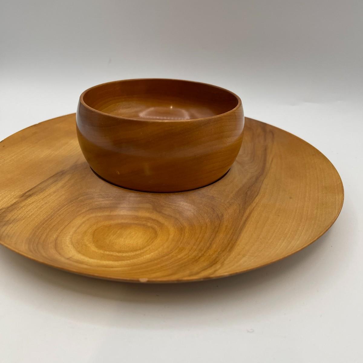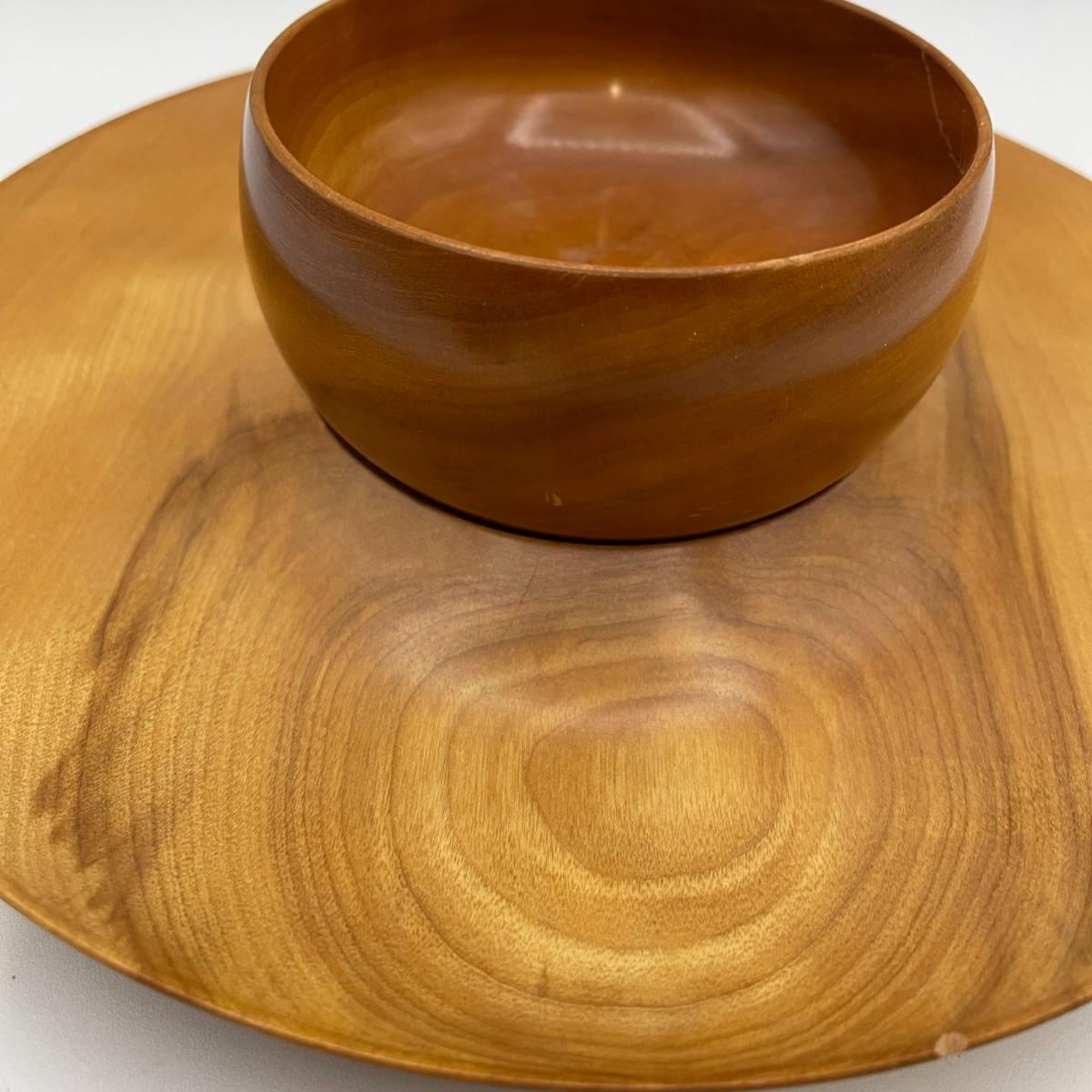 Nicely handmade, hand turned, MCM chip & dip set. Will you find other uses for this? A centerpiece for flowers & candles, perhaps? Birch wood. Good condition, one small nick in the larger platter, please view photos carefully to see it. Chip platter: 10" Diameter -- Dip bowl: 4" Diameter. # 718