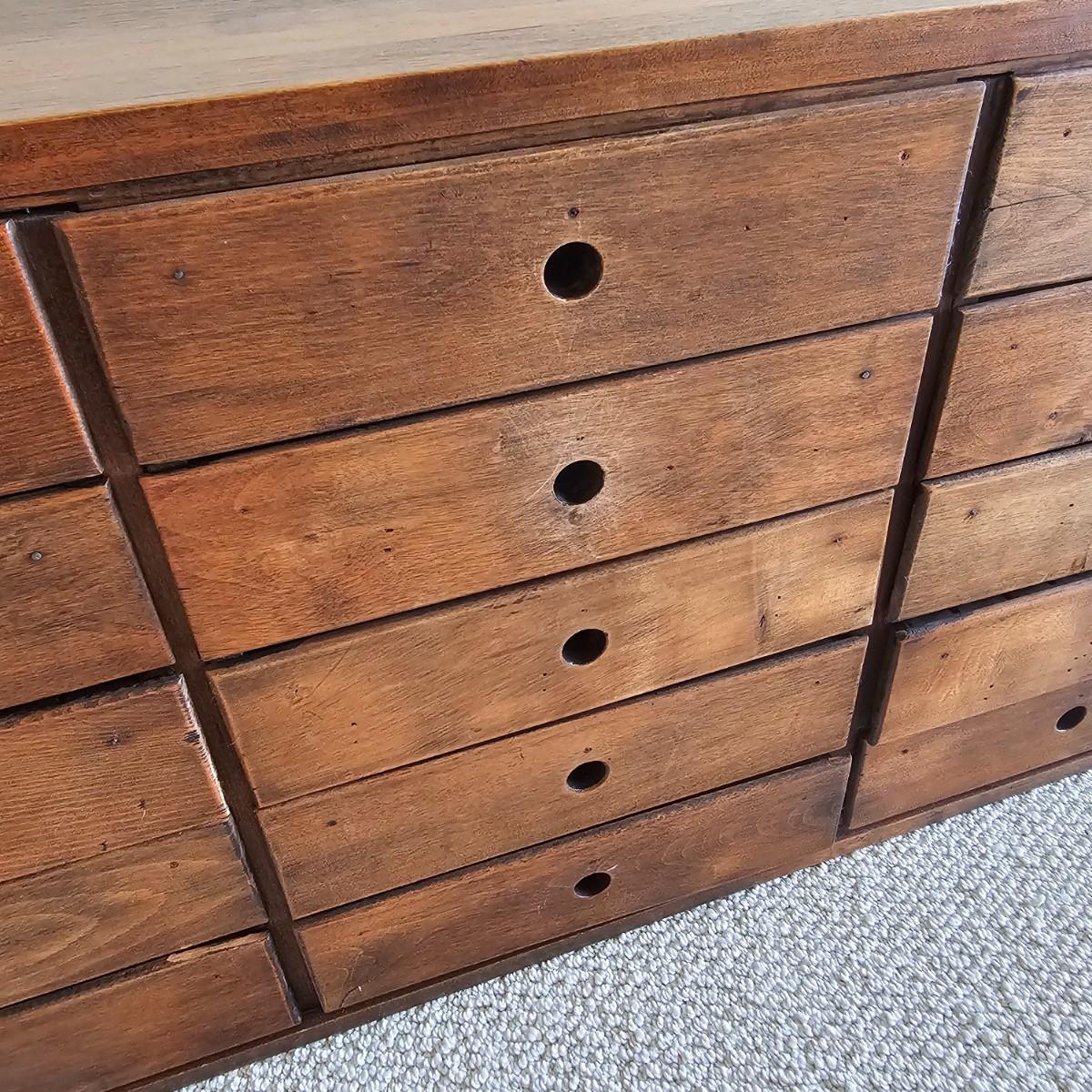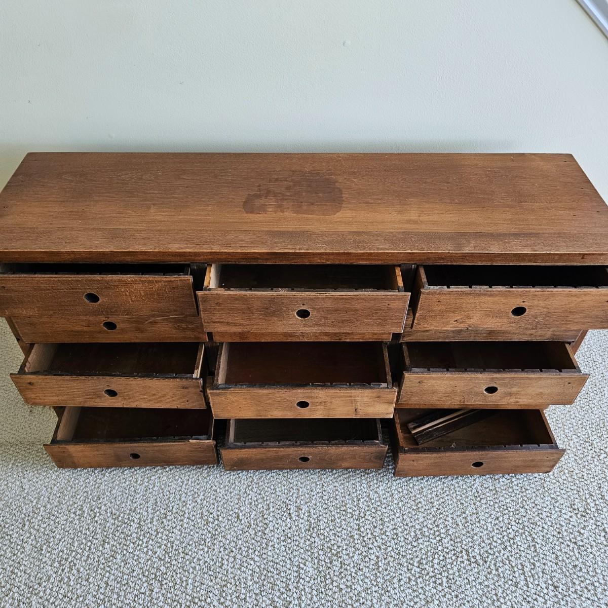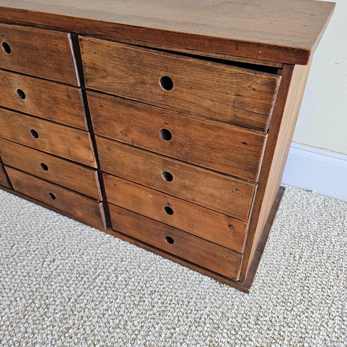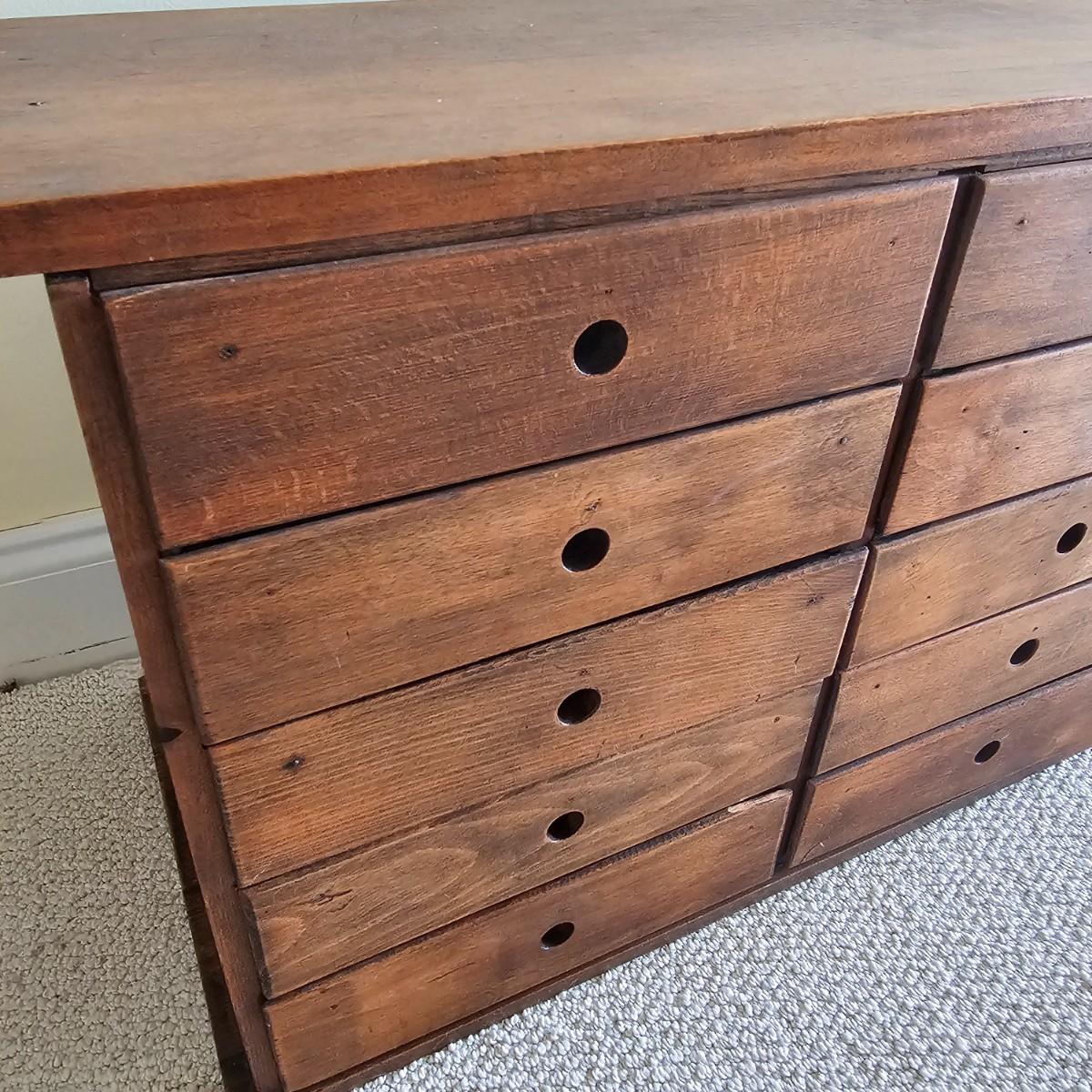 Vintage Apothecary cabinet with 15 drawers. Each drawer has finger pull opening. Cabinet is solid wood, measures 13" x 36" x 17.5"H. Back to cabinet is loose, has been taped in place, will need some repair. See photos for details. Local pickup only.