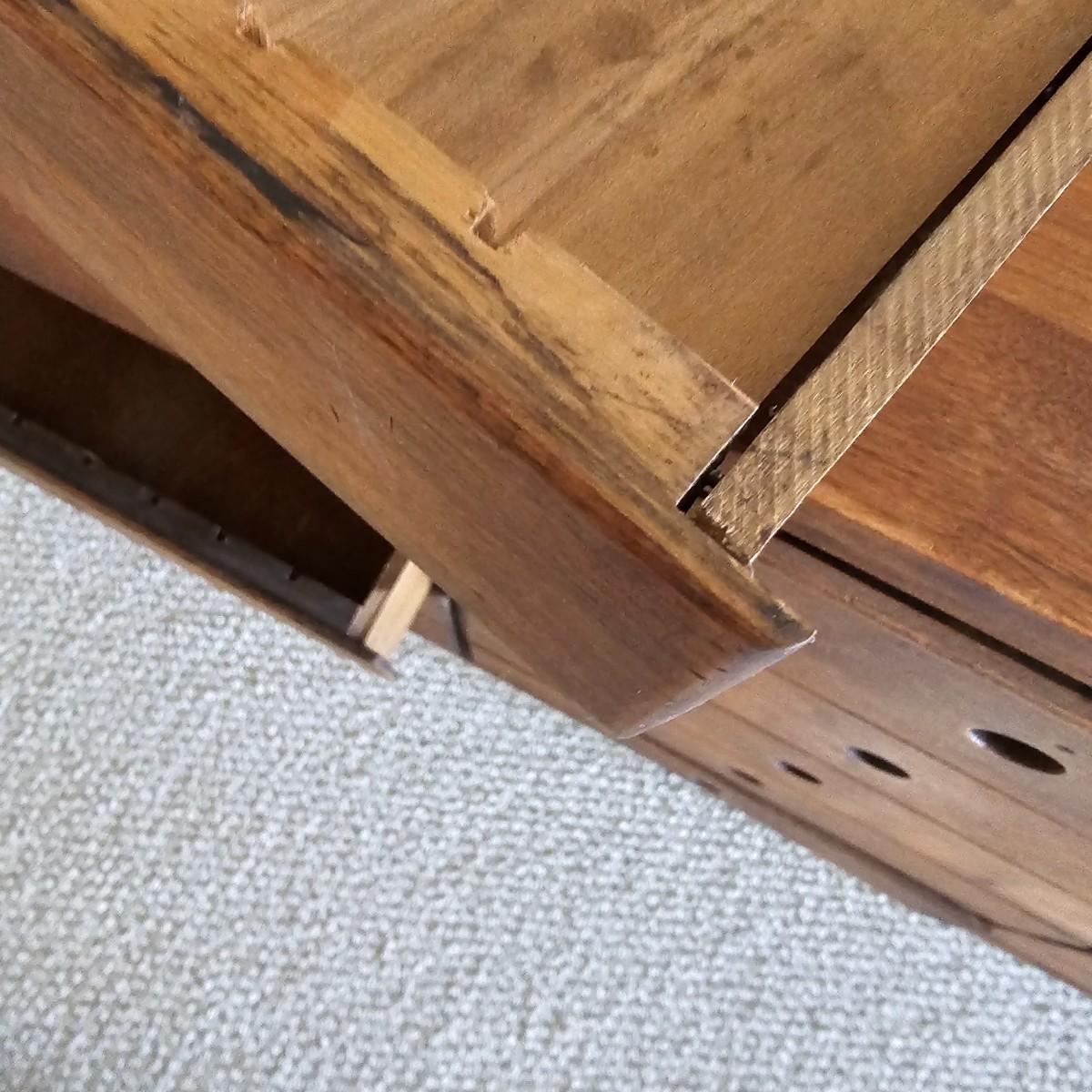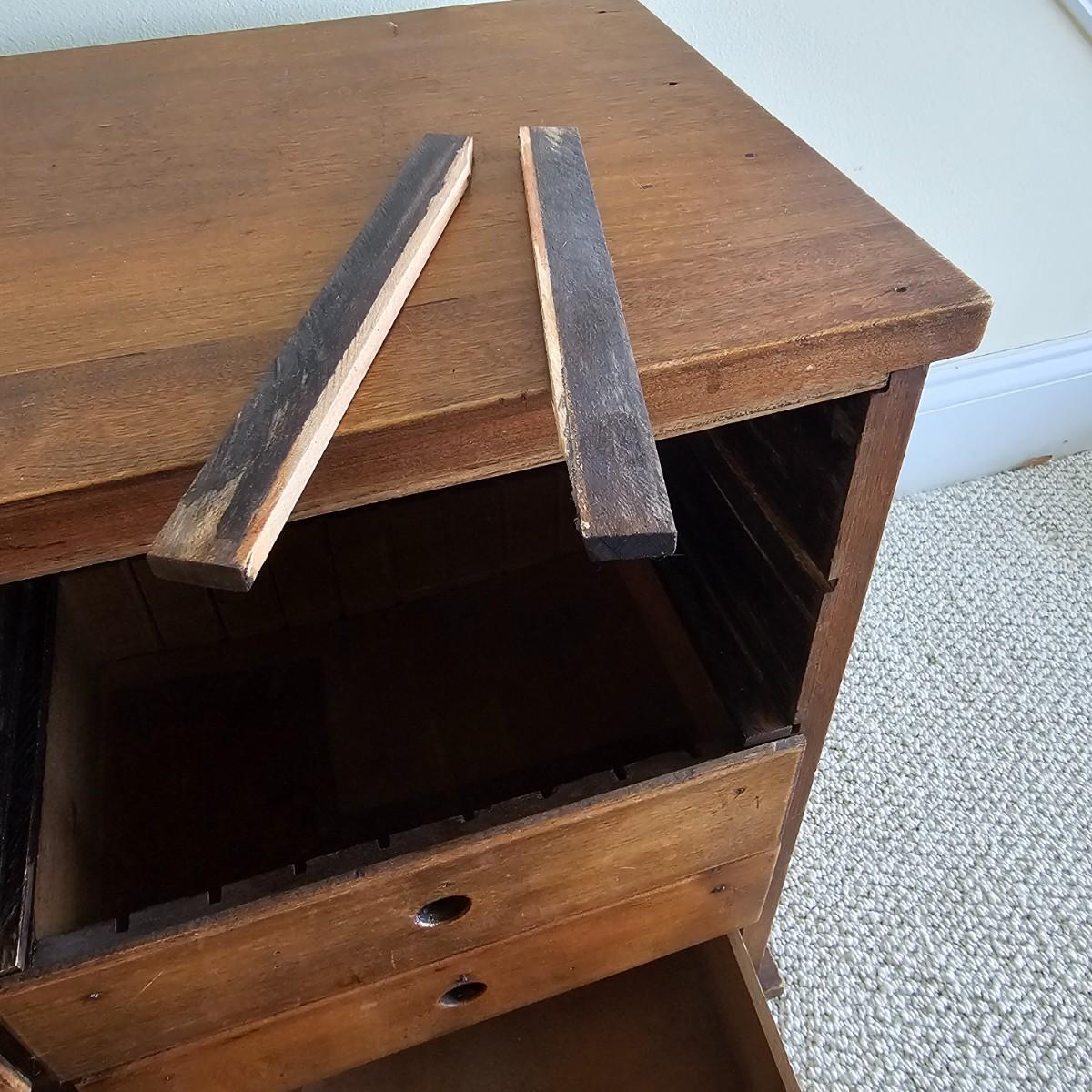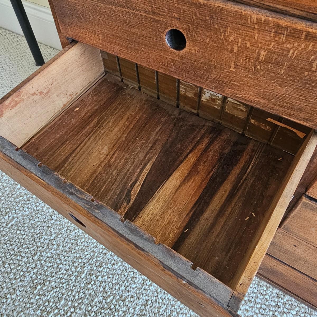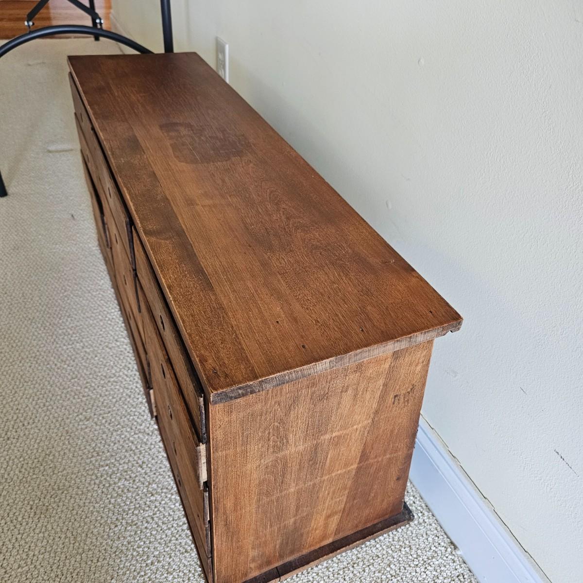 Vintage Apothecary cabinet with 15 drawers. Each drawer has finger pull opening. Cabinet is solid wood, measures 13" x 36" x 17.5"H. Back to cabinet is loose, has been taped in place, will need some repair. See photos for details. Local pickup only.