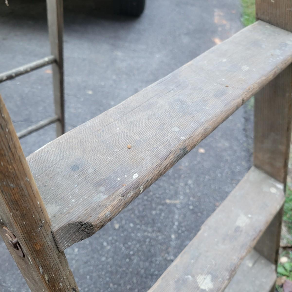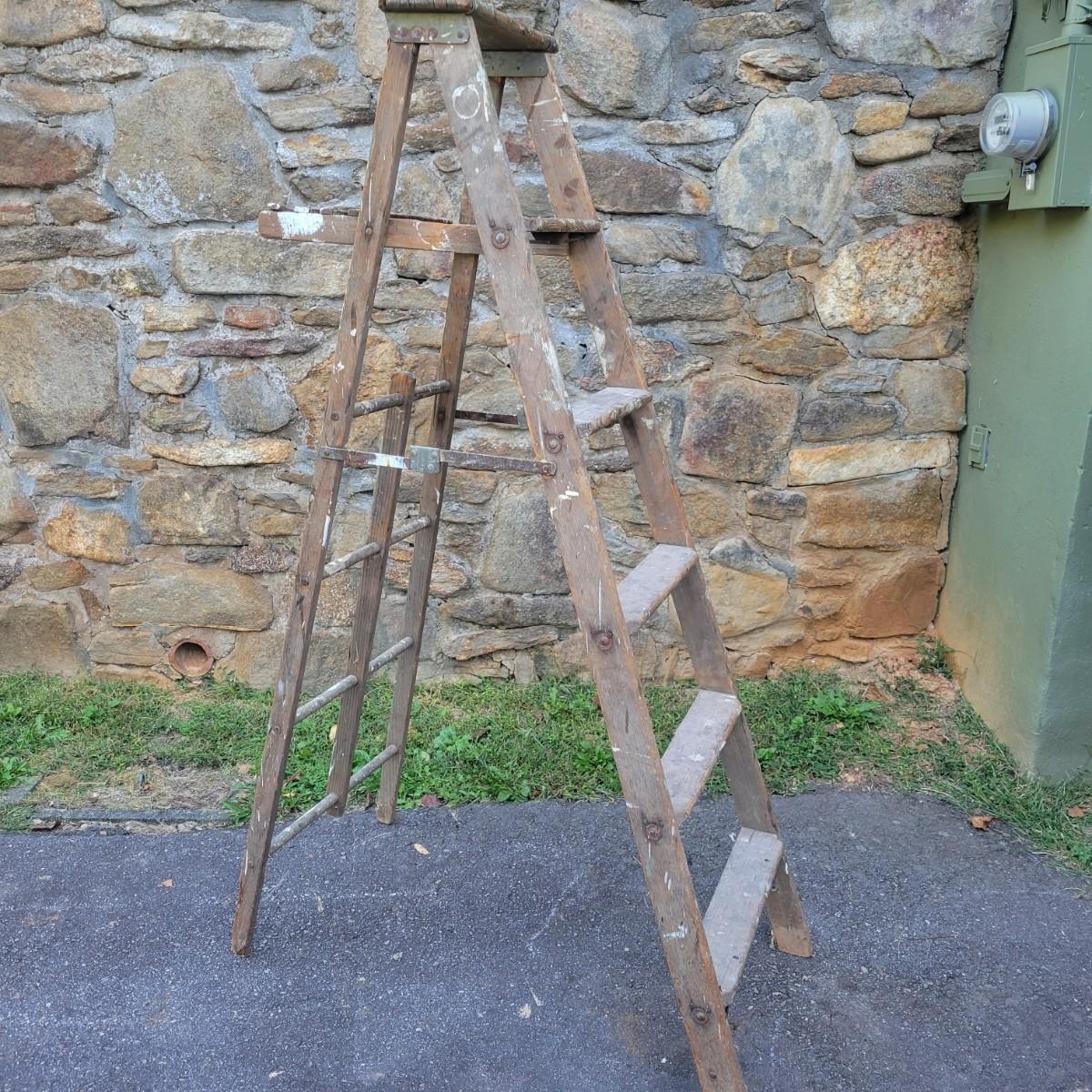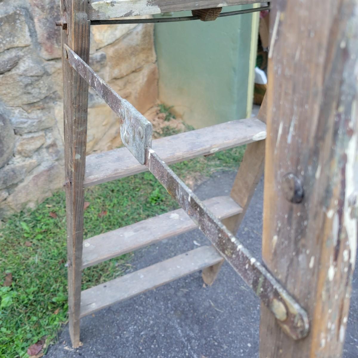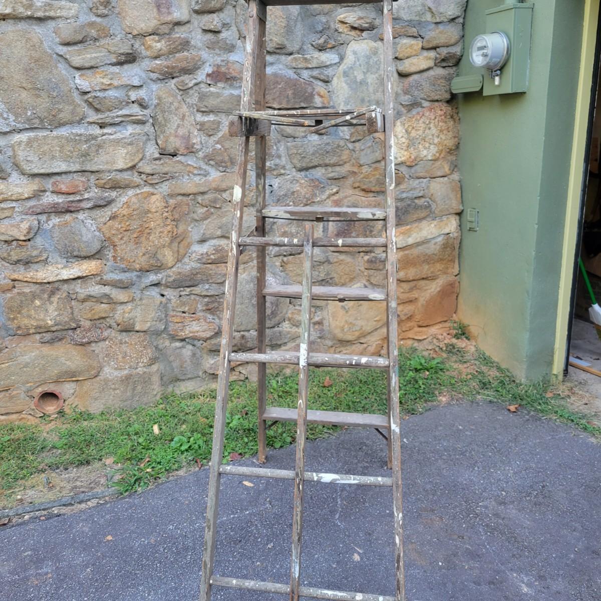 An older wooden A frame ladder in fair condition with some notable damage. Left side feet are missing some wood, the tool platform has a broken slat and the folding hardware is a bit loose. This would however make a great decor piece, plant stand or something of that nature. Measures approximately 17.5" x 42.5" x 67.5" Local pickup only