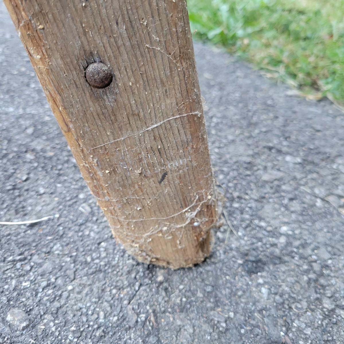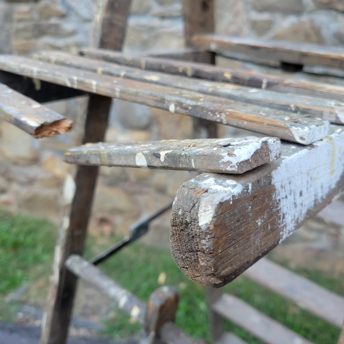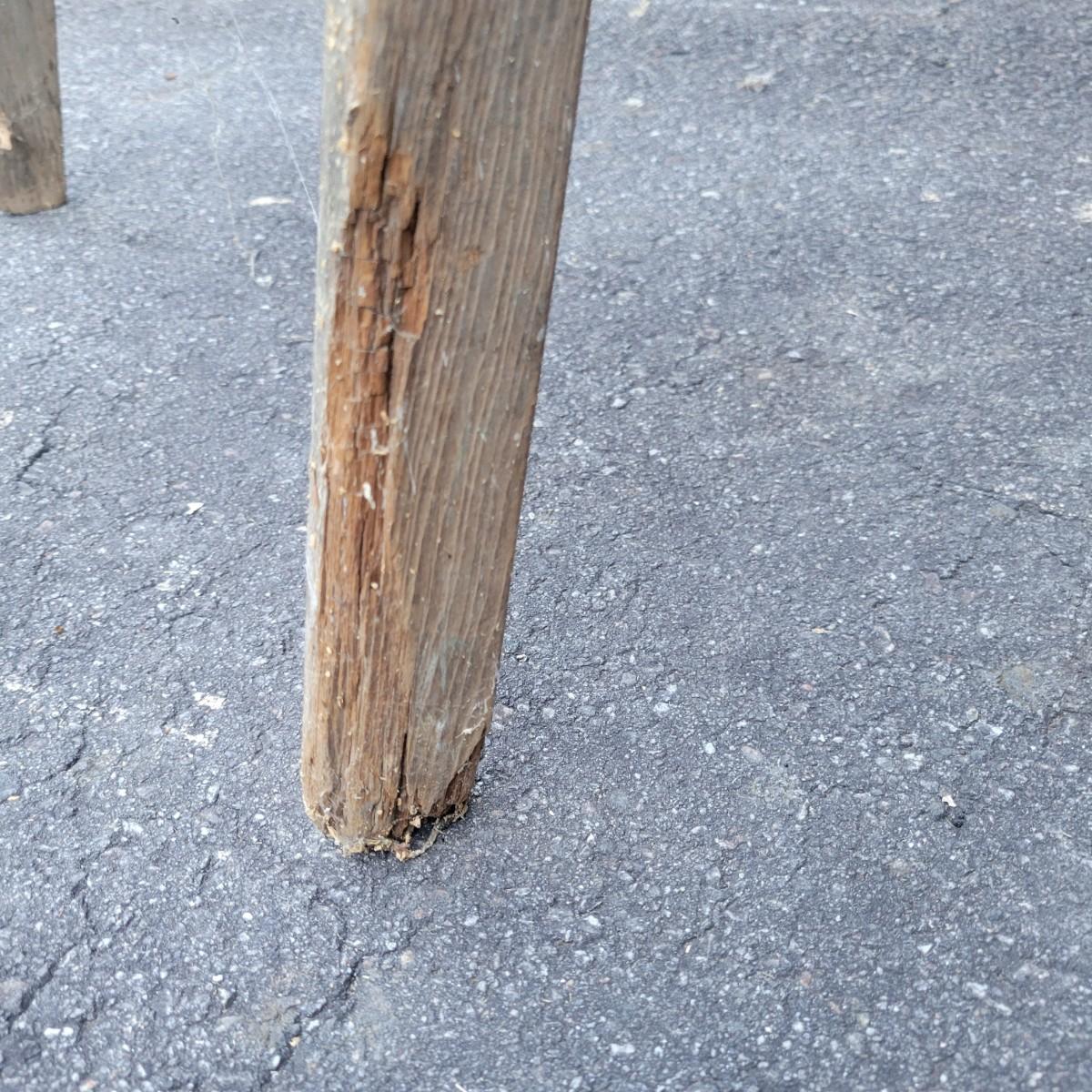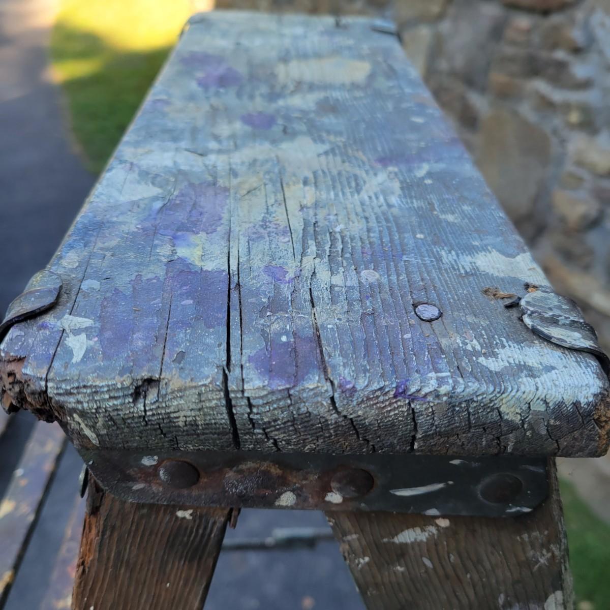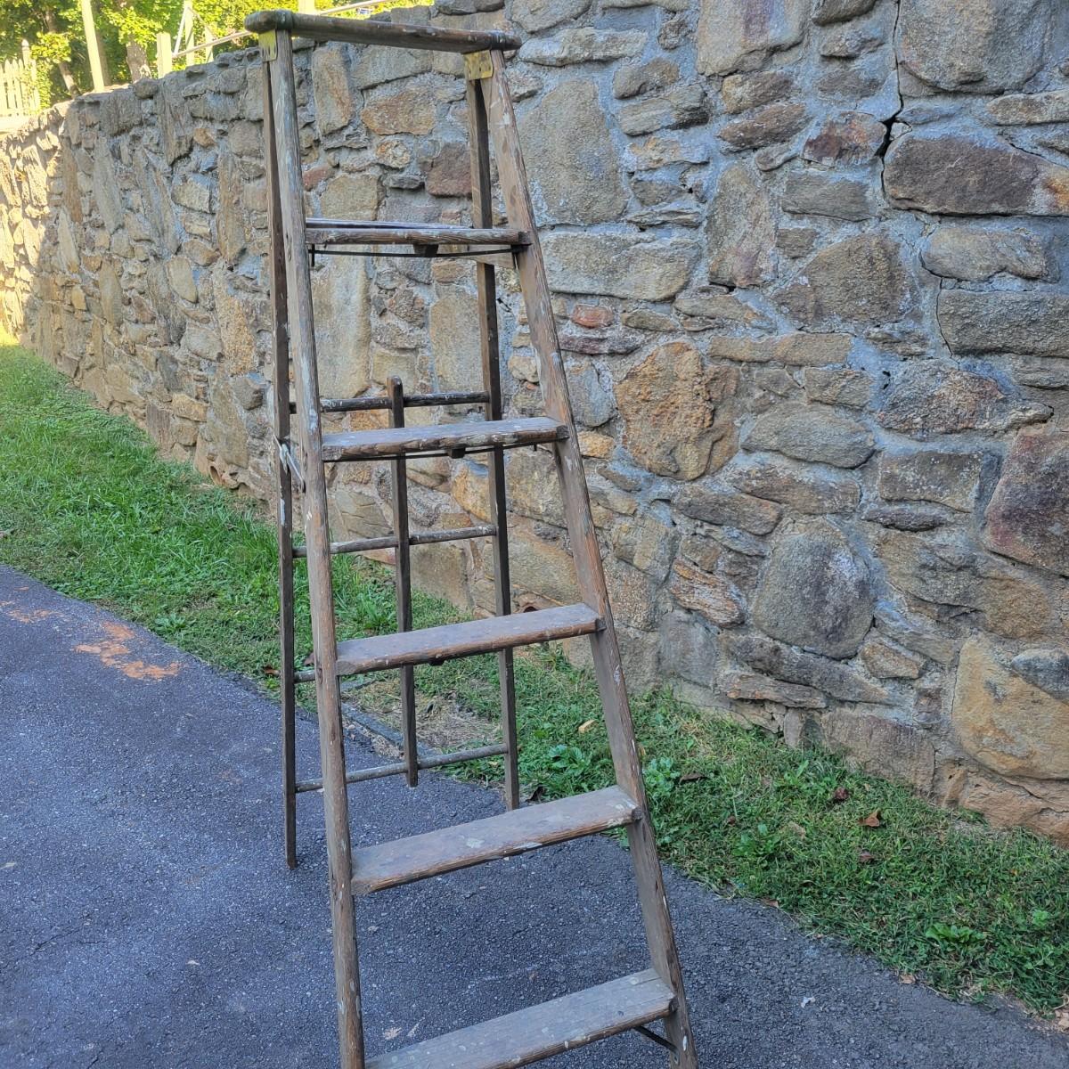 An older wooden A frame ladder in fair condition with some notable damage. Left side feet are missing some wood, the tool platform has a broken slat and the folding hardware is a bit loose. This would however make a great decor piece, plant stand or something of that nature. Measures approximately 17.5" x 42.5" x 67.5" Local pickup only