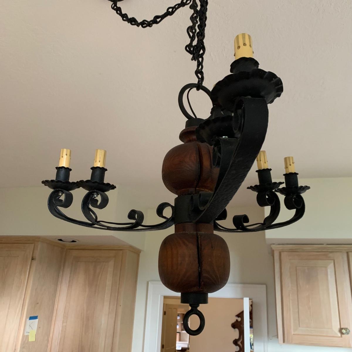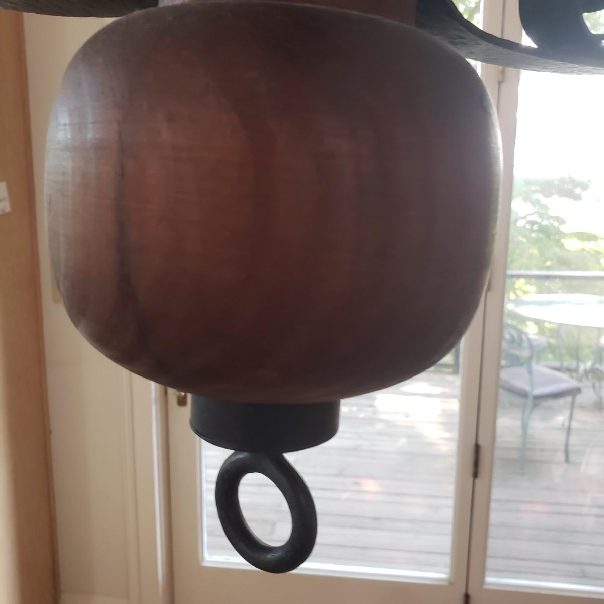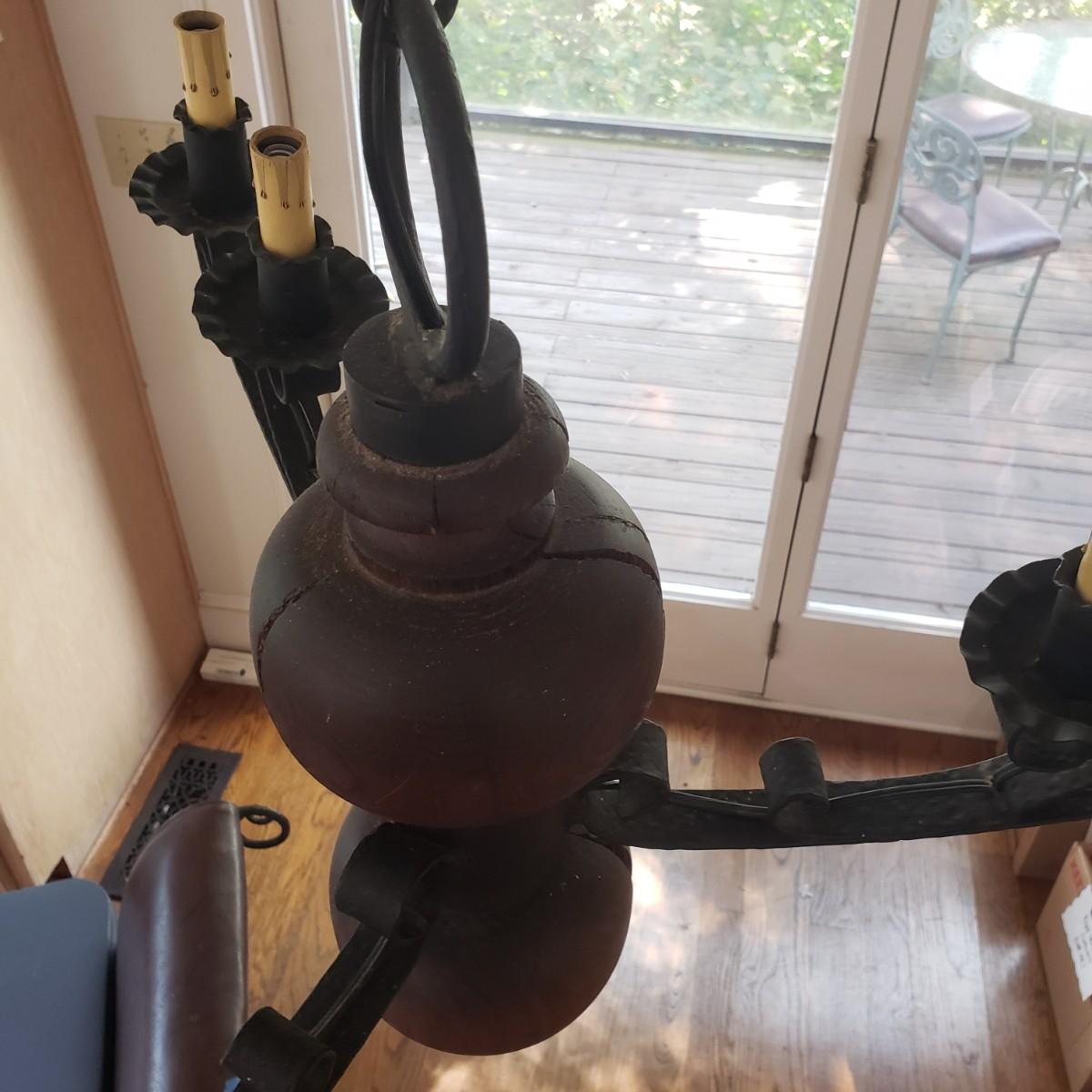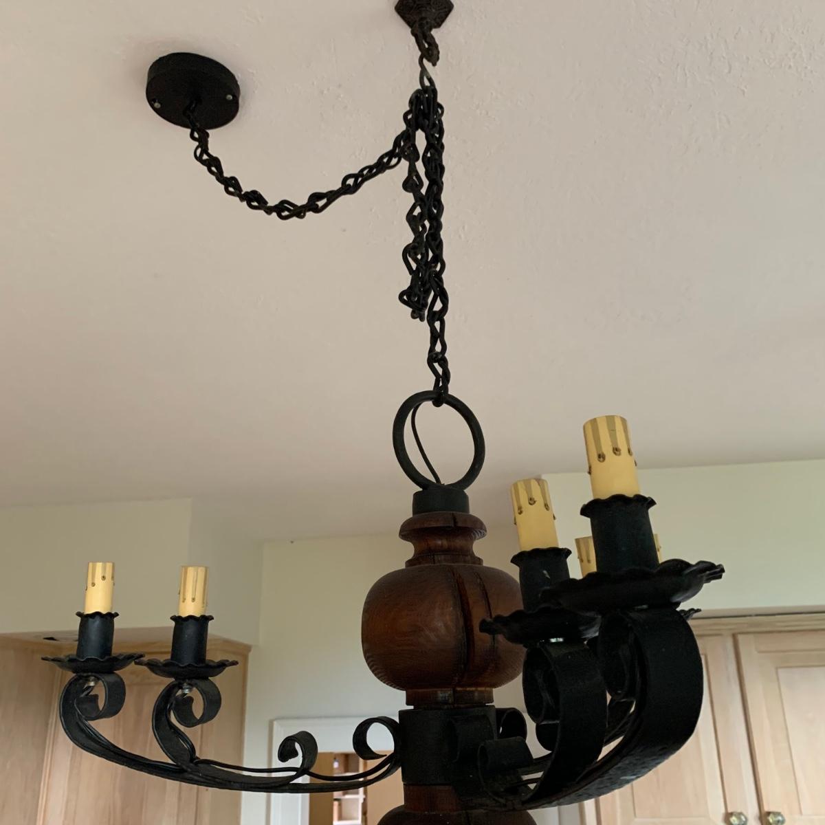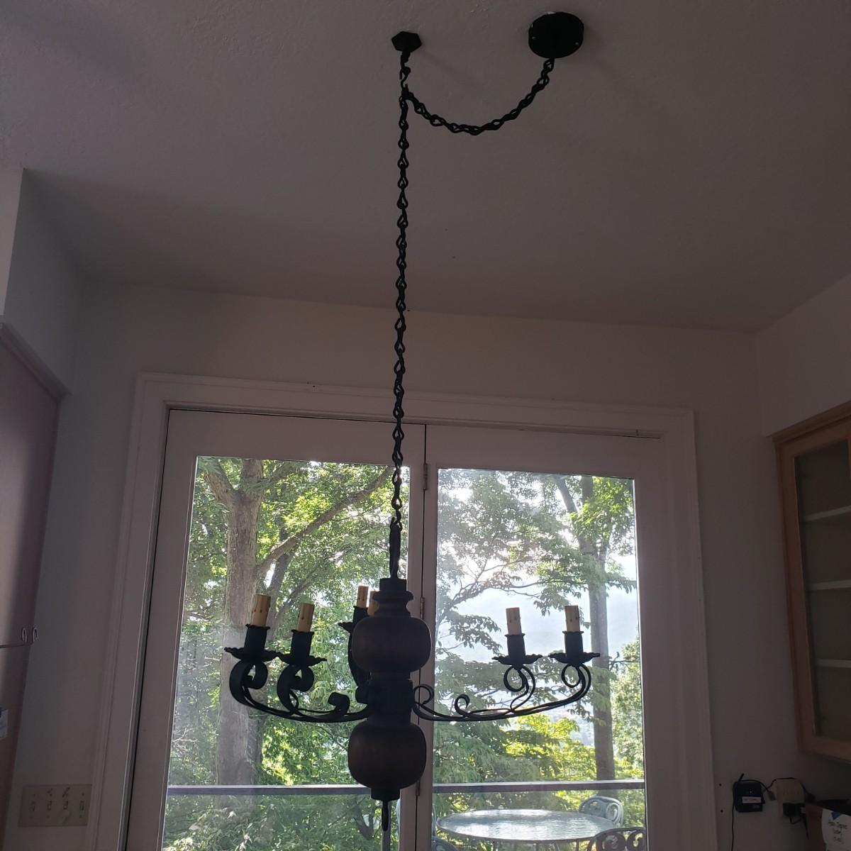 This chain link to a wooden base chandelier has three metal arms with two candle like light fixtures on each arm