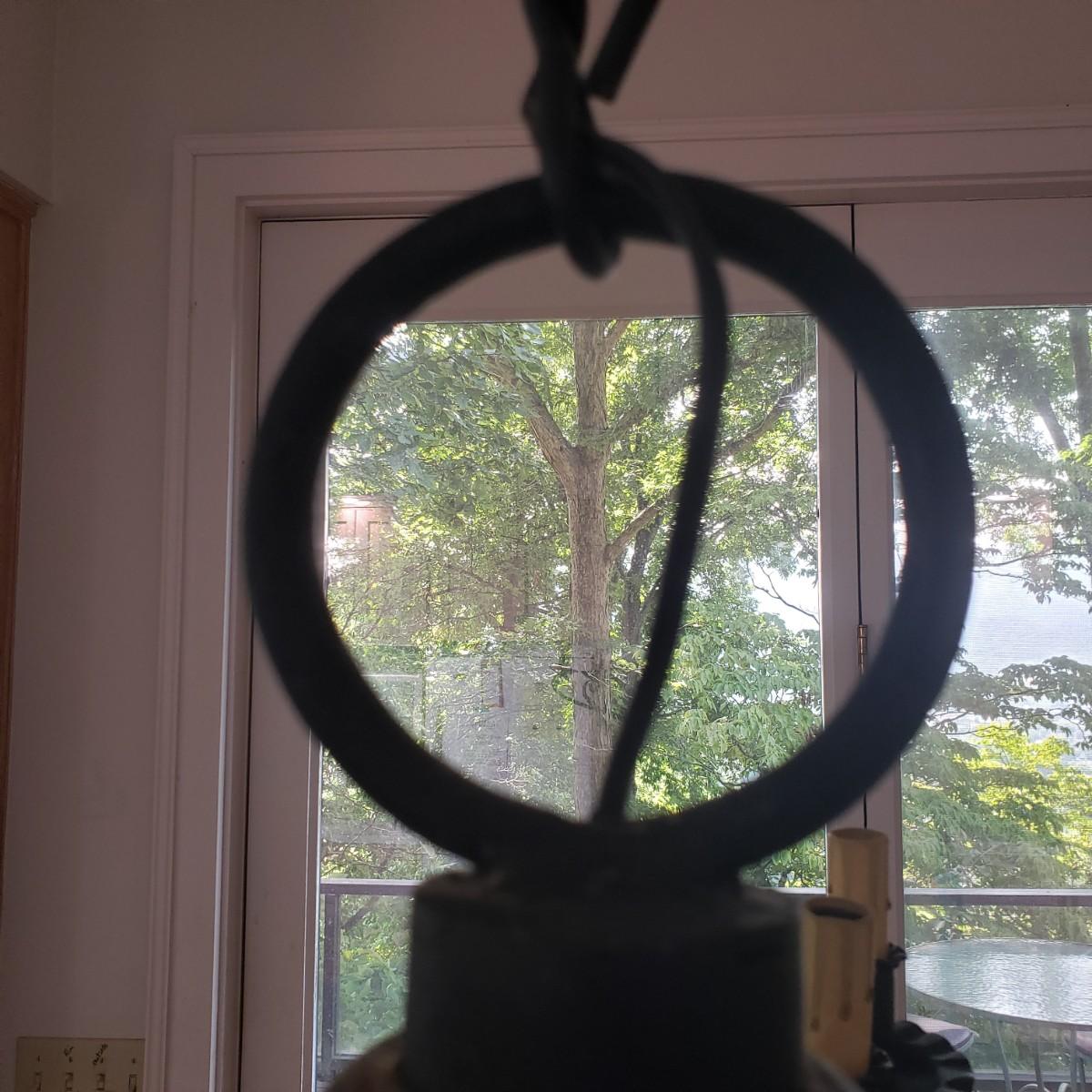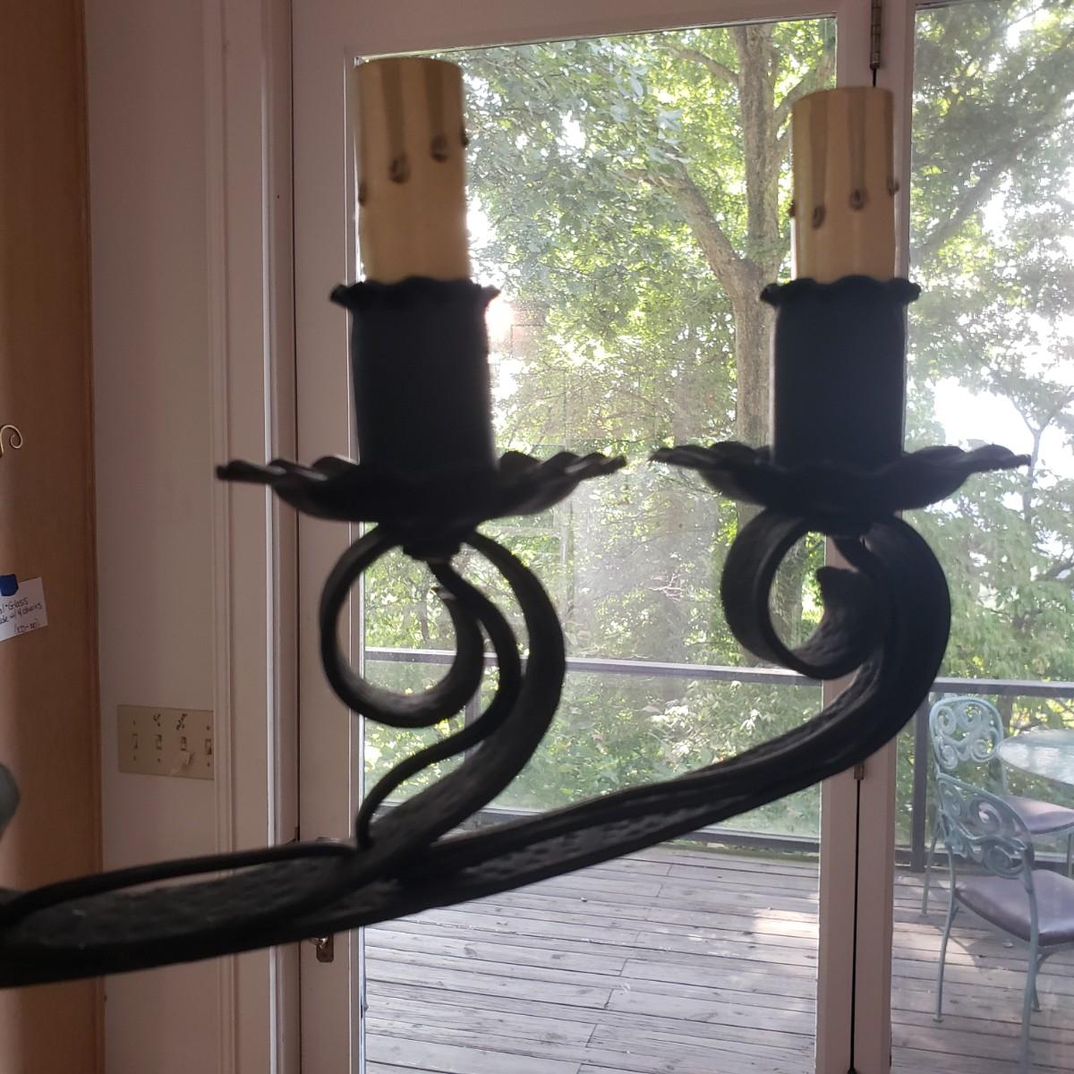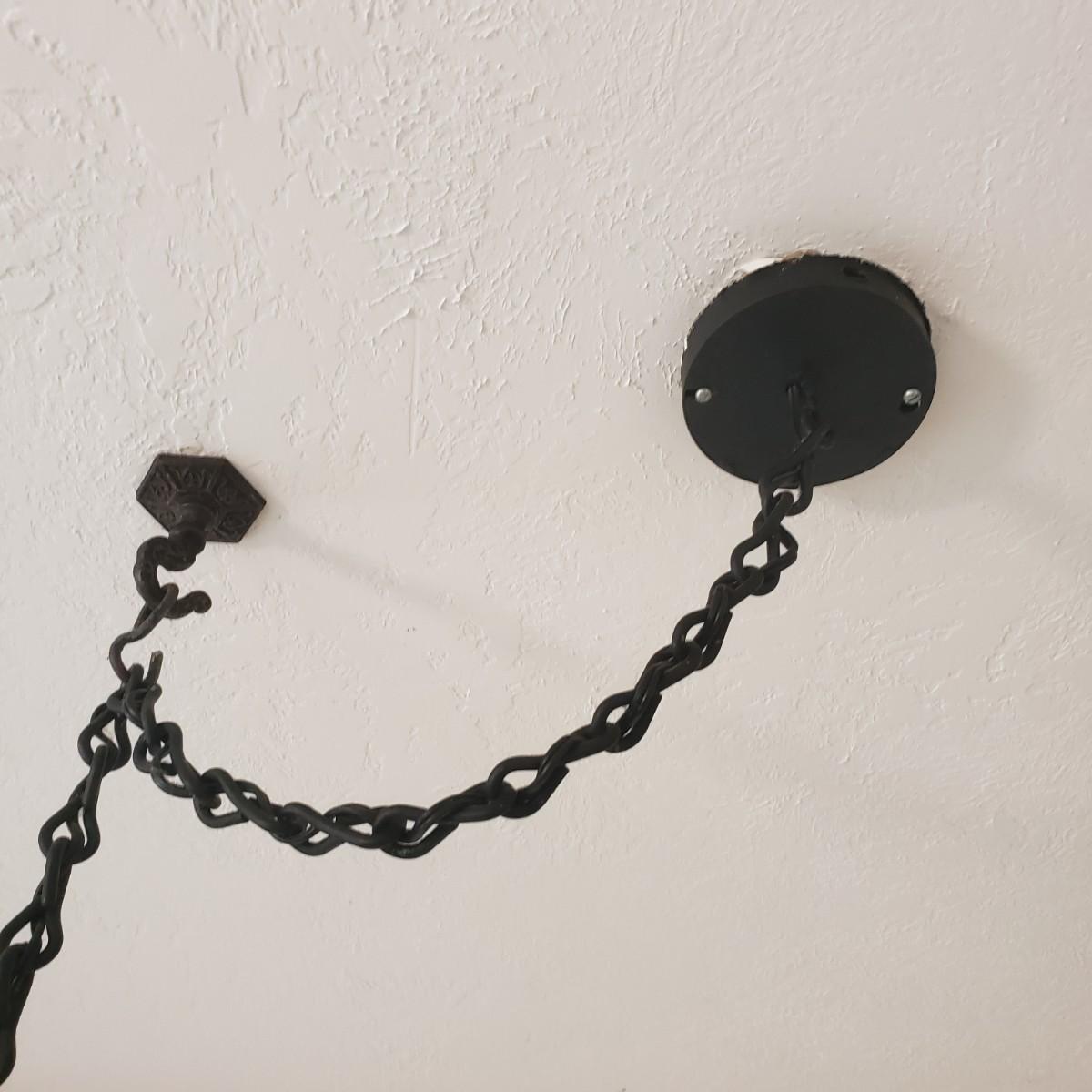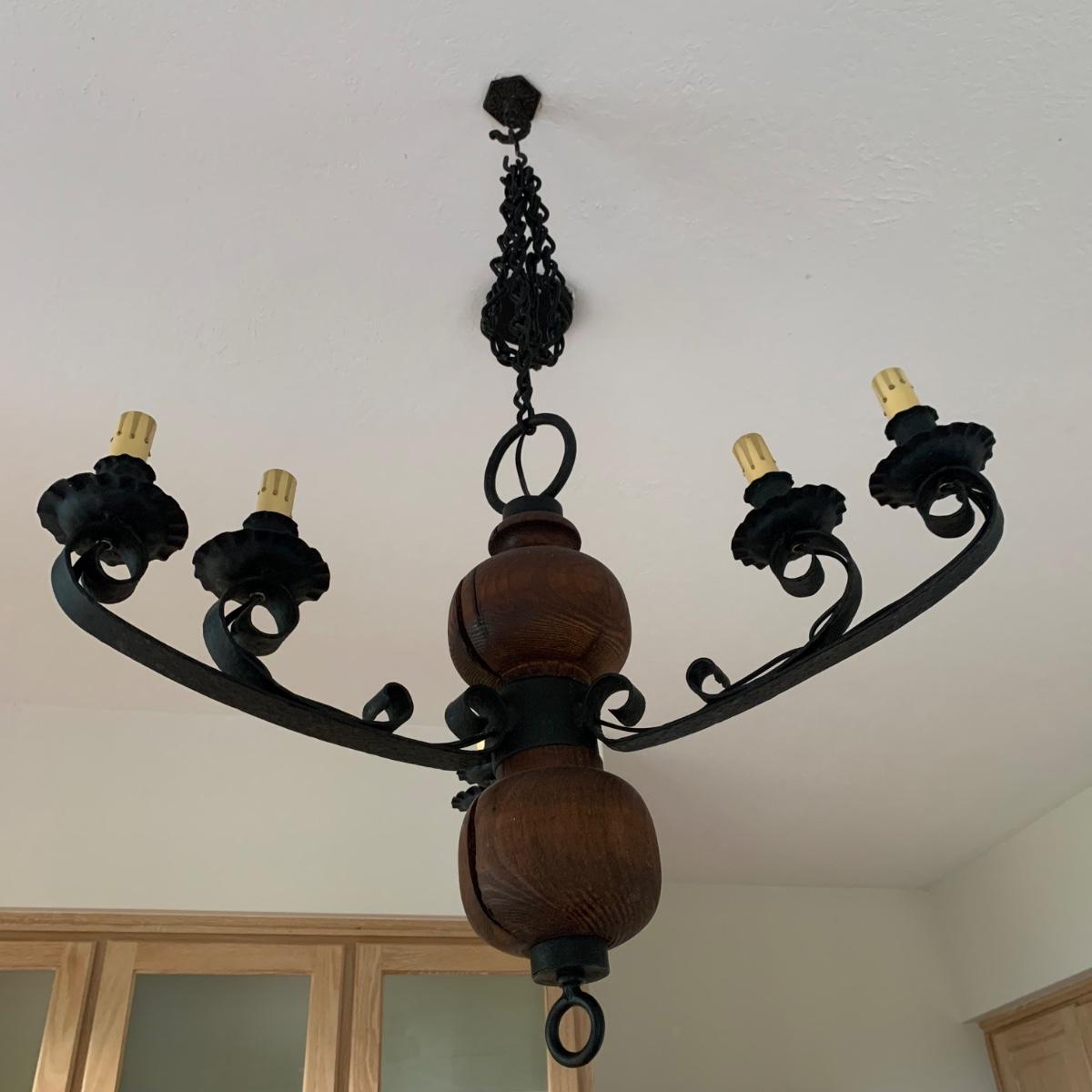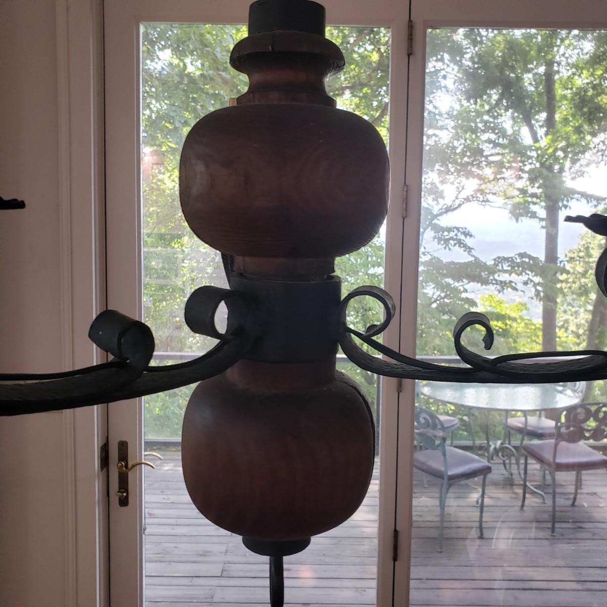 This chain link to a wooden base chandelier has three metal arms with two candle like light fixtures on each arm