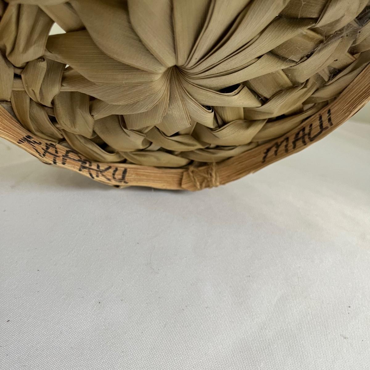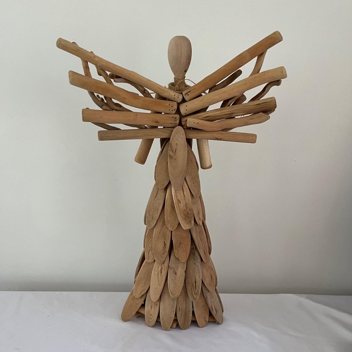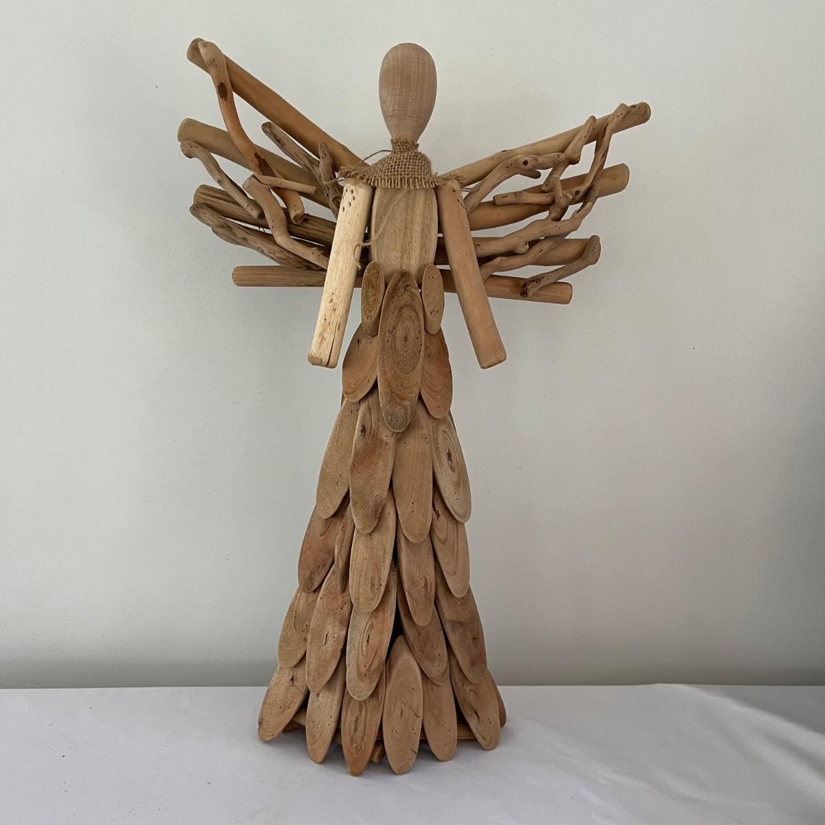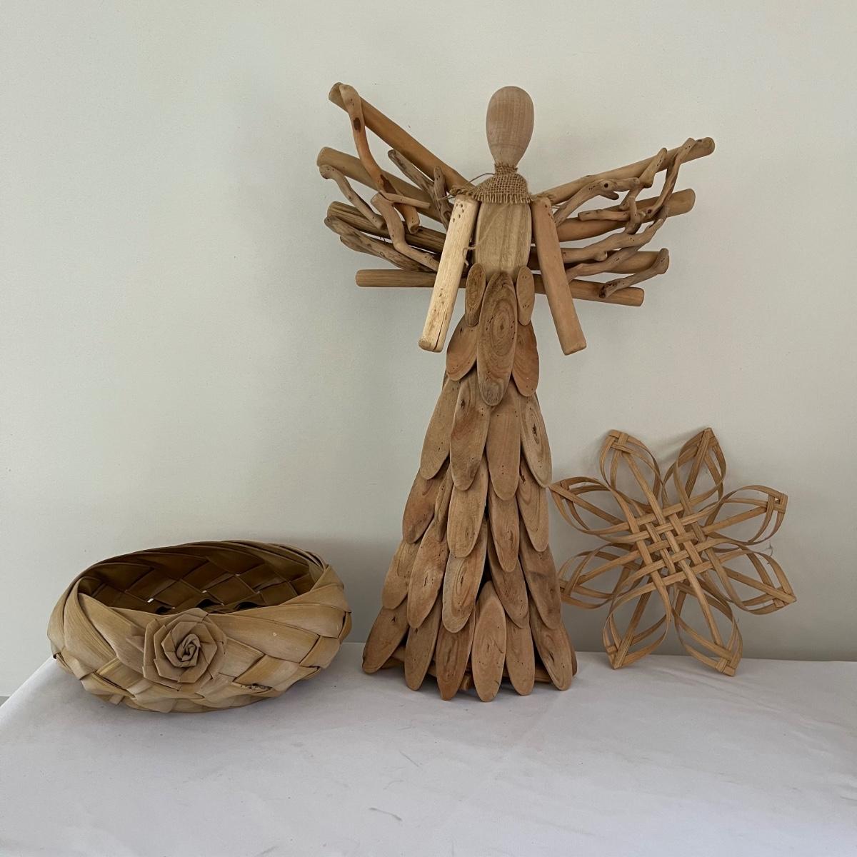 This angel is made from many pieces of wood that are nailed together. Also includes a Woven basket made in Maui and a star shaped woven wall hanging. Angel measures 3.5” x 12” x 19”.