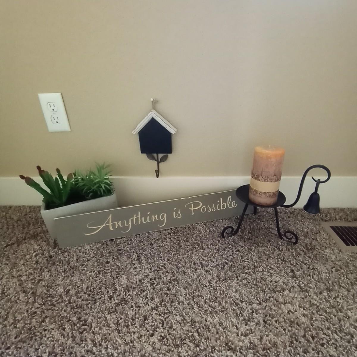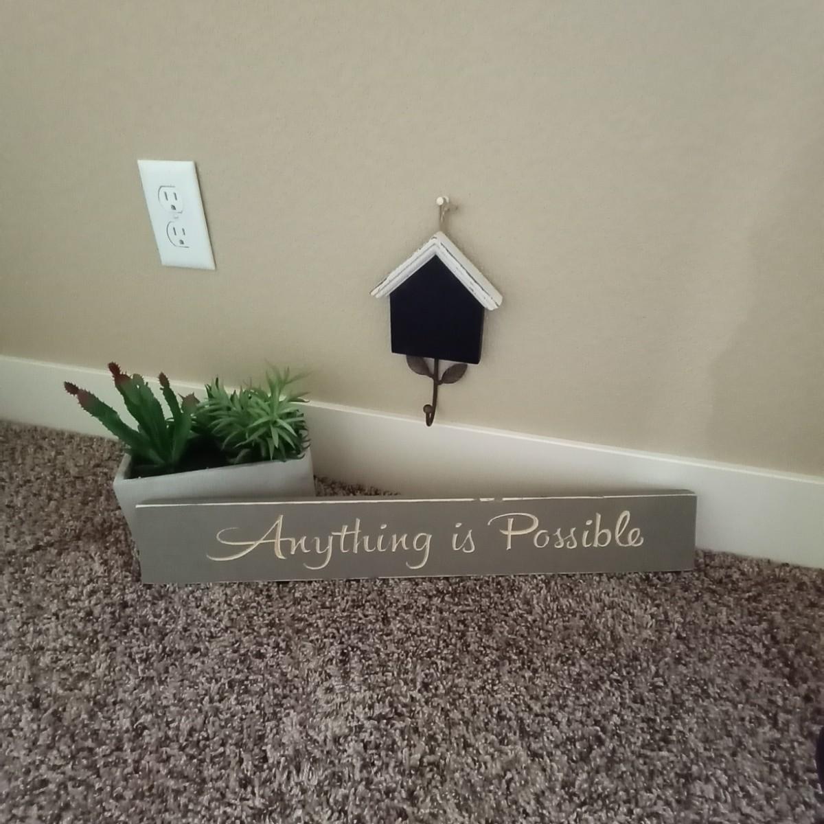 WOODEN "ANYTHING IS POSSIBLE" SIGN 24X4-WOODEN HOUSE HOOK-METAL CANDLE HOLDER WITH BELL-FAUX PLANT 8"W