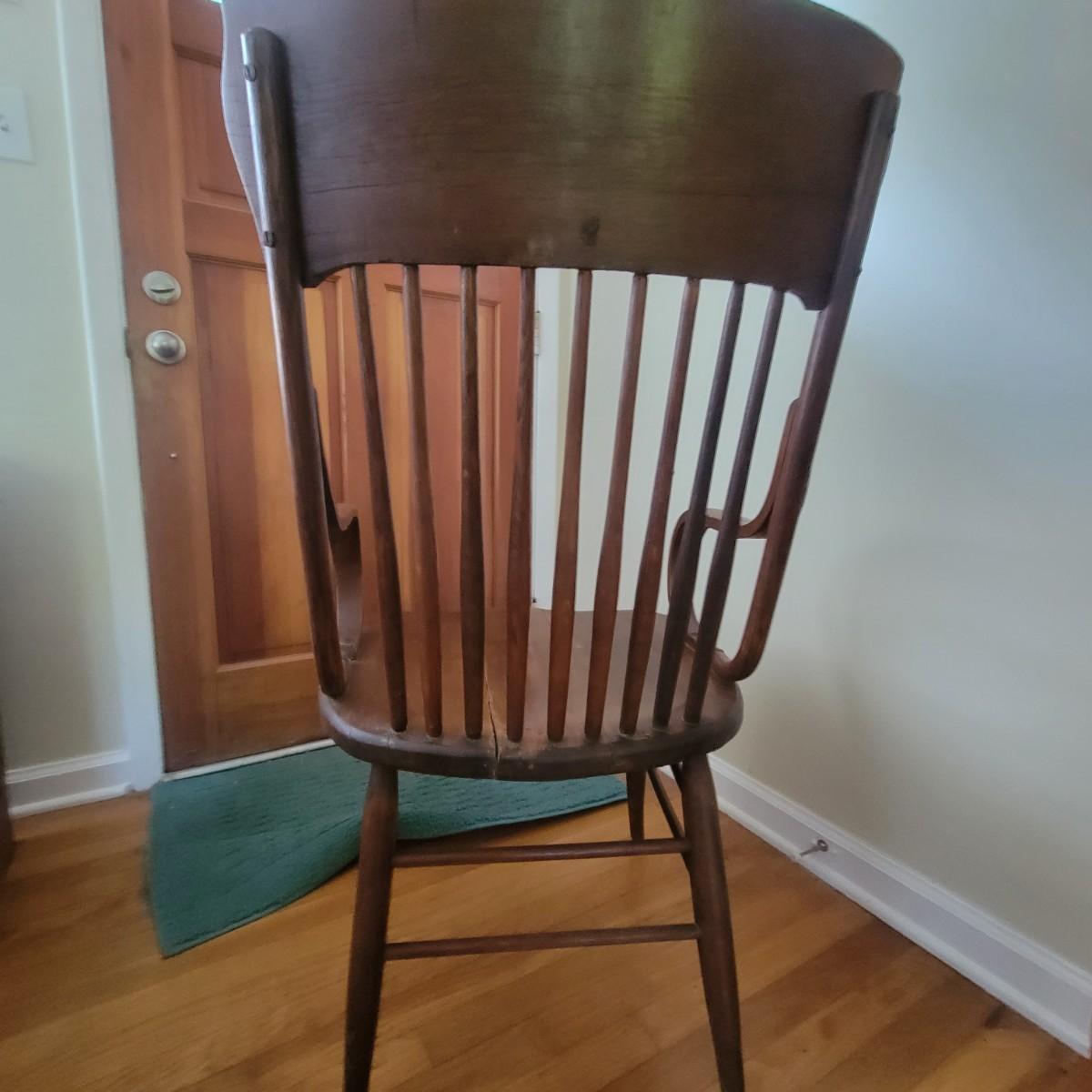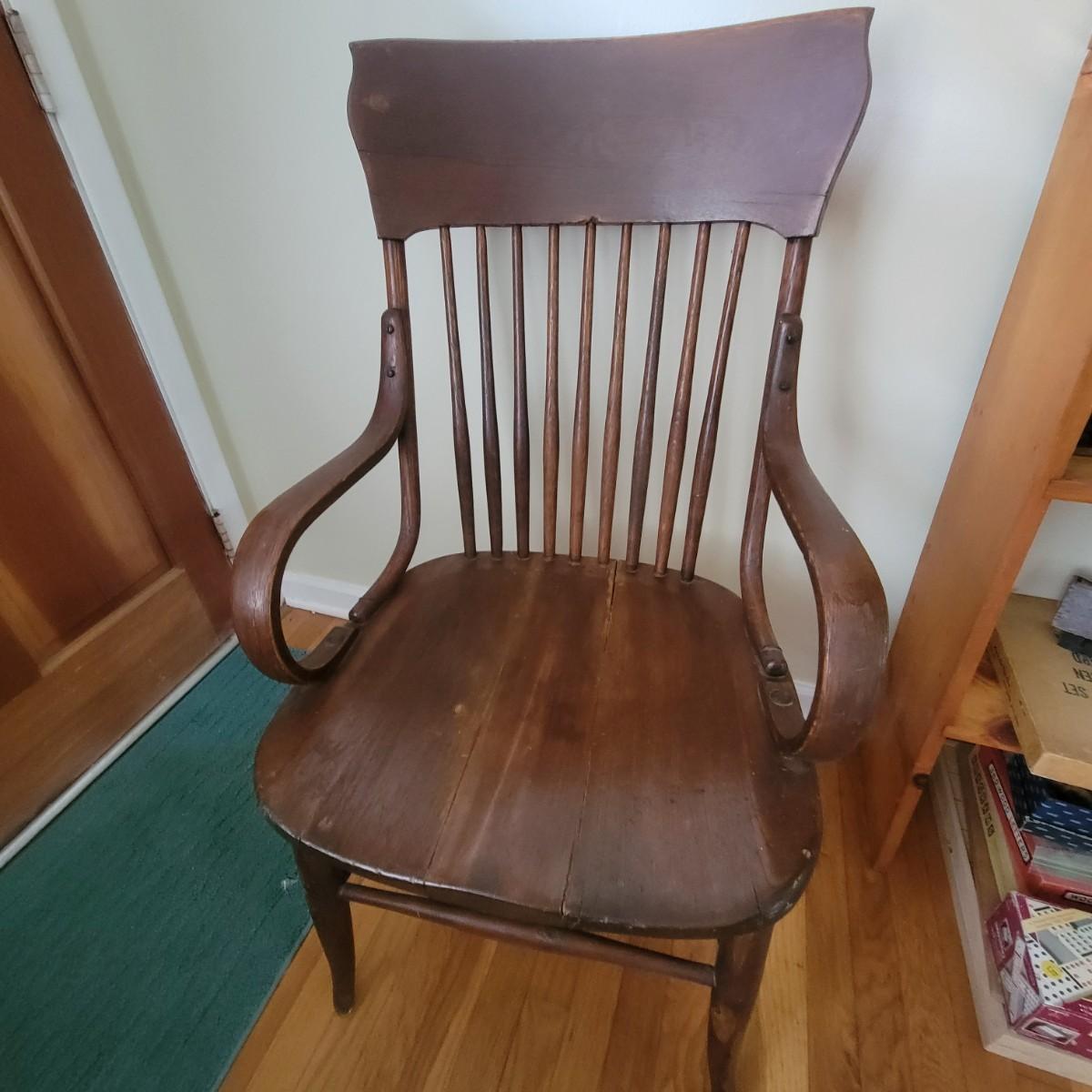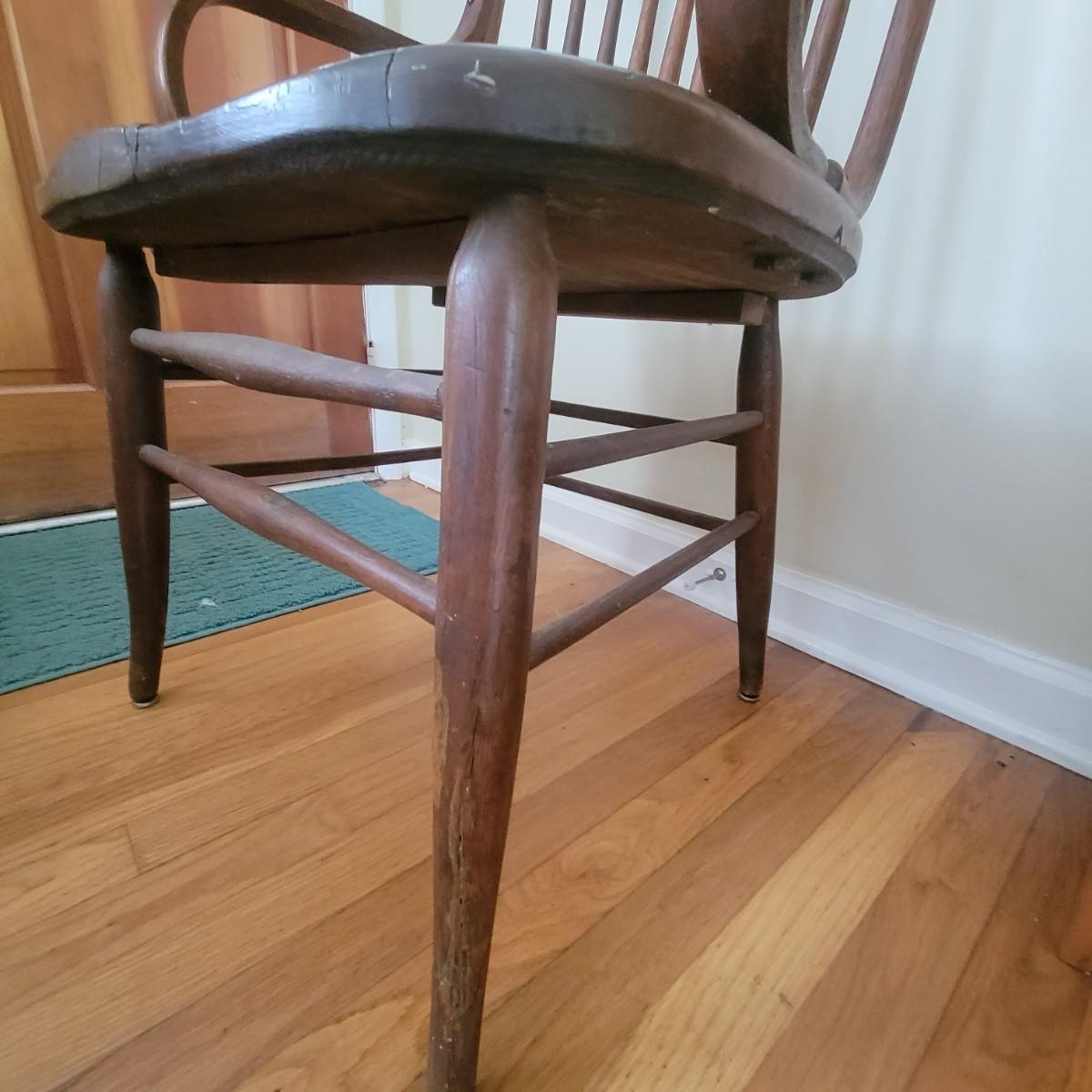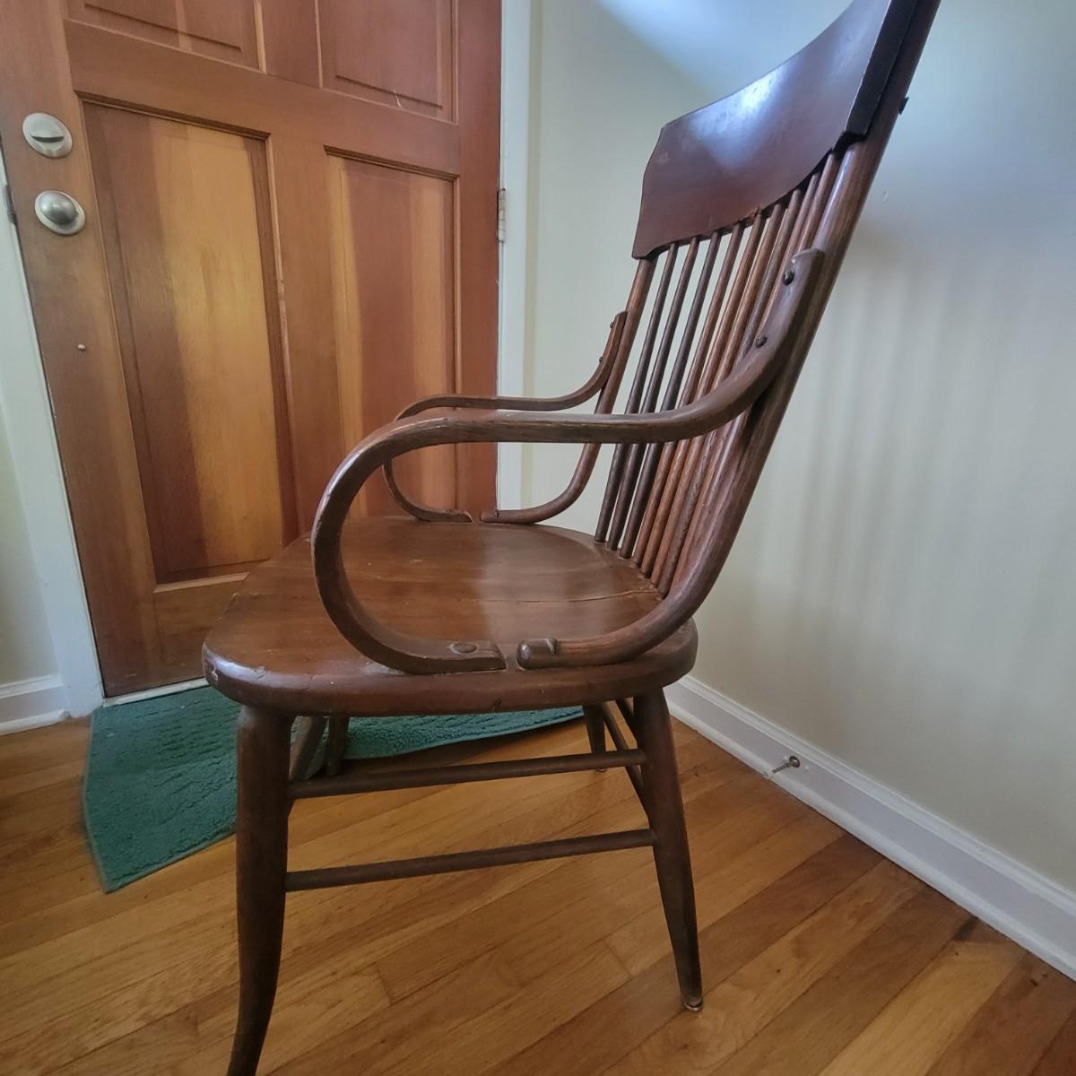 Wooden arm chair with a dark stain. The chair appears to be older and joined without using metal hardware. There is a crack in the seat that has been repaired from underneath with wooden slats and screws. Some moderate wear and tear appropriate to its age, see attached pictures. Chair measures approximately 22" x 19.5" x 40" Seat height is 18". Local pickup only