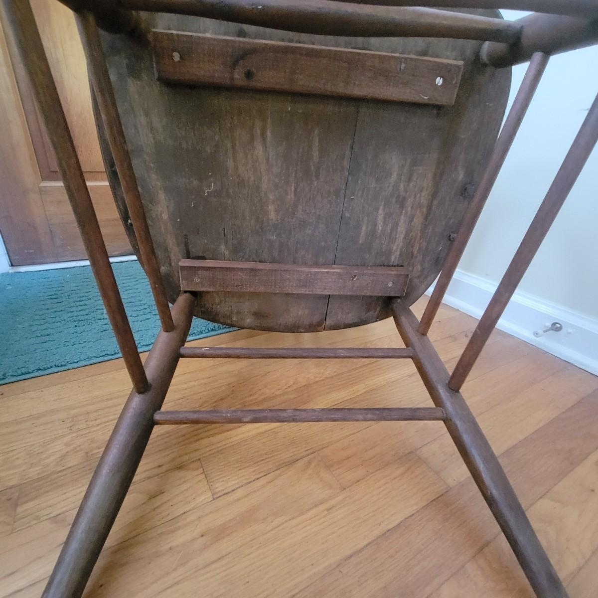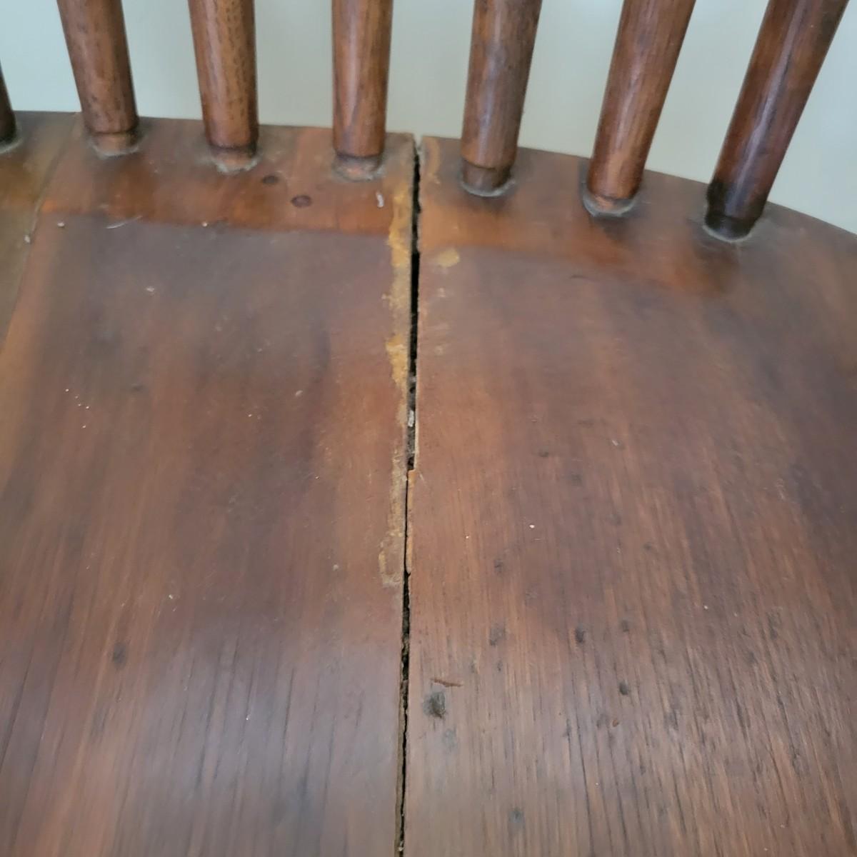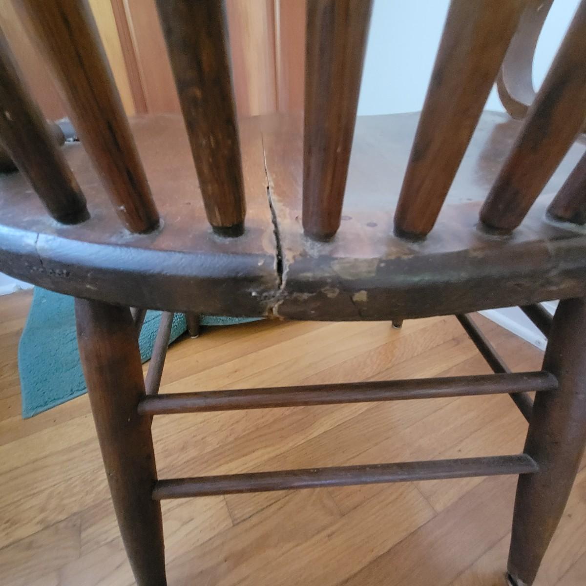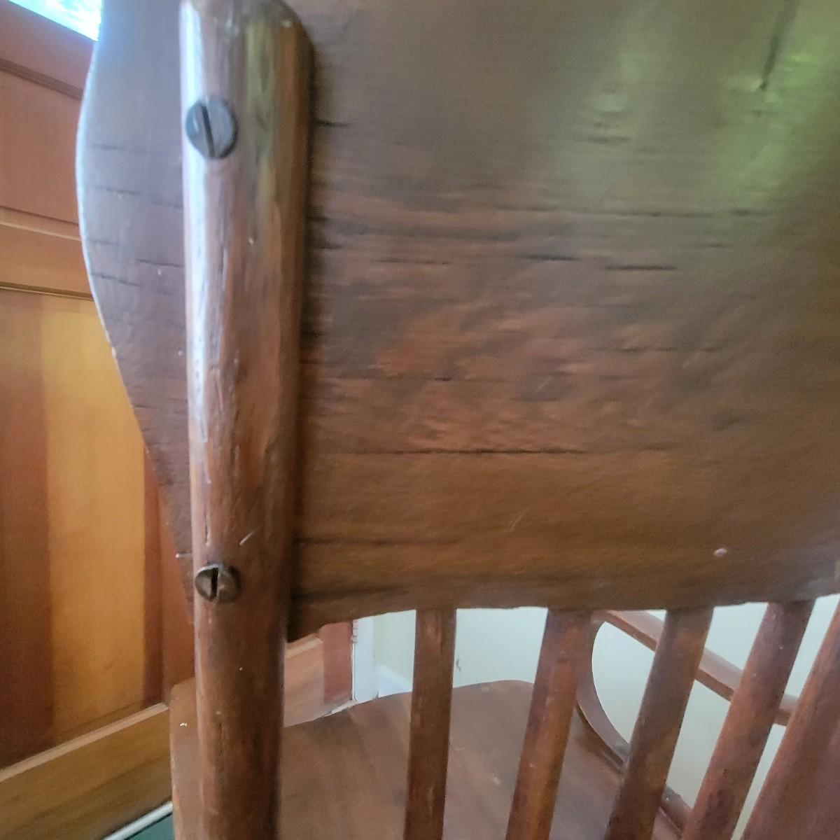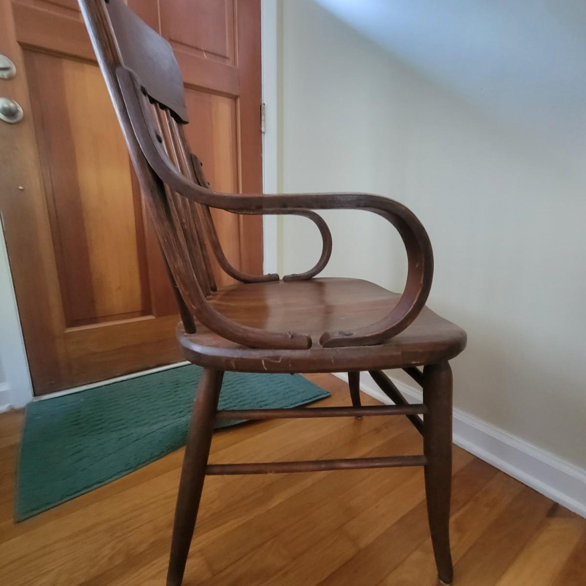 Wooden arm chair with a dark stain. The chair appears to be older and joined without using metal hardware. There is a crack in the seat that has been repaired from underneath with wooden slats and screws. Some moderate wear and tear appropriate to its age, see attached pictures. Chair measures approximately 22" x 19.5" x 40" Seat height is 18". Local pickup only