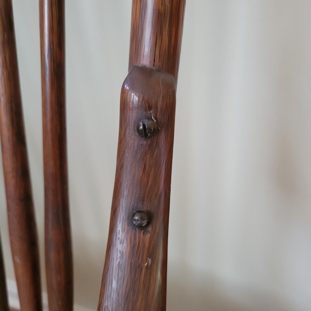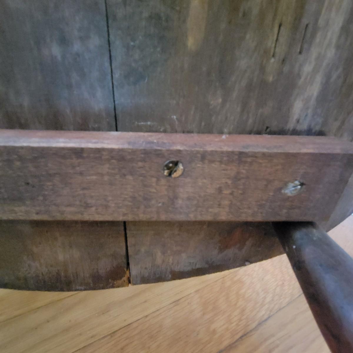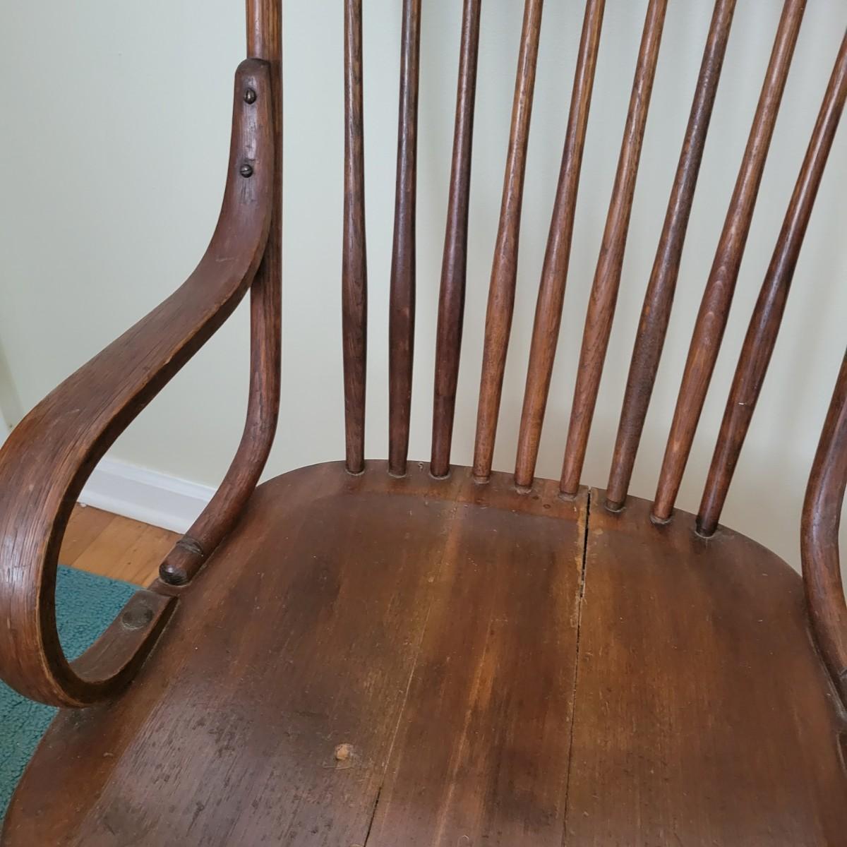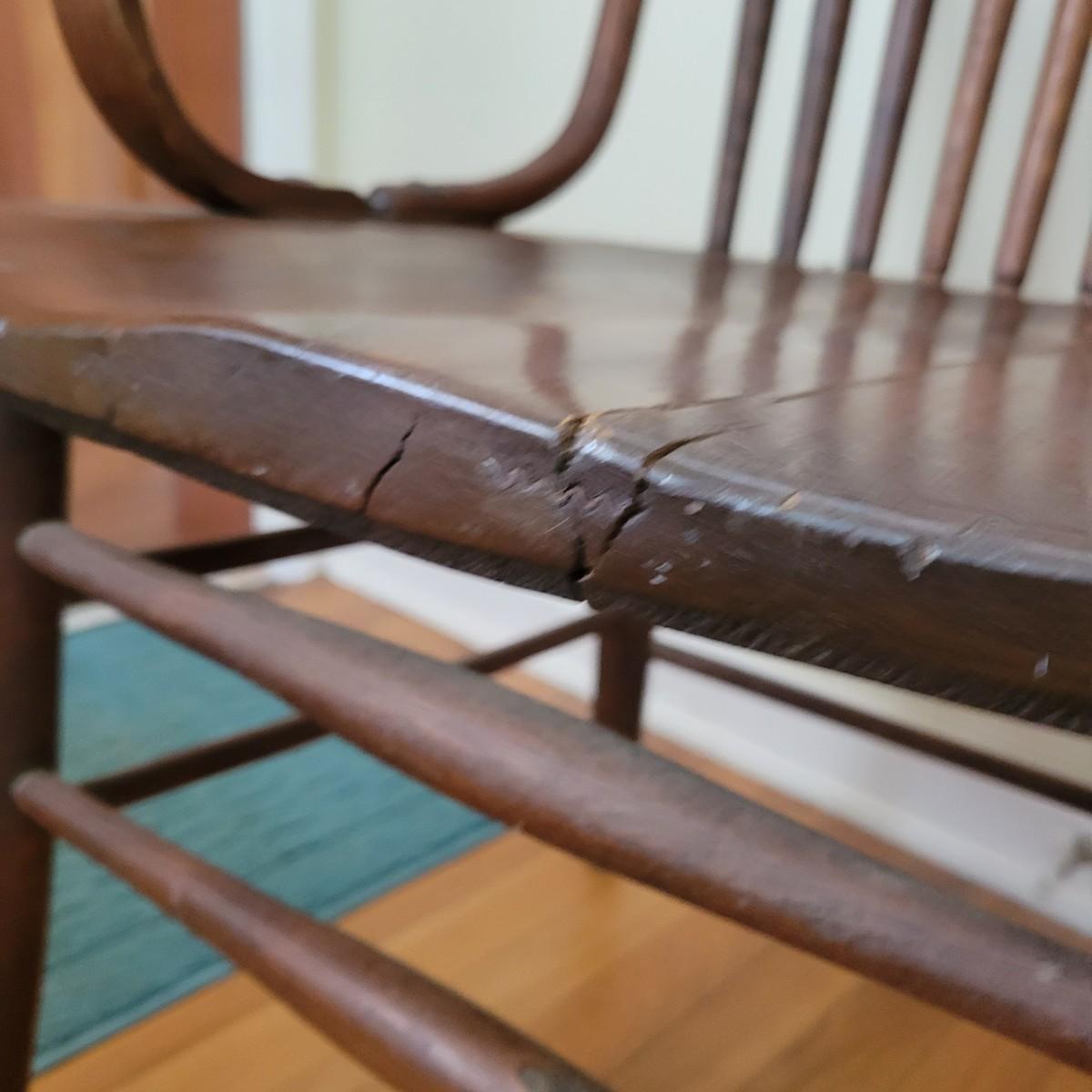 Wooden arm chair with a dark stain. The chair appears to be older and joined without using metal hardware. There is a crack in the seat that has been repaired from underneath with wooden slats and screws. Some moderate wear and tear appropriate to its age, see attached pictures. Chair measures approximately 22" x 19.5" x 40" Seat height is 18". Local pickup only