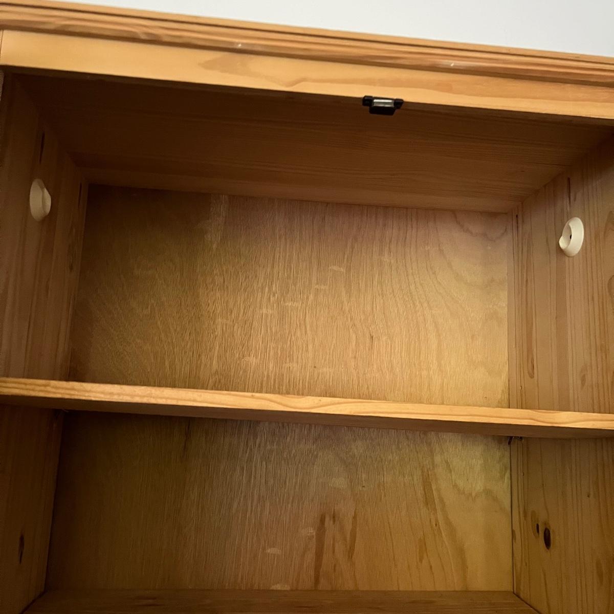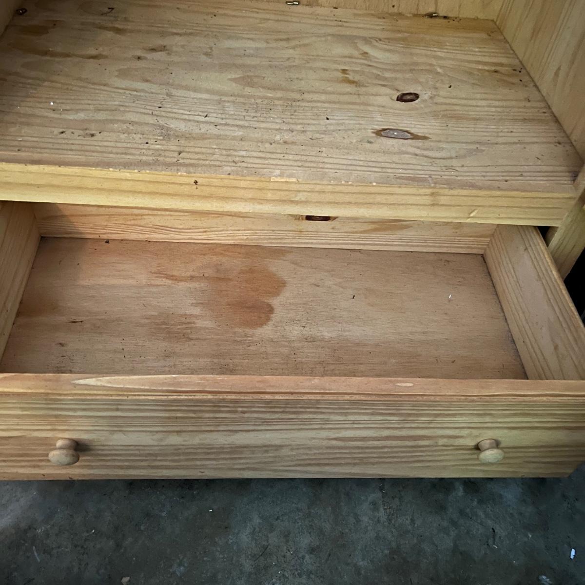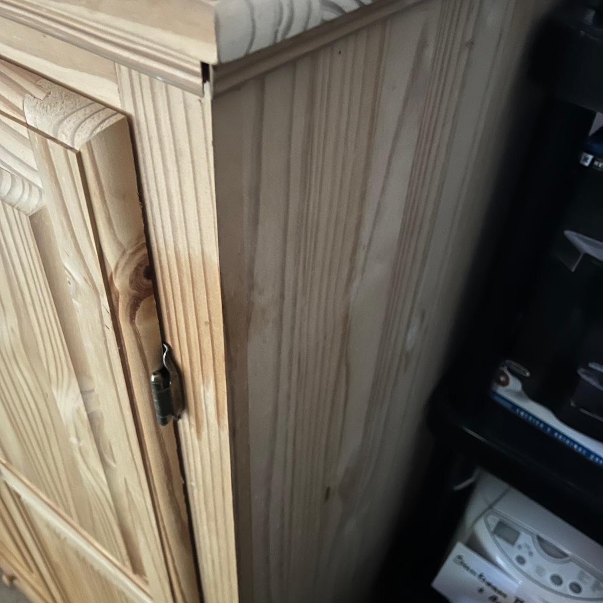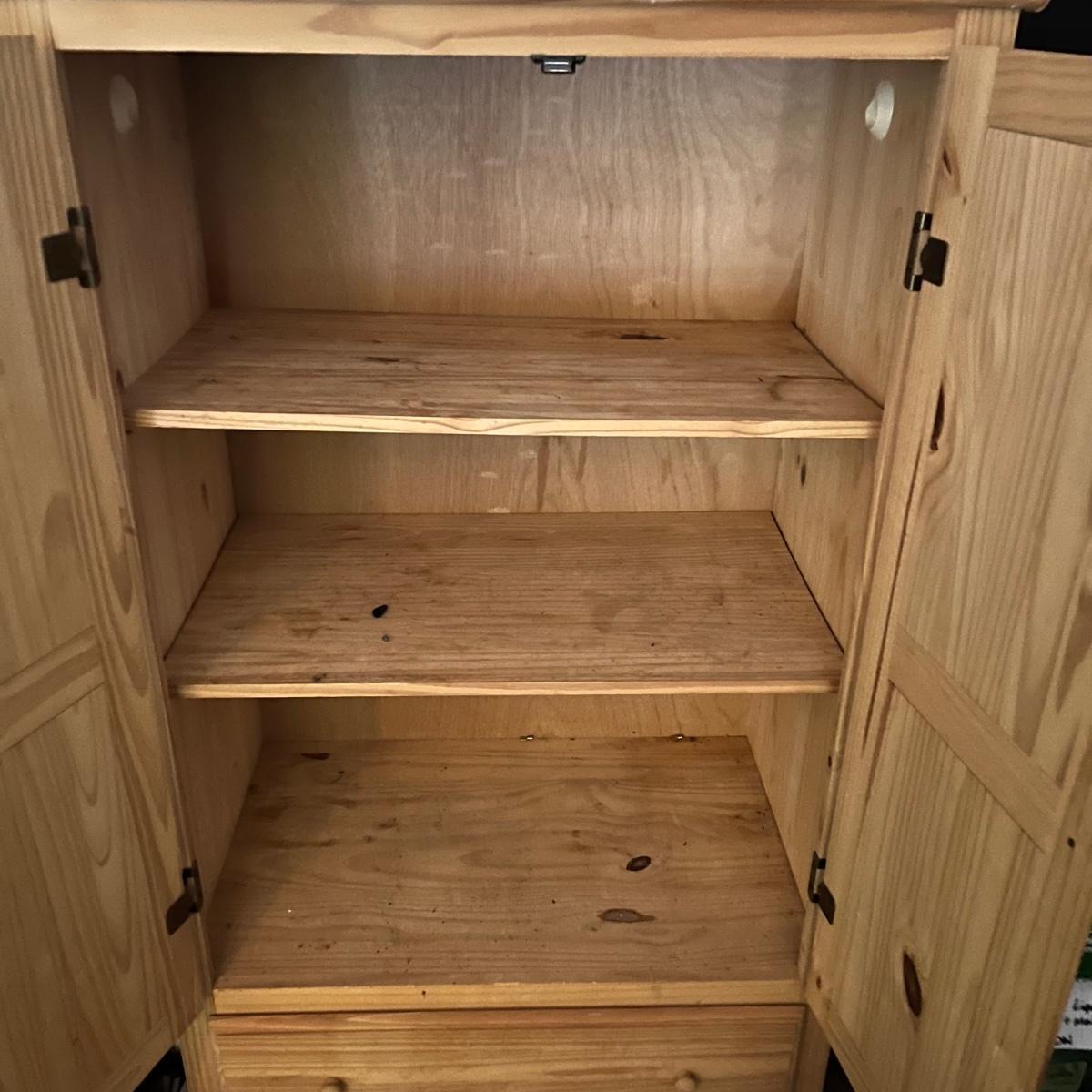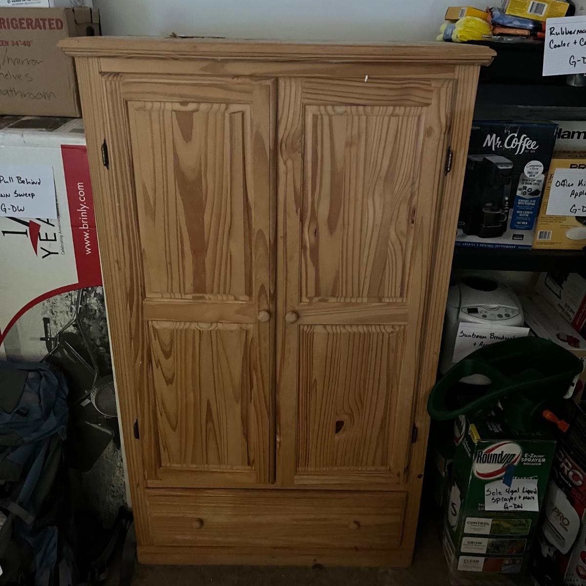 Lot includes a wooden armoire with two adjustable shelves and a drawer underneath. Armoire has wooden stick stuck to top and a few stains, see pictures. Armoire measures 21” x 36” x 59”.