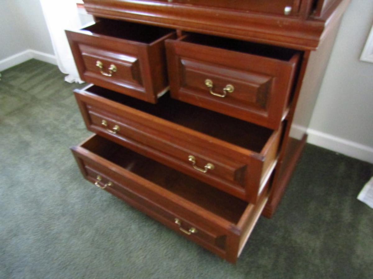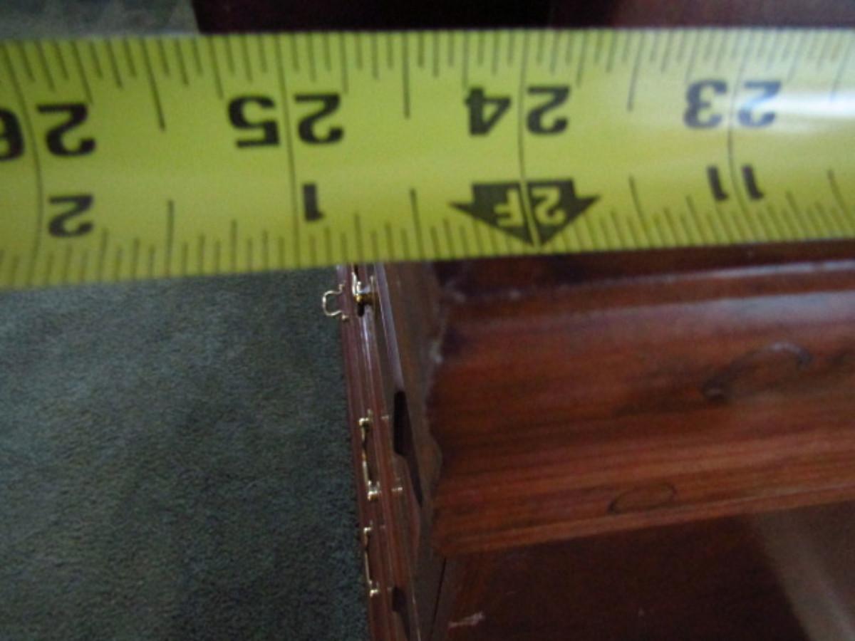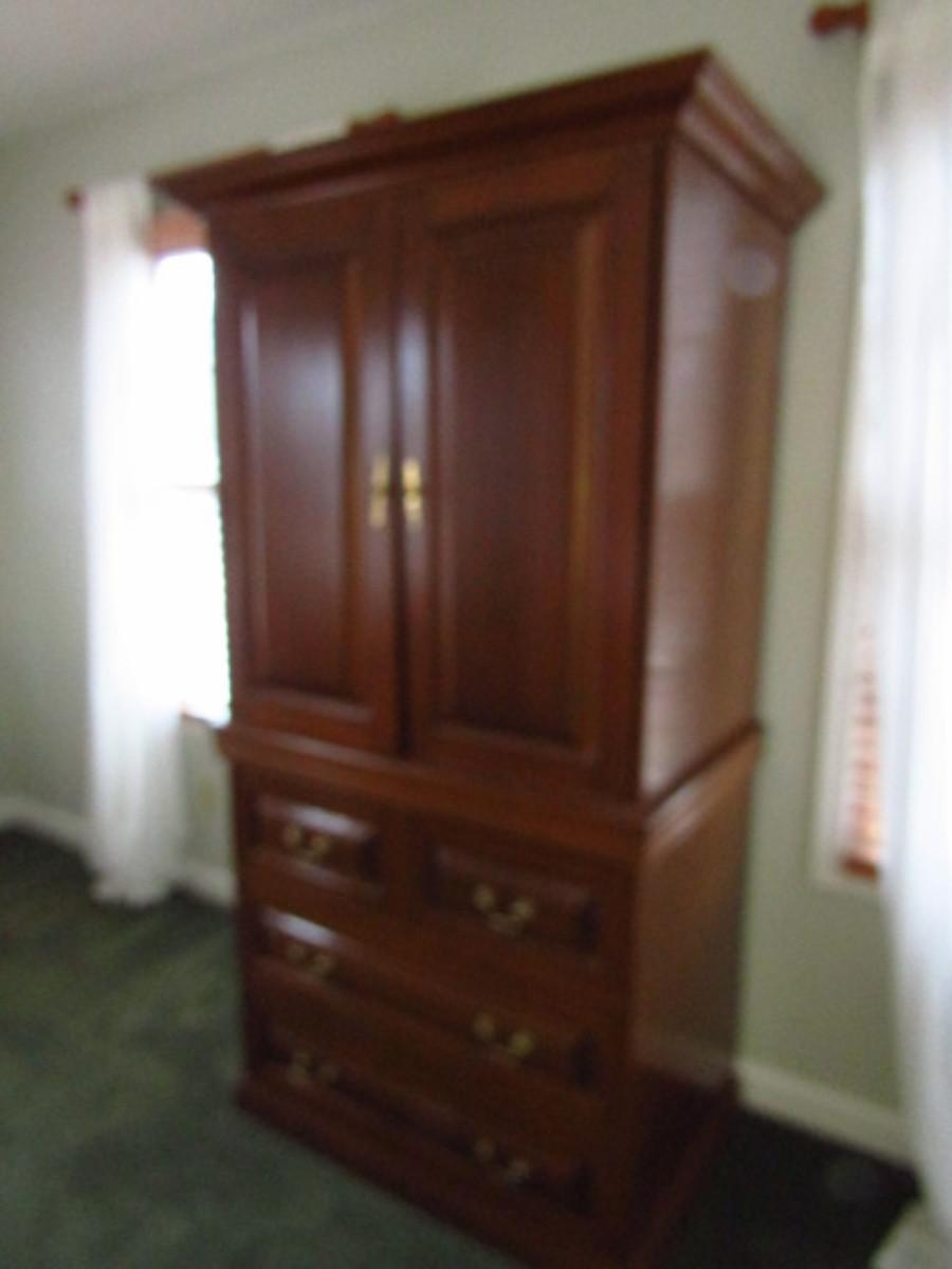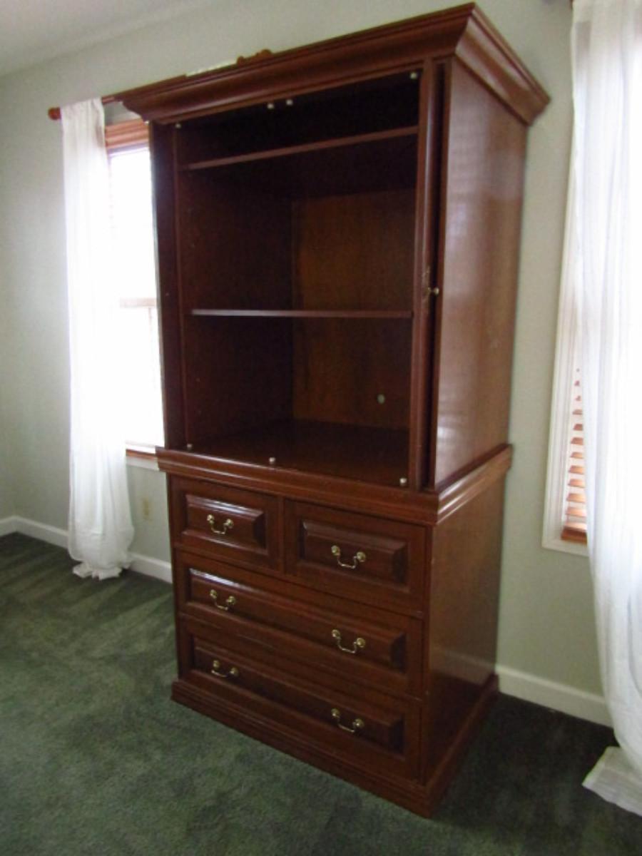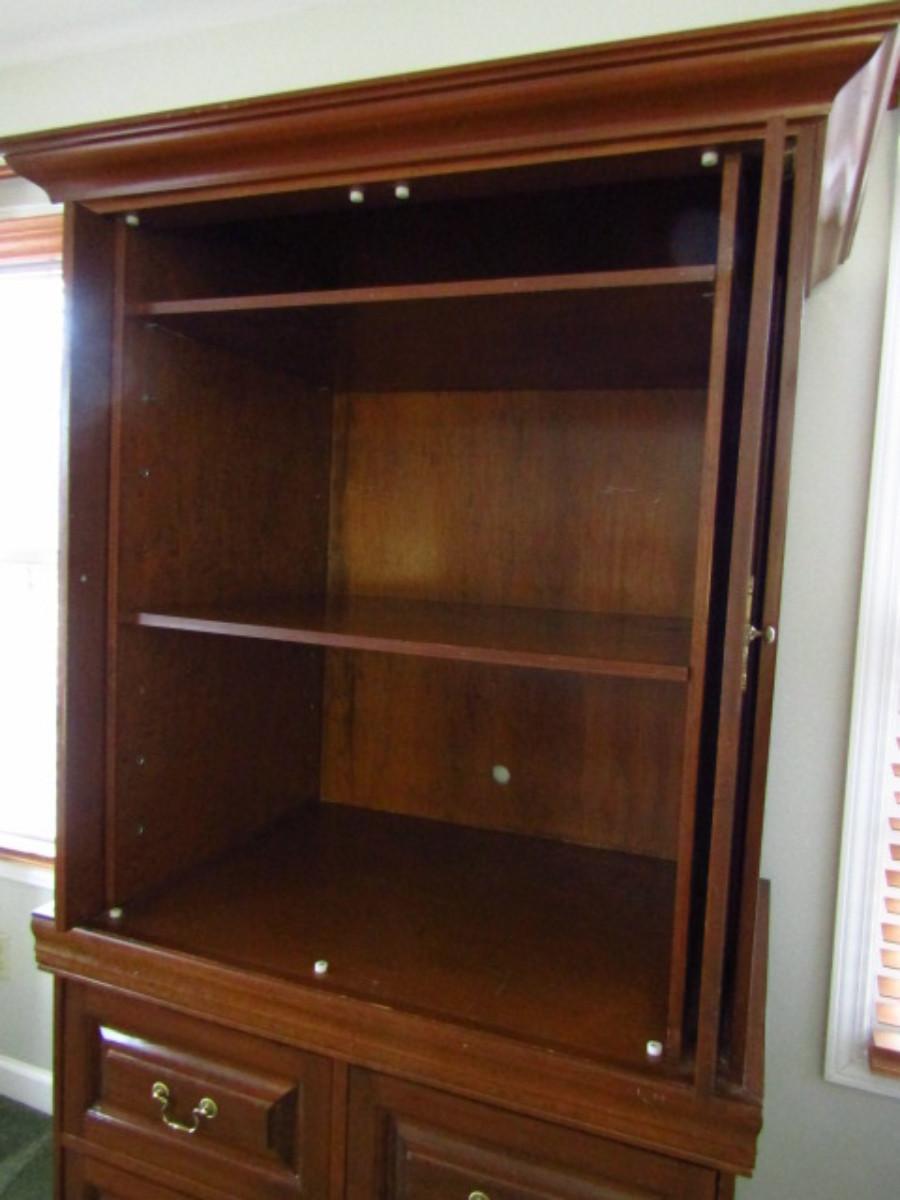 Wooden Armoire/Media Cabinet- Item is Upstairs. Measures approx 37" wide, 24 1/2" deep, 74 1/2" tall. Maker's mark not found. For large furniture items we partner with the following moving companies. Please feel free to call for rates. Carolina PacknGo 828-489-9773 or Beaty Bros. 828-201-2982