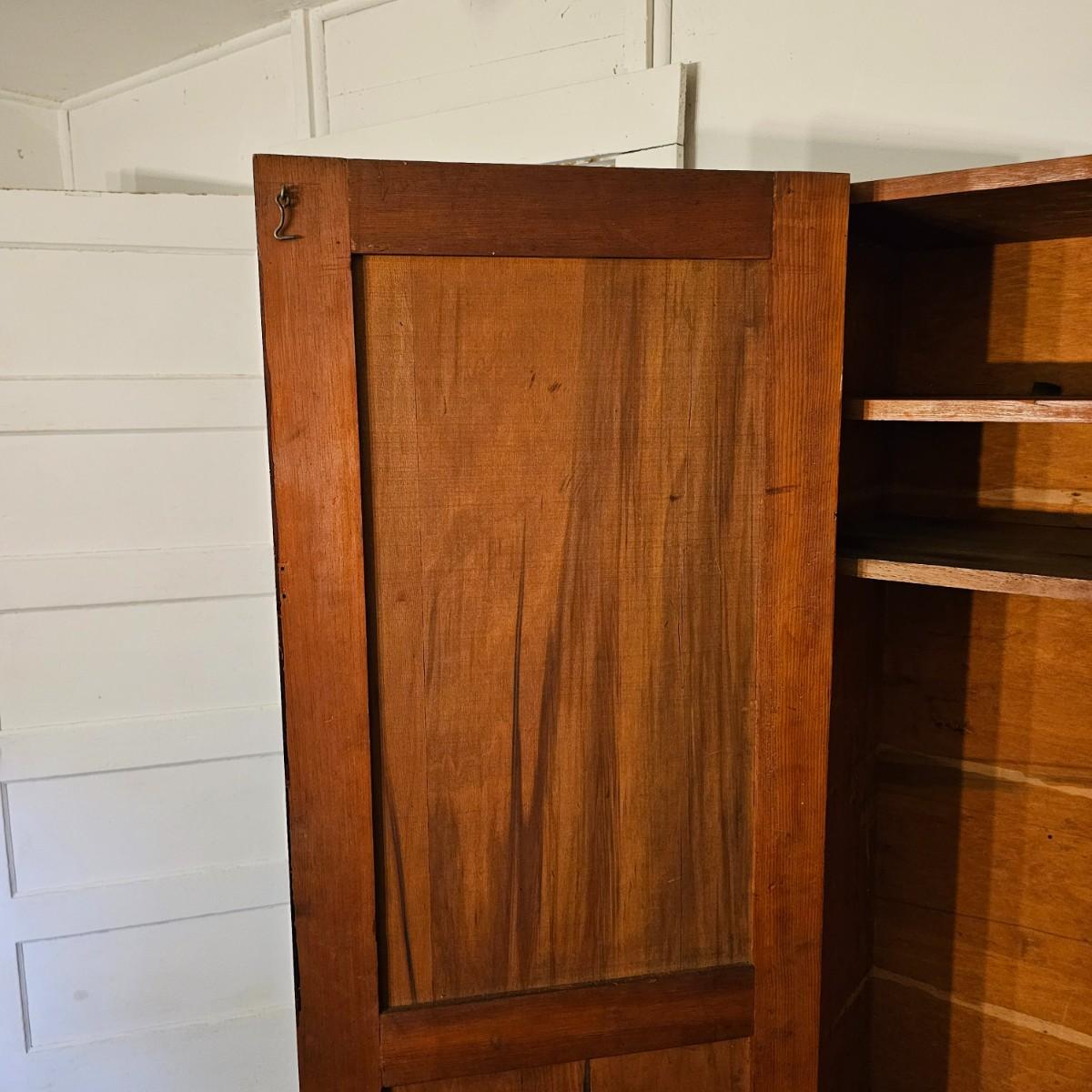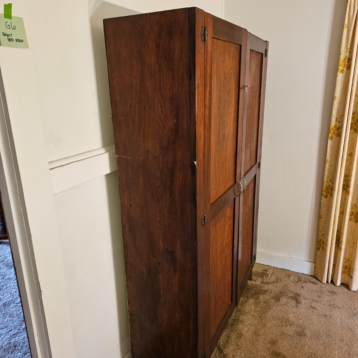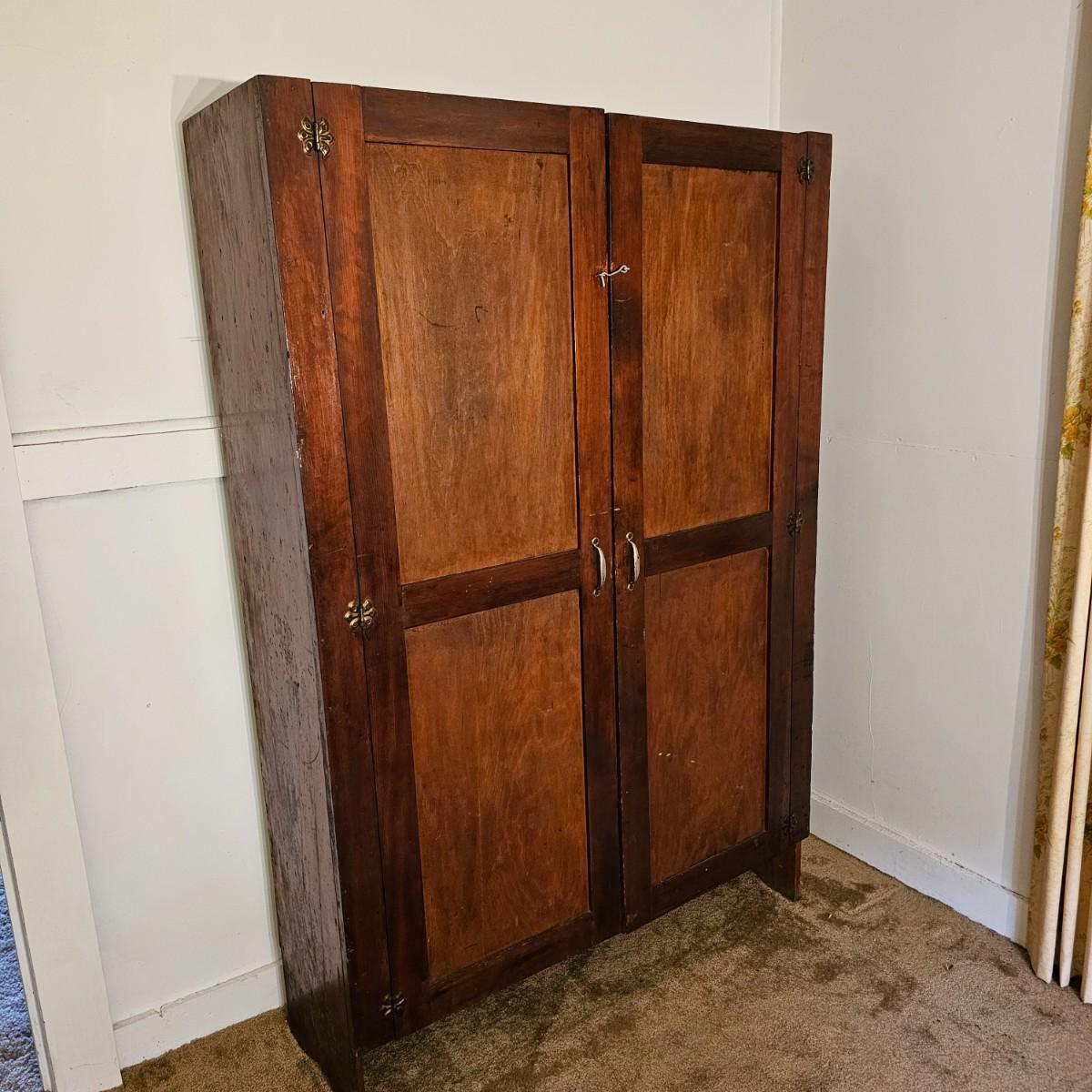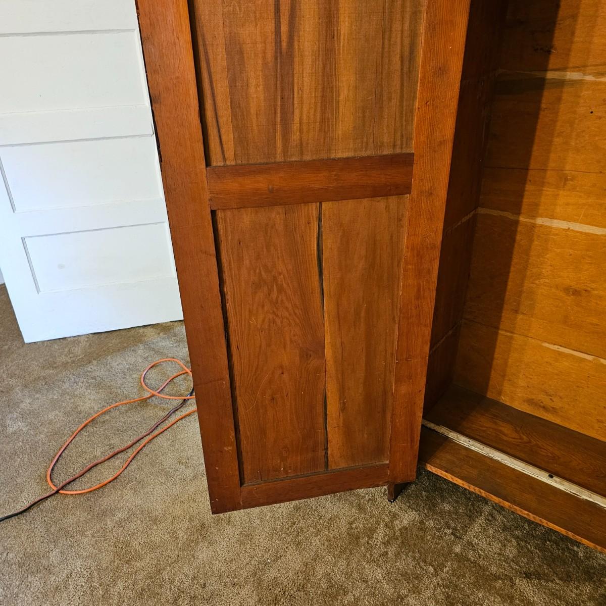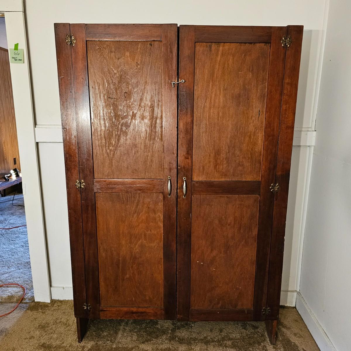 Solid wood armoire or storage cabinet. Cabinet has two large doors that swing open for access. Two small shelves at top with clothes hanging hooks underneath. Recessed panel doors. Cabinet measures 48.5" x 15.5" x 72"H. Some minor blemishes on front and sides. The backside is made from sturdy pressed wood that resembles masonite. See photos for details.