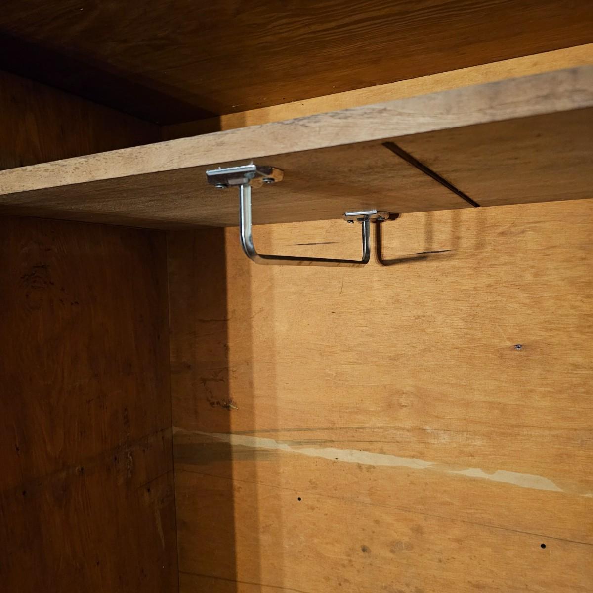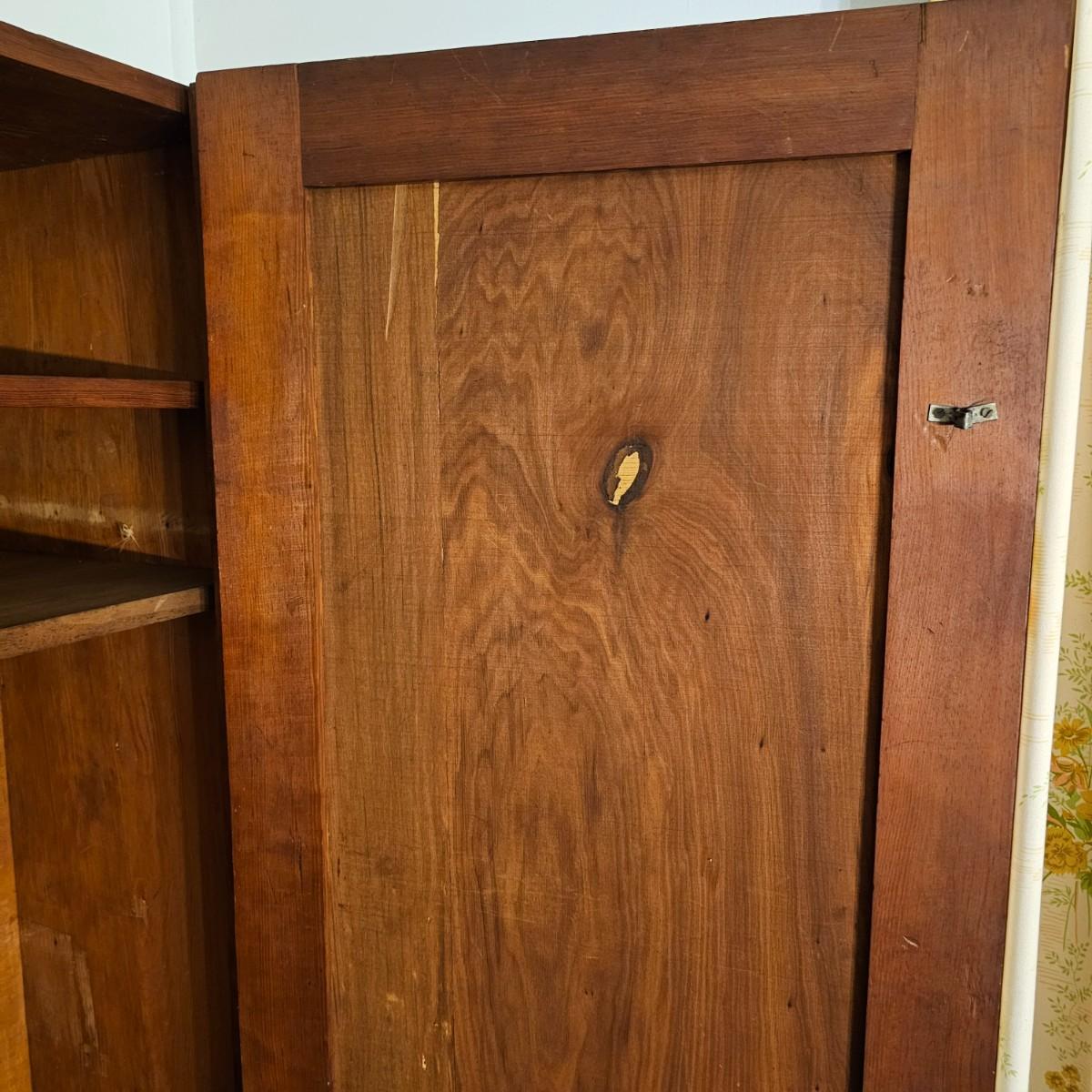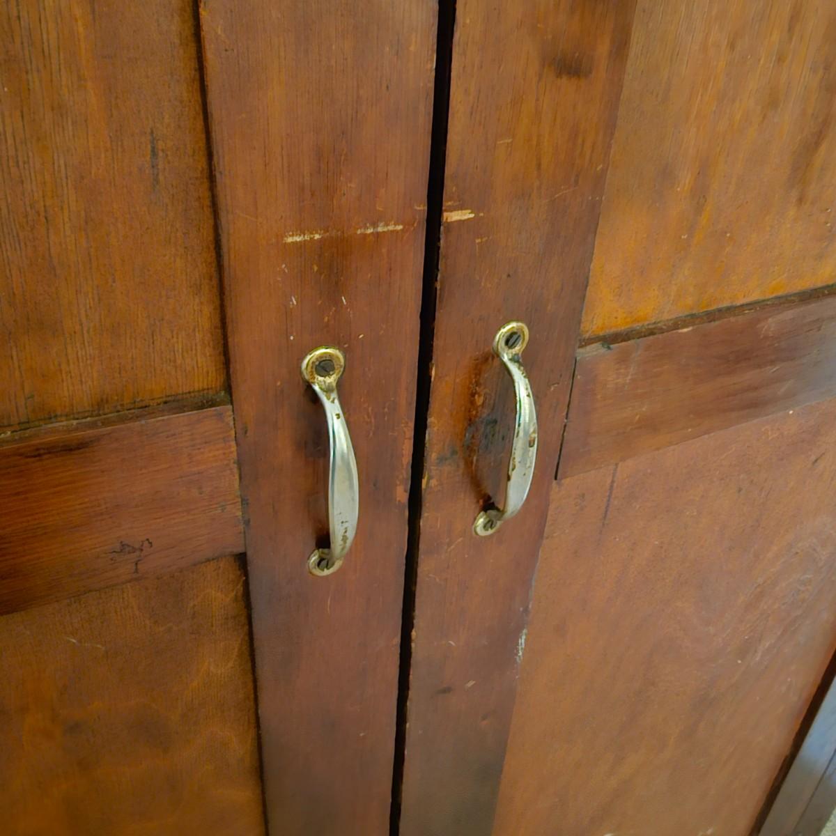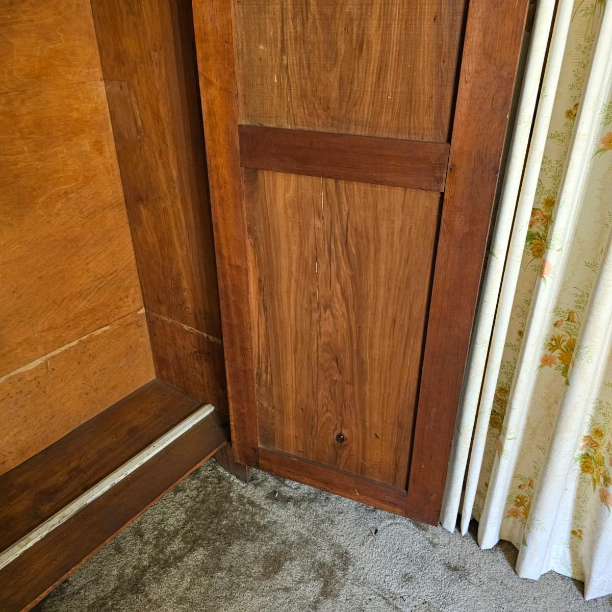 Solid wood armoire or storage cabinet. Cabinet has two large doors that swing open for access. Two small shelves at top with clothes hanging hooks underneath. Recessed panel doors. Cabinet measures 48.5" x 15.5" x 72"H. Some minor blemishes on front and sides. The backside is made from sturdy pressed wood that resembles masonite. See photos for details.