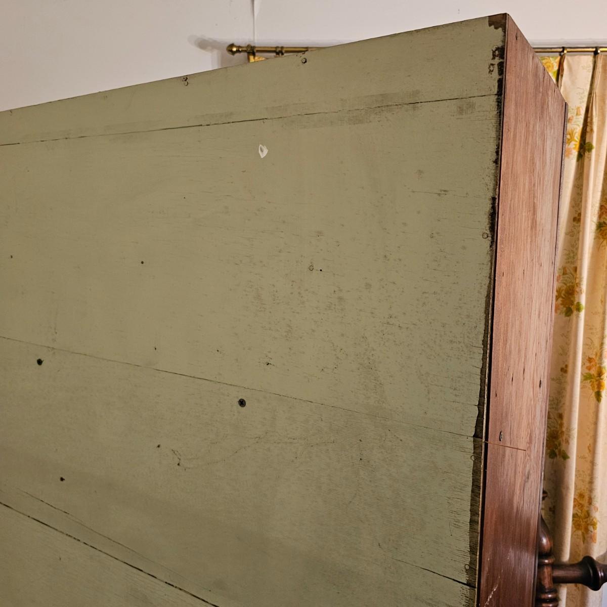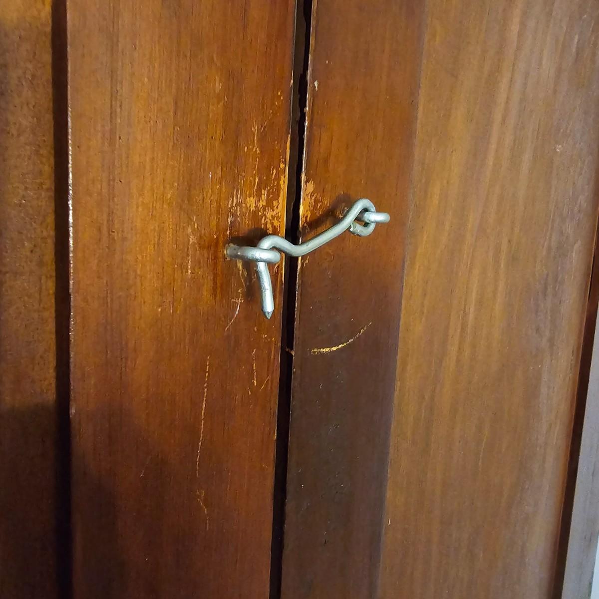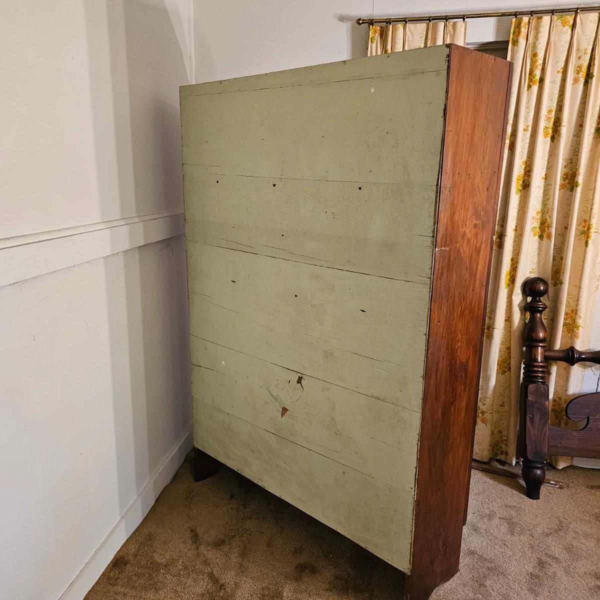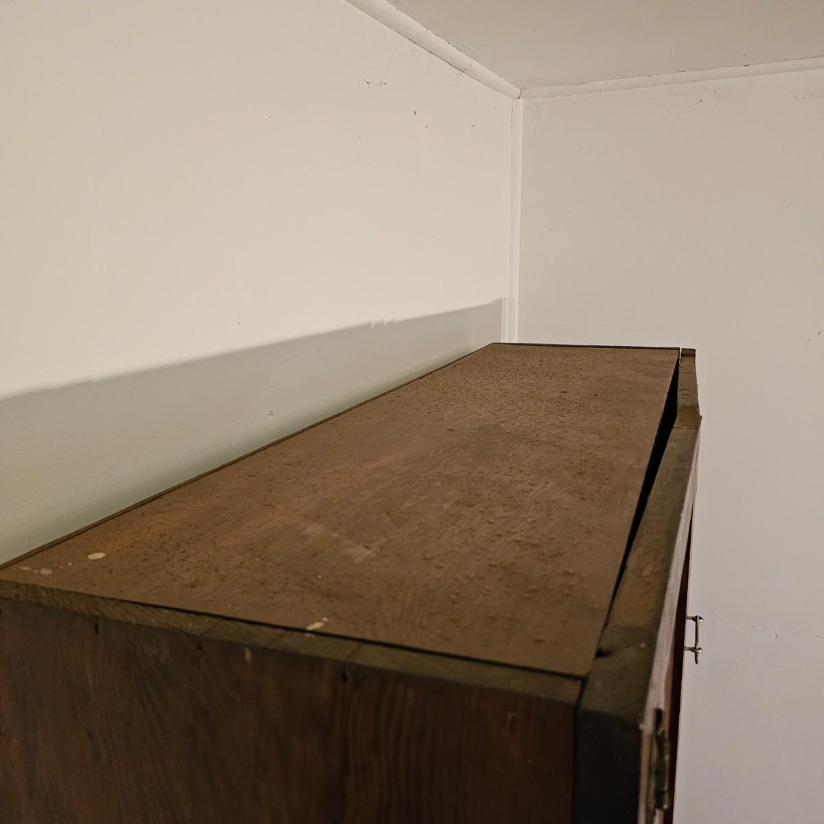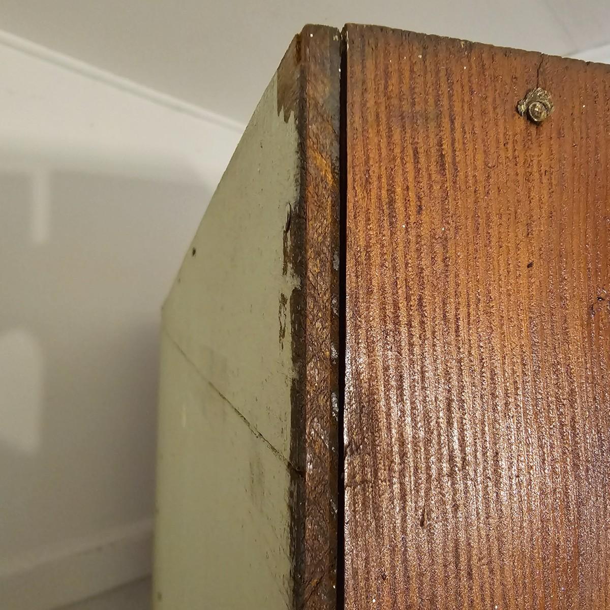 Solid wood armoire or storage cabinet. Cabinet has two large doors that swing open for access. Two small shelves at top with clothes hanging hooks underneath. Recessed panel doors. Cabinet measures 48.5" x 15.5" x 72"H. Some minor blemishes on front and sides. The backside is made from sturdy pressed wood that resembles masonite. See photos for details.