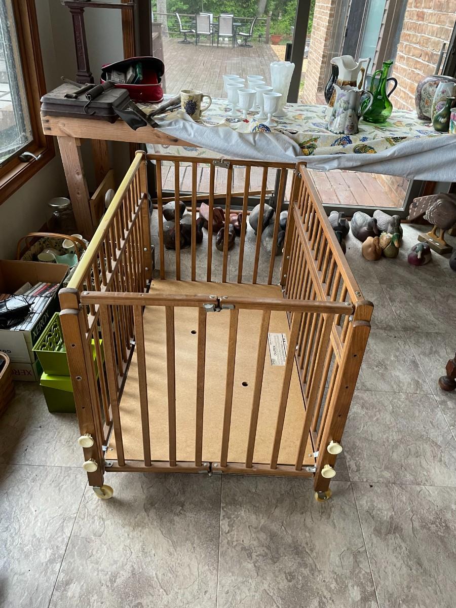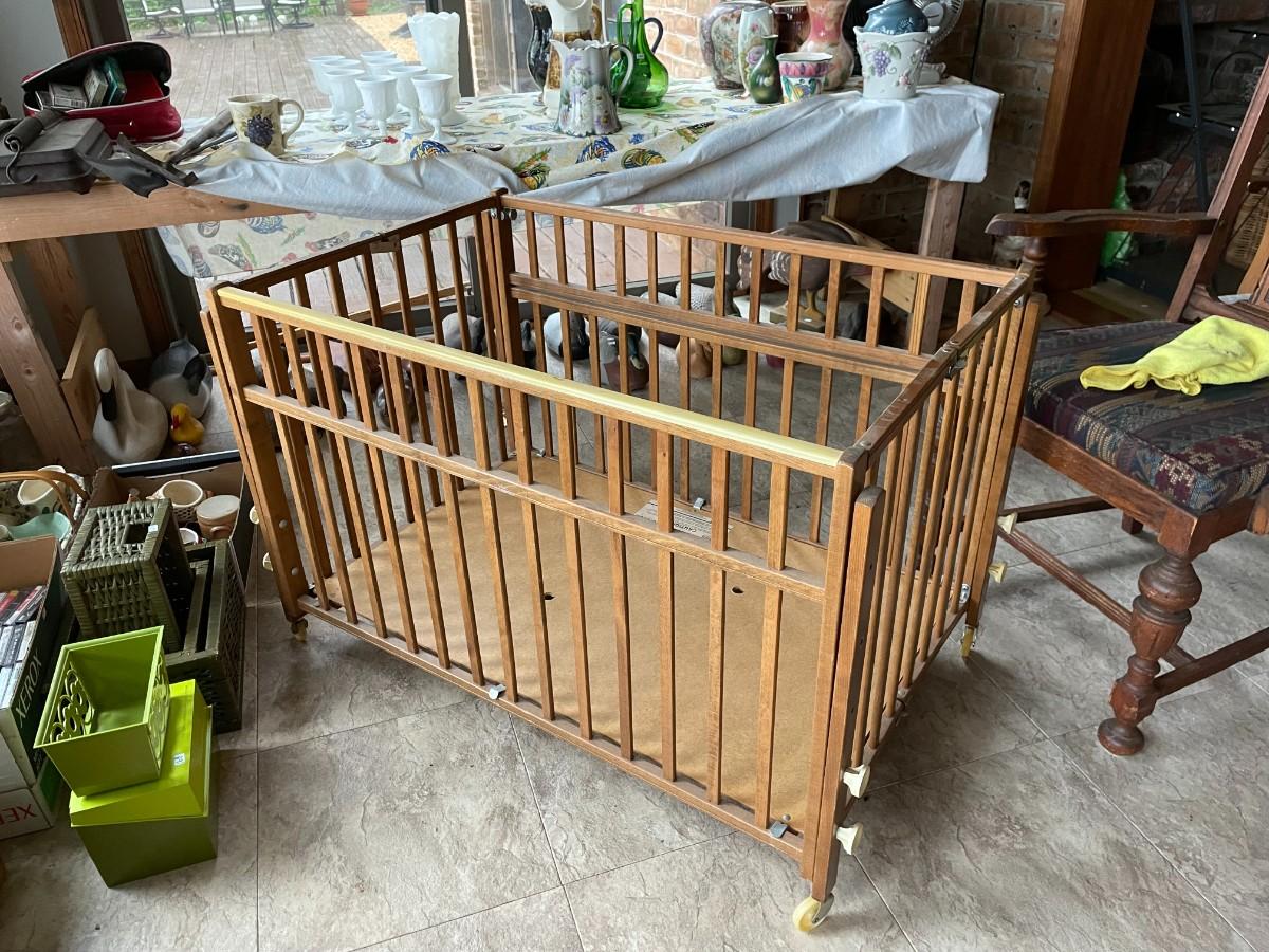 Wooden, collapsible baby crib. 40L x 26W x 27 1/2H.