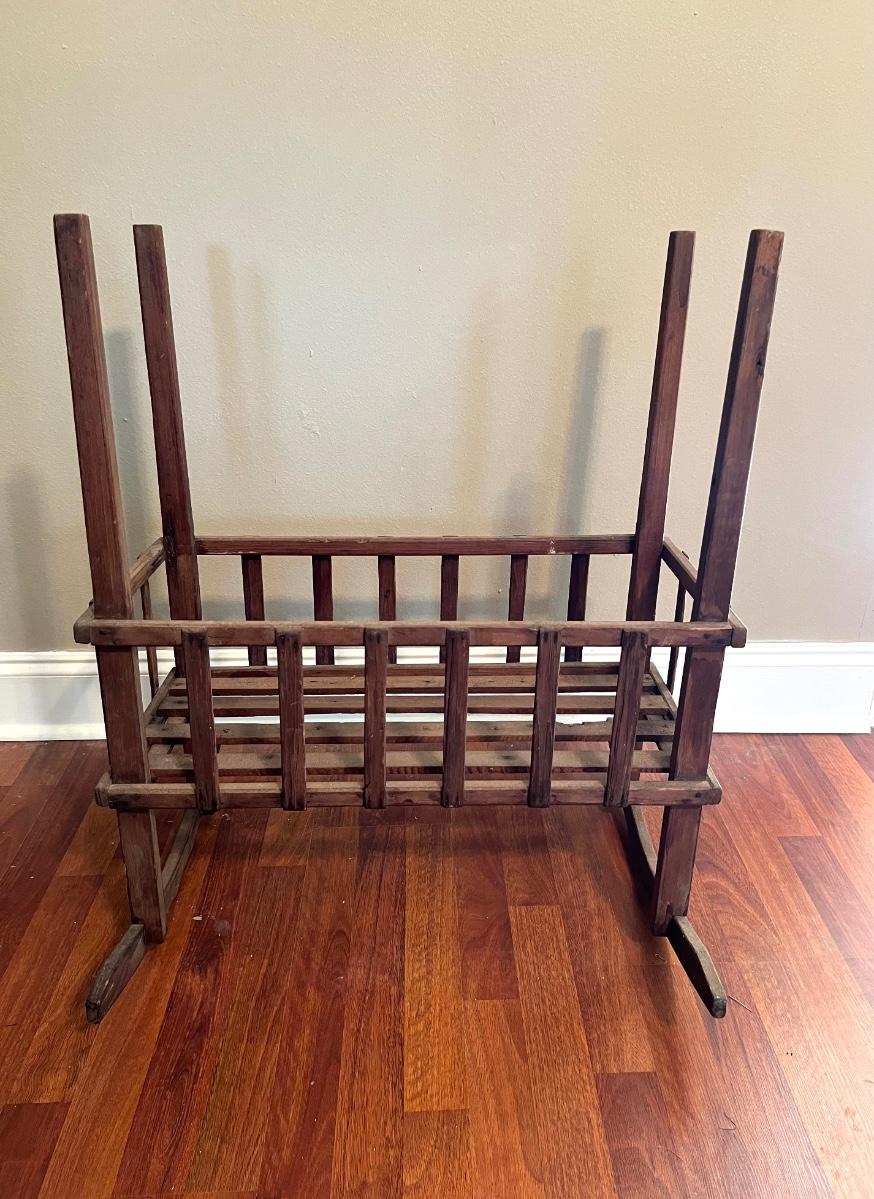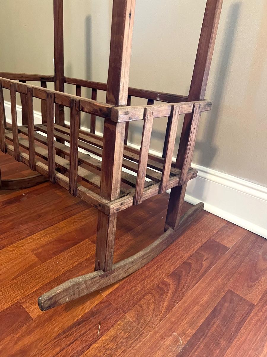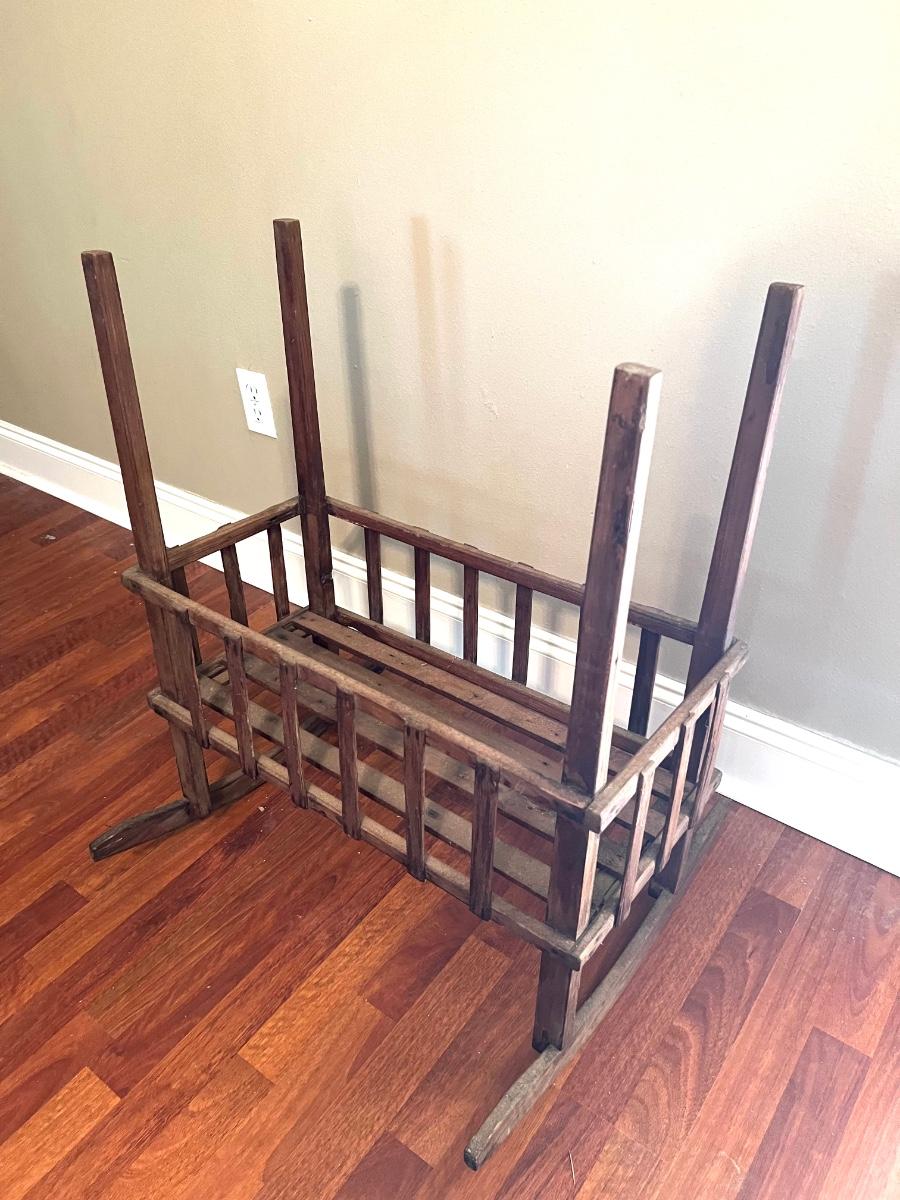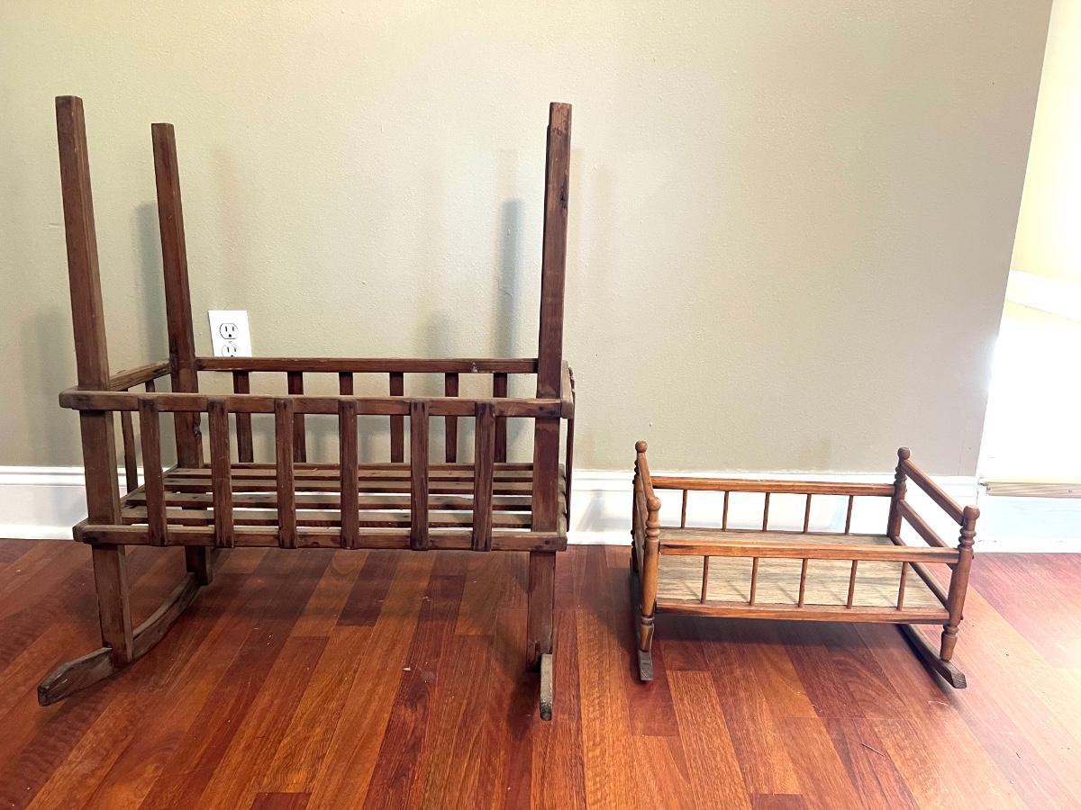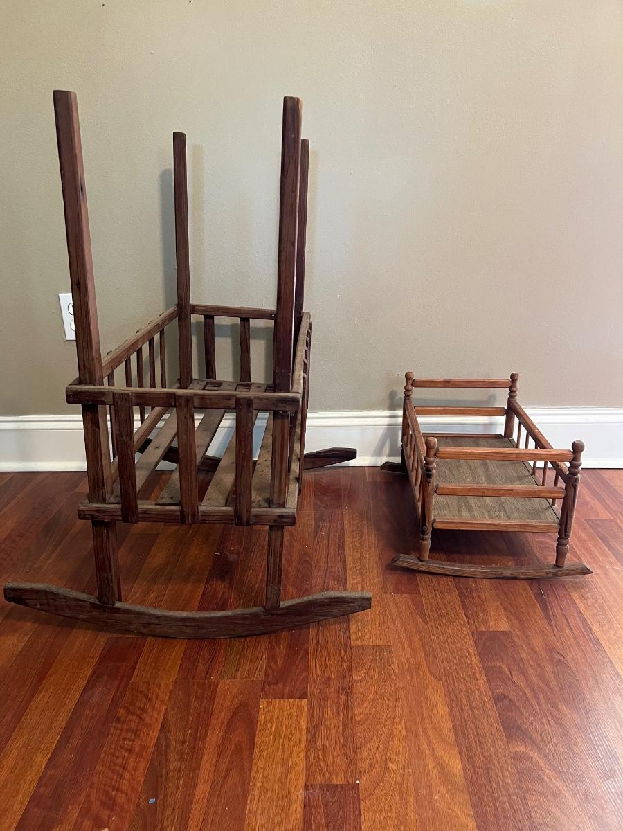 Set of WOODEN Baby Doll Rockers, probably made by paw paw! Largest Measures 26 inches long, 12 inches wide, and 30 inches tall. Smaller one measures 17 1/2 inches long 11 inches wide 11 inches tall.