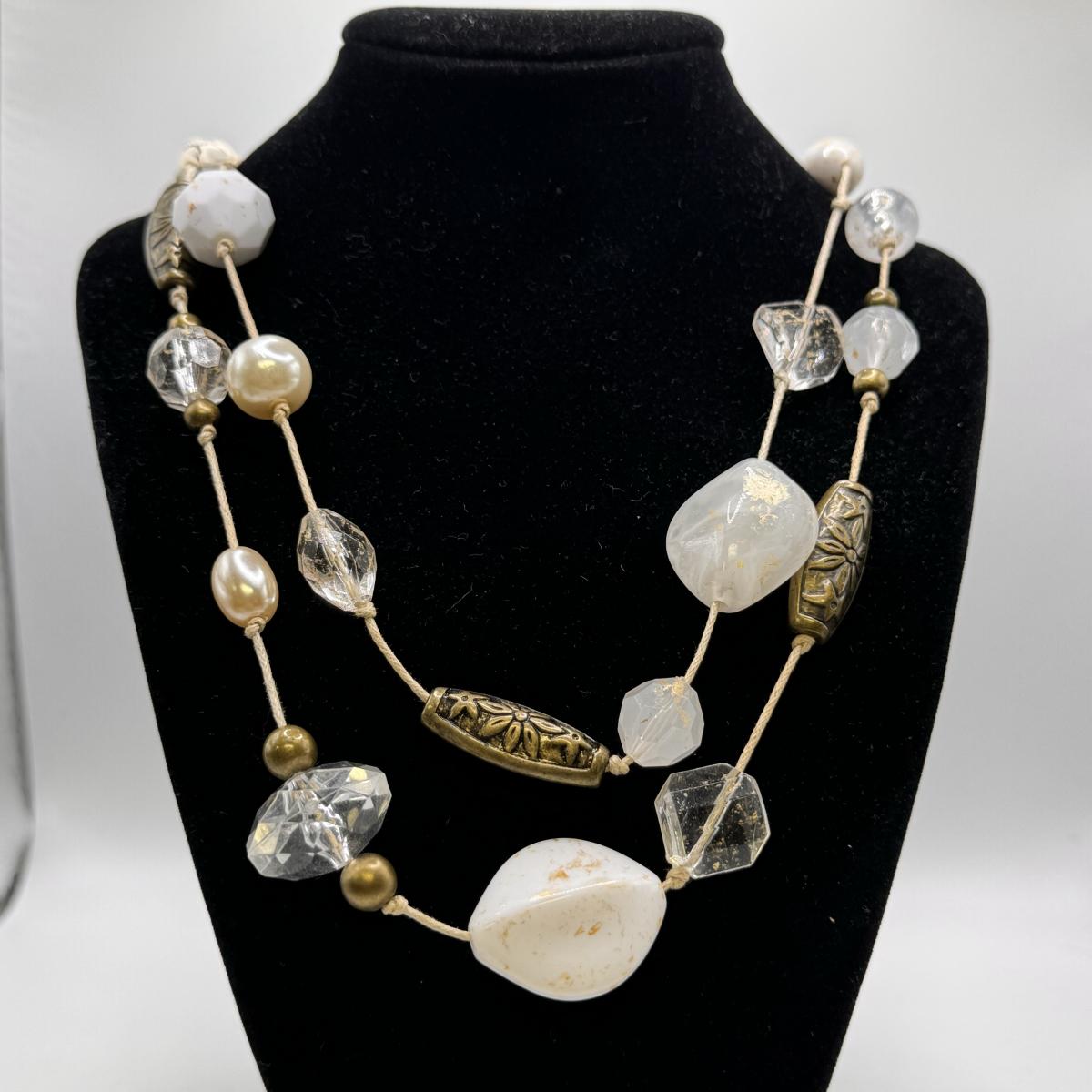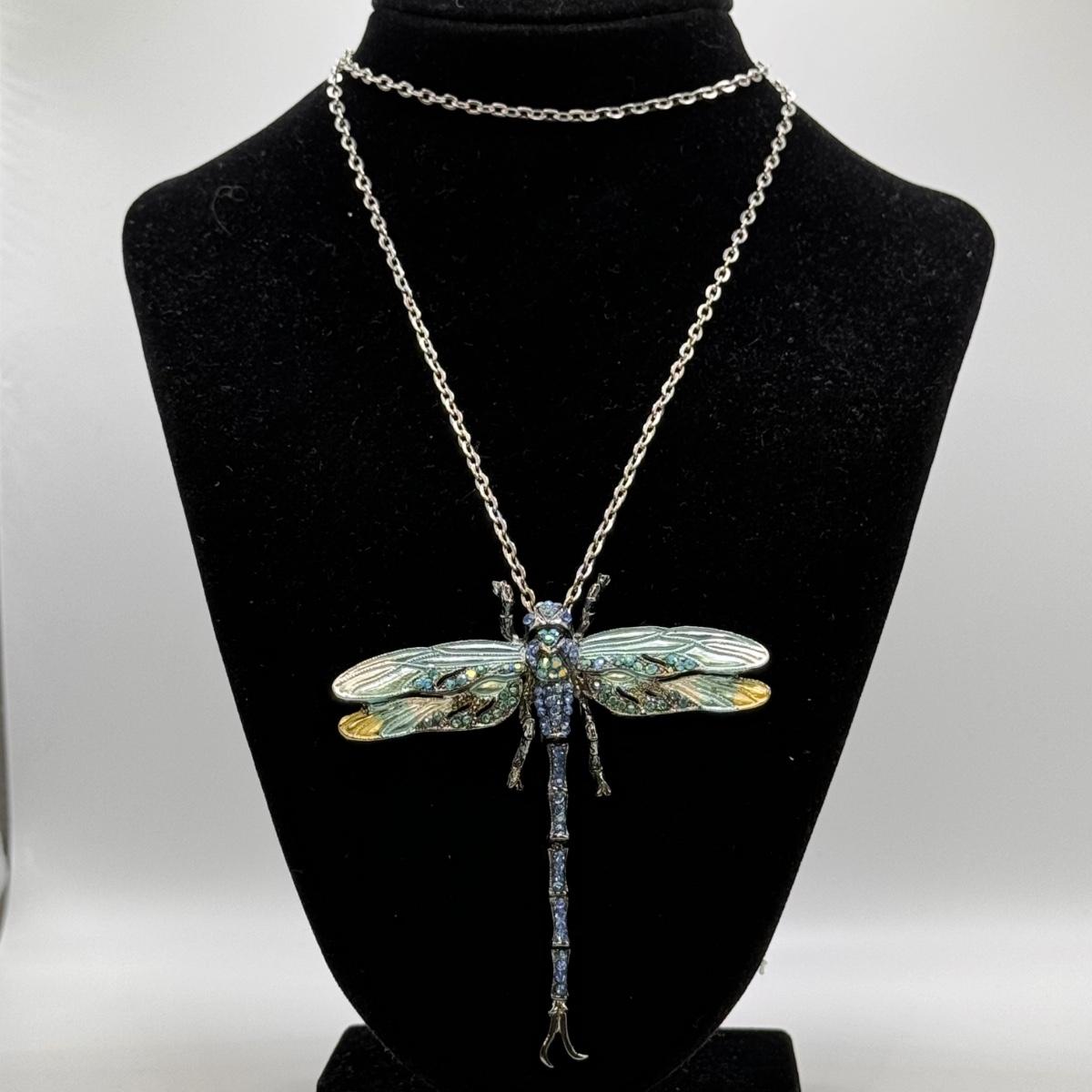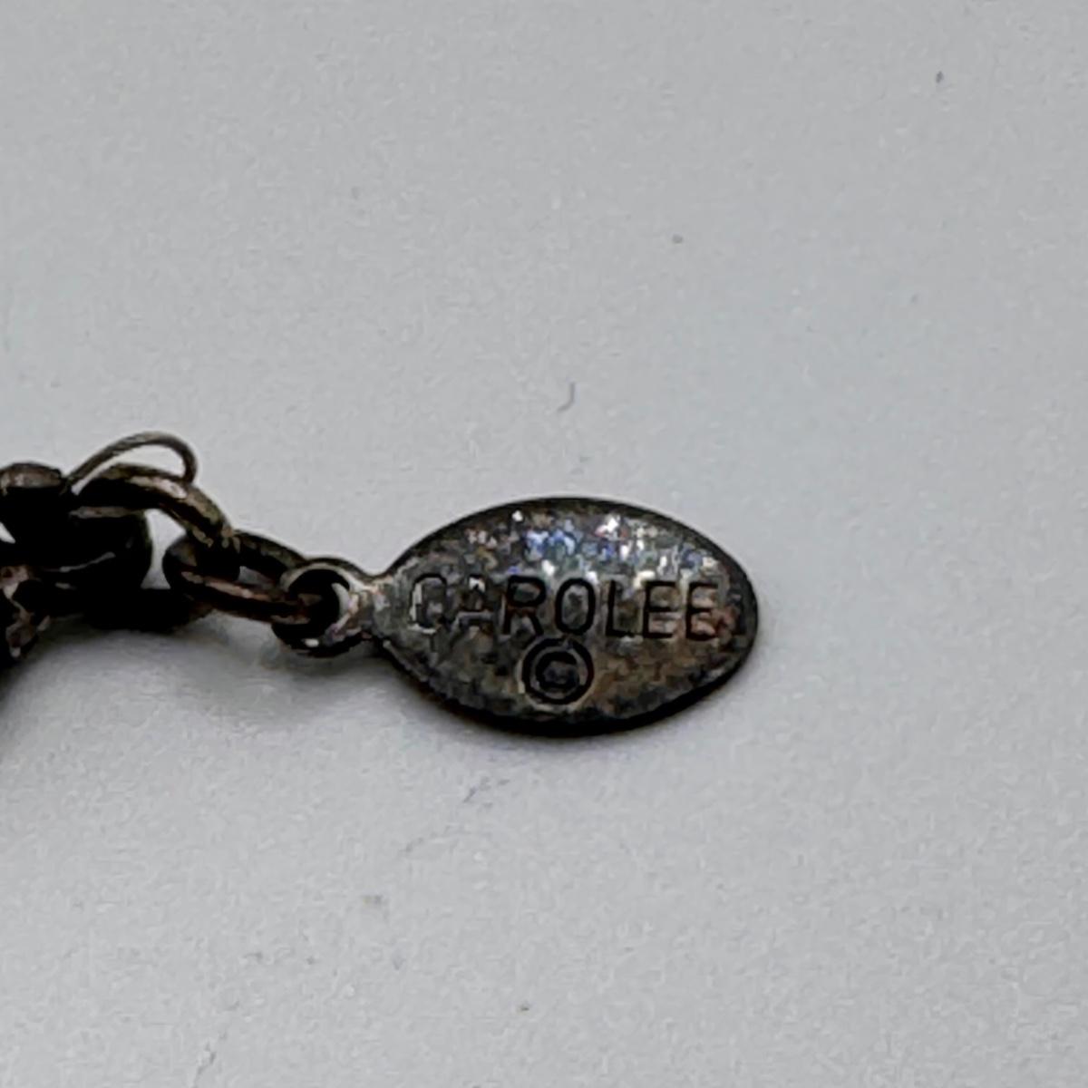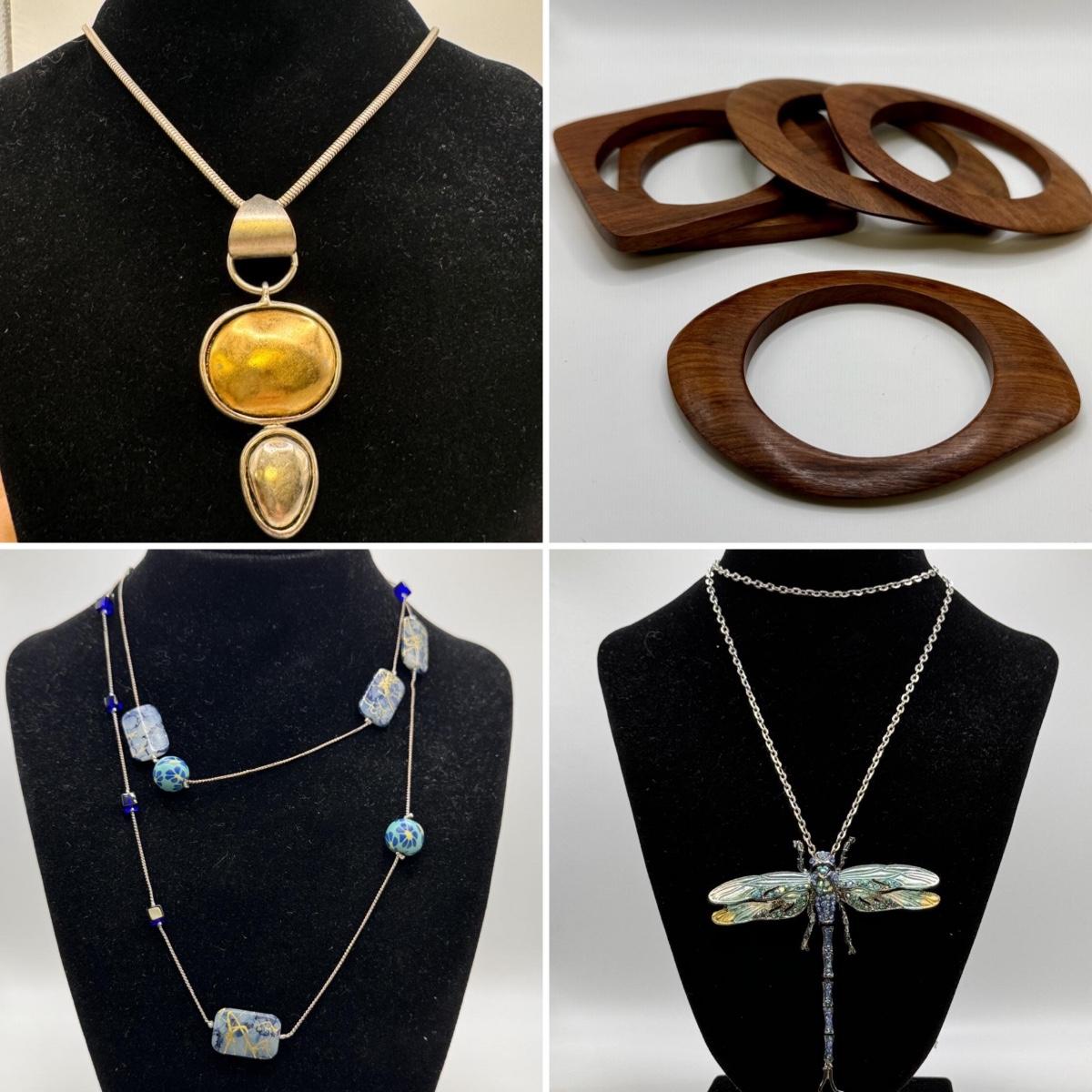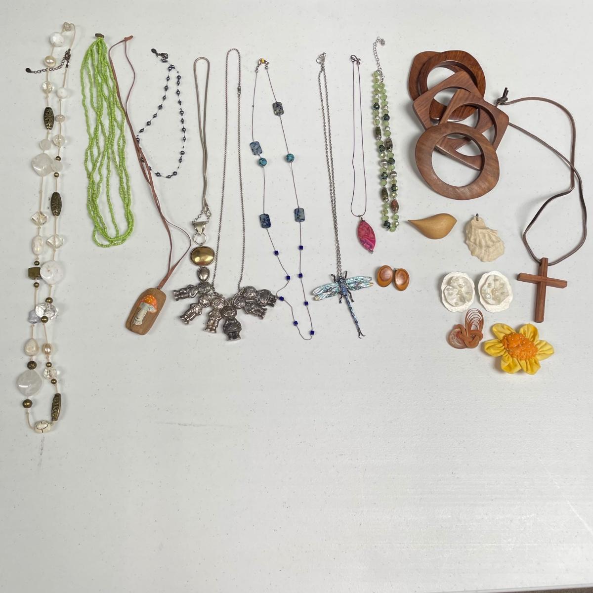 This lot includes five wooden bangles and two wood clip-on earrings. There are also 11 necklaces, including: a long dragonfly necklace, a pink stone pendant on a silver chain, a green multi-layered beaded necklace, a blue beaded necklace, one long clear and bronze beaded necklace, one small blue beaded necklace with 'Carolee' marking, one glistening green beaded necklace, two wooden pendants with ribbon necklaces (one with a cross and one with a mushroom painted onto it), one two toned silver/gold colored pendant with a snake chain, and one silver colored necklace with multiple charms of children (the chain’s clasp and each child are marked 925). The charm necklace measures 32” when fully opened. Also included is one pair of paper maché white stud earrings for pierced ears, one sea shell pendant, and three pins. Known markings are shown in photos.