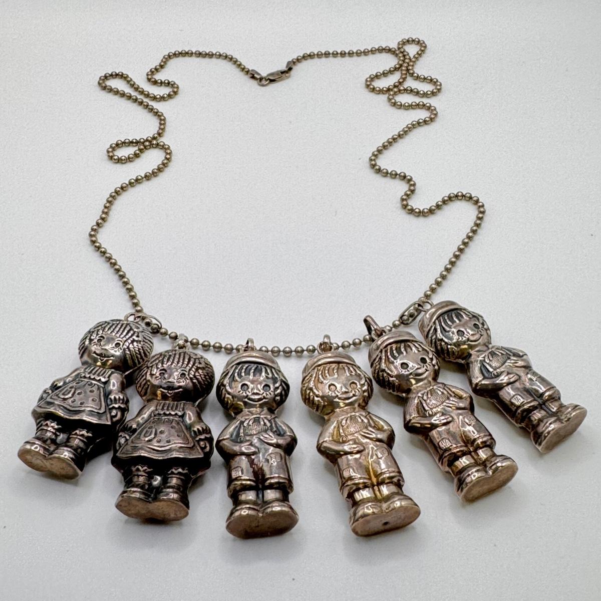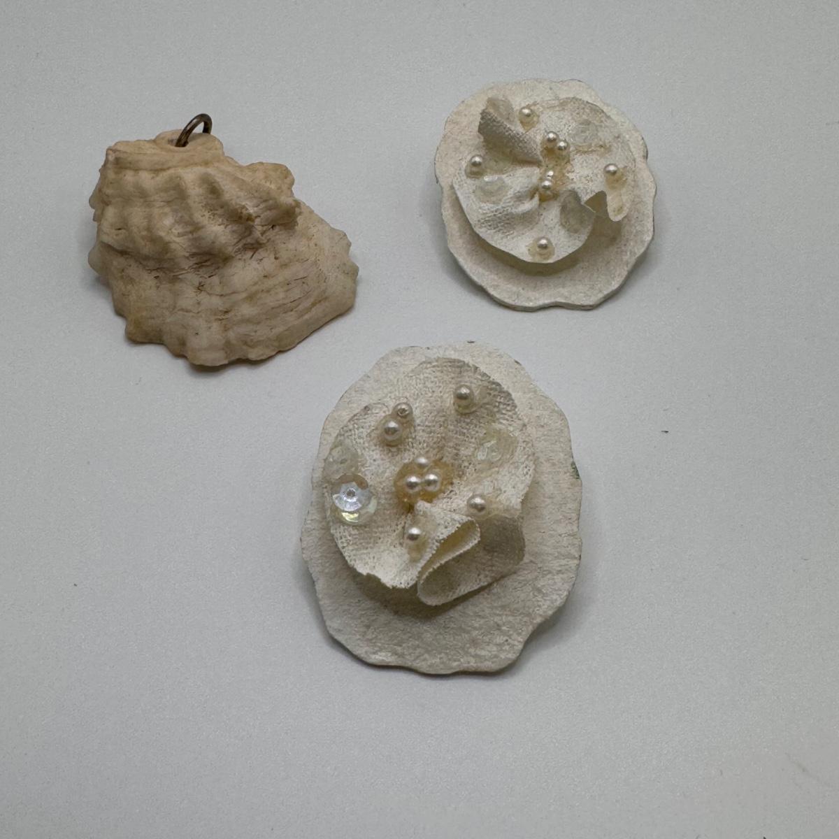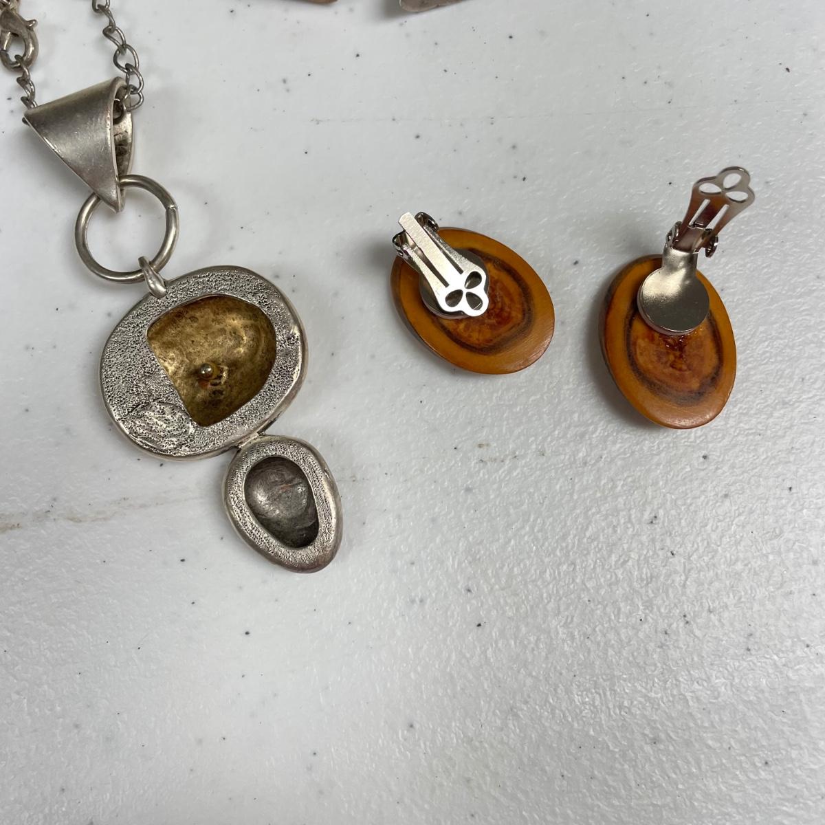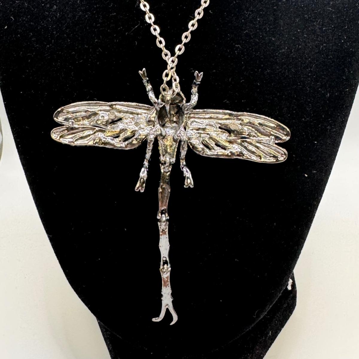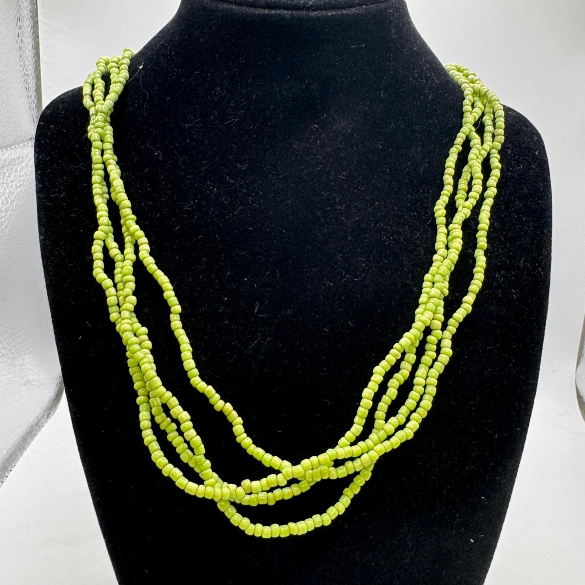 This lot includes five wooden bangles and two wood clip-on earrings. There are also 11 necklaces, including: a long dragonfly necklace, a pink stone pendant on a silver chain, a green multi-layered beaded necklace, a blue beaded necklace, one long clear and bronze beaded necklace, one small blue beaded necklace with 'Carolee' marking, one glistening green beaded necklace, two wooden pendants with ribbon necklaces (one with a cross and one with a mushroom painted onto it), one two toned silver/gold colored pendant with a snake chain, and one silver colored necklace with multiple charms of children (the chain’s clasp and each child are marked 925). The charm necklace measures 32” when fully opened. Also included is one pair of paper maché white stud earrings for pierced ears, one sea shell pendant, and three pins. Known markings are shown in photos.