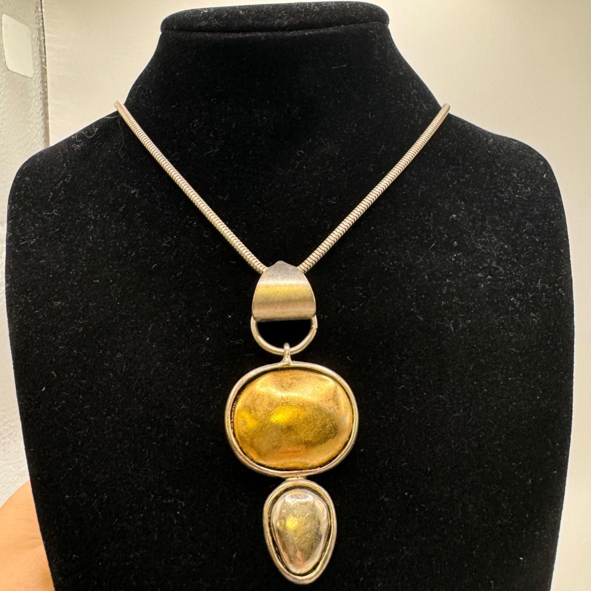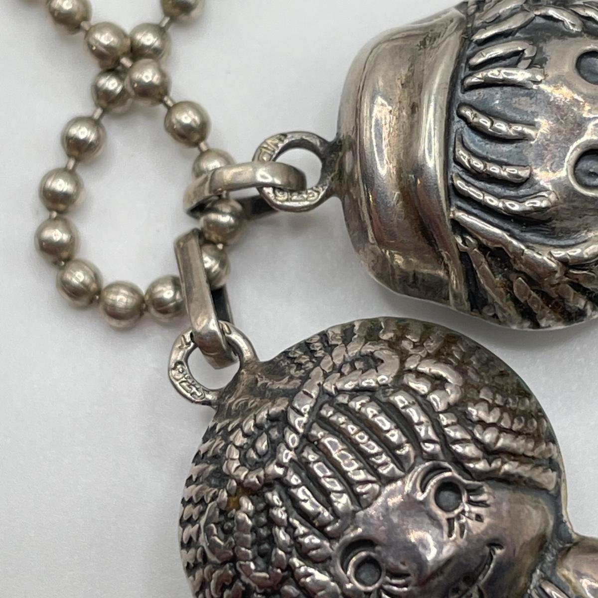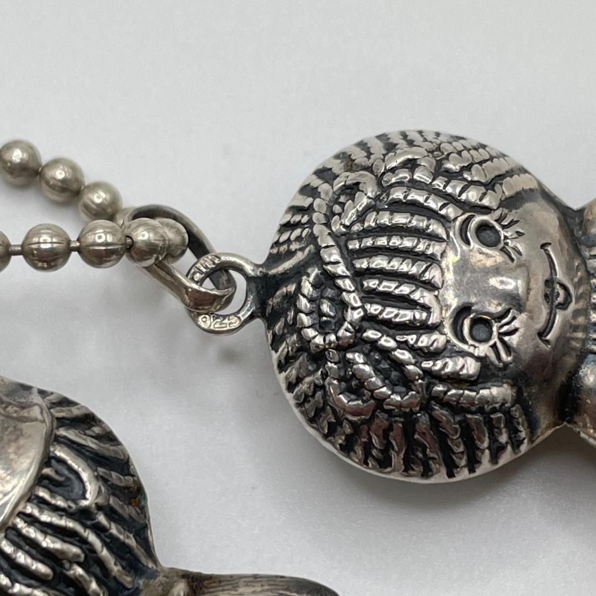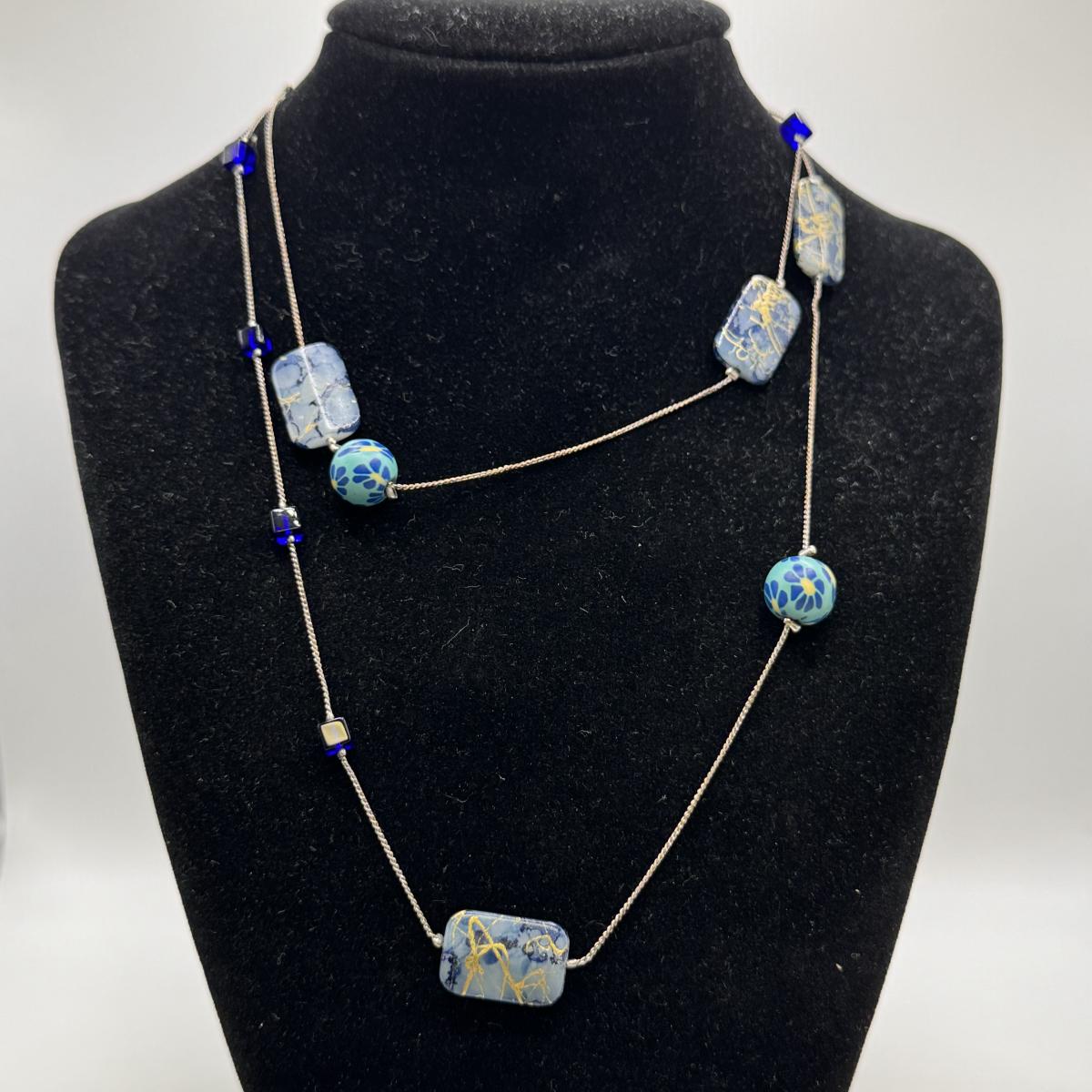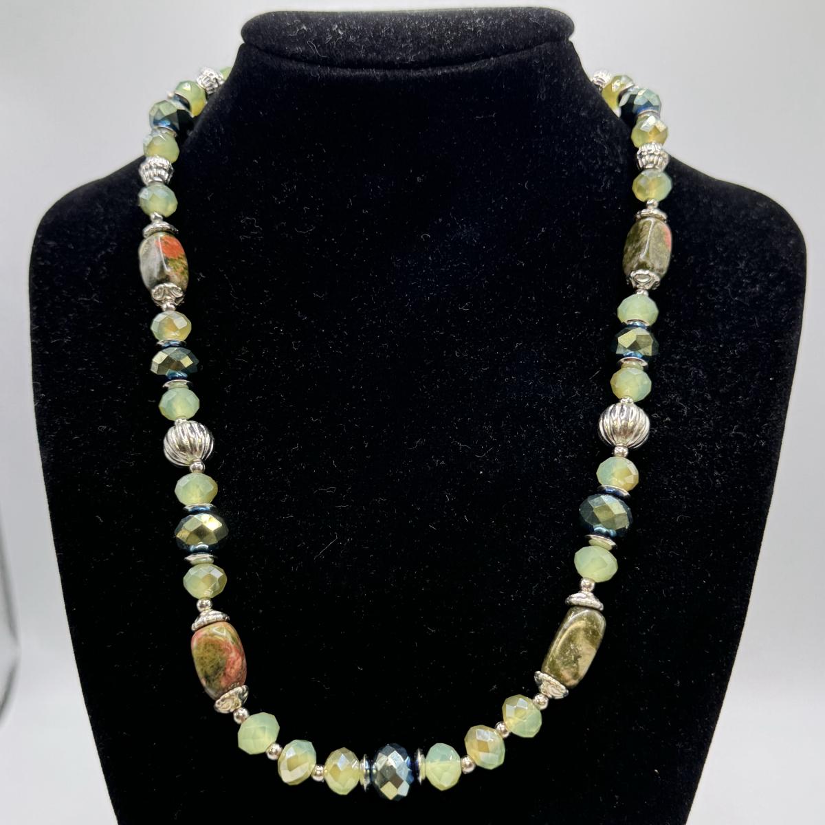 This lot includes five wooden bangles and two wood clip-on earrings. There are also 11 necklaces, including: a long dragonfly necklace, a pink stone pendant on a silver chain, a green multi-layered beaded necklace, a blue beaded necklace, one long clear and bronze beaded necklace, one small blue beaded necklace with 'Carolee' marking, one glistening green beaded necklace, two wooden pendants with ribbon necklaces (one with a cross and one with a mushroom painted onto it), one two toned silver/gold colored pendant with a snake chain, and one silver colored necklace with multiple charms of children (the chain’s clasp and each child are marked 925). The charm necklace measures 32” when fully opened. Also included is one pair of paper maché white stud earrings for pierced ears, one sea shell pendant, and three pins. Known markings are shown in photos.