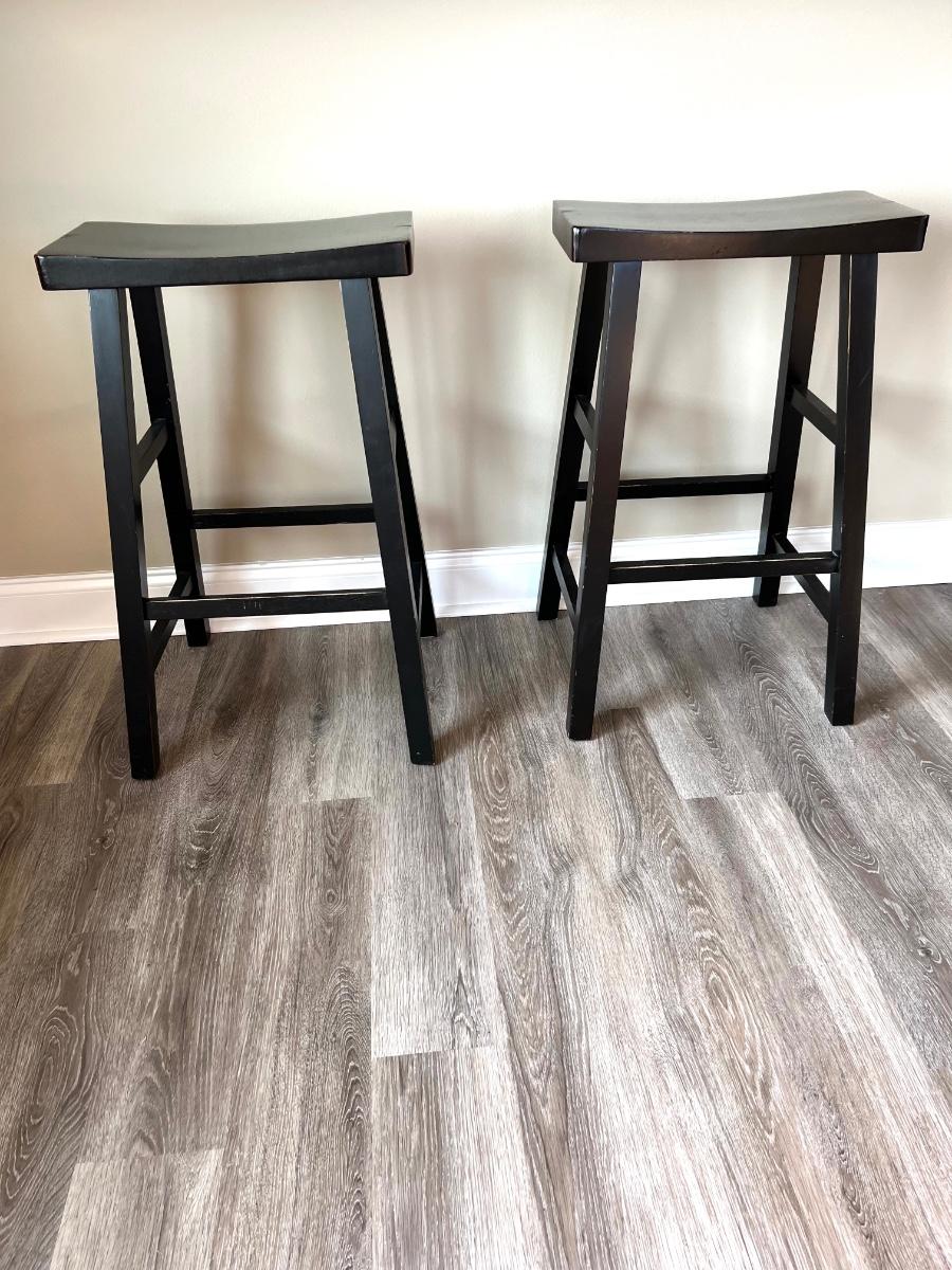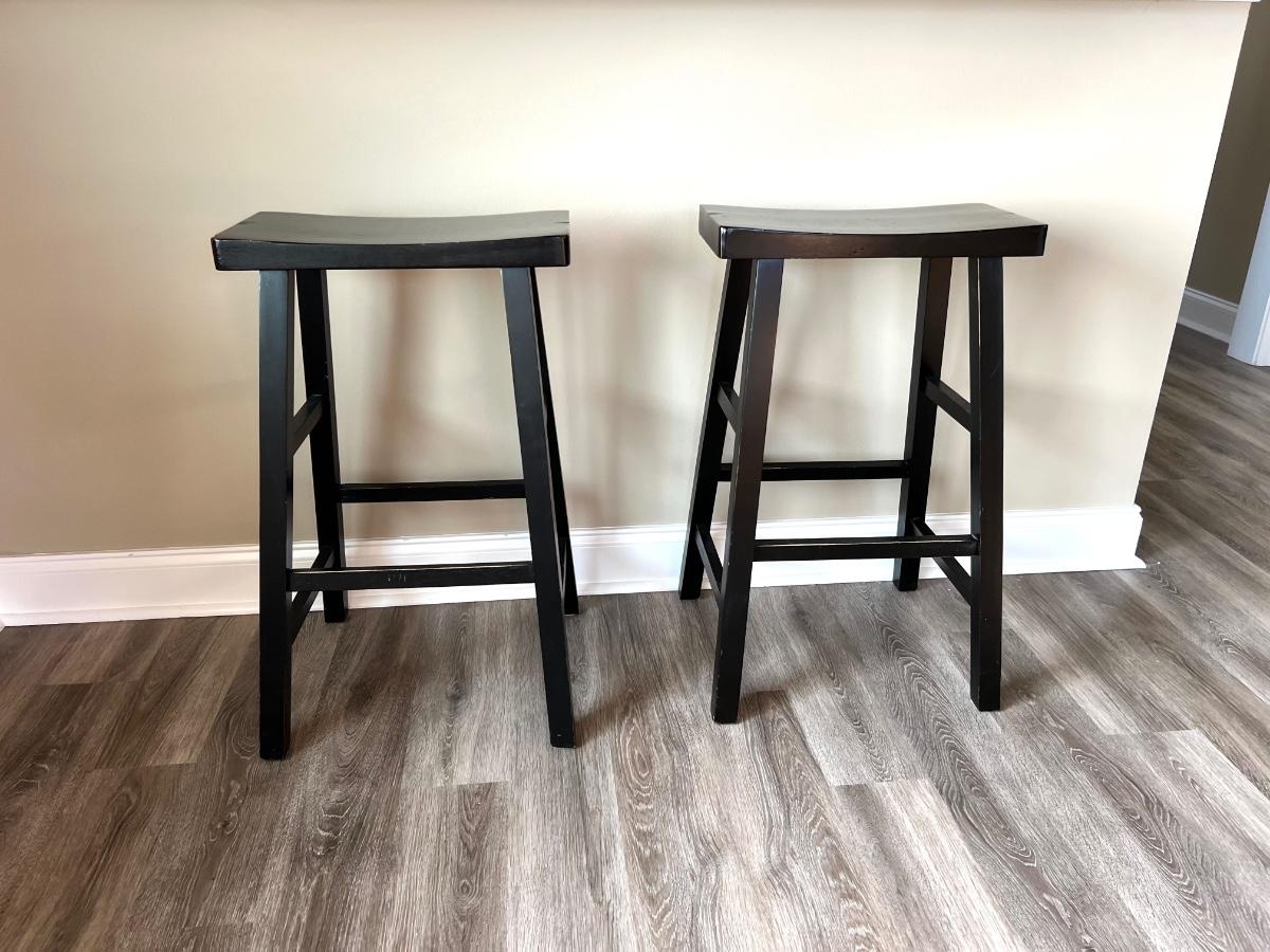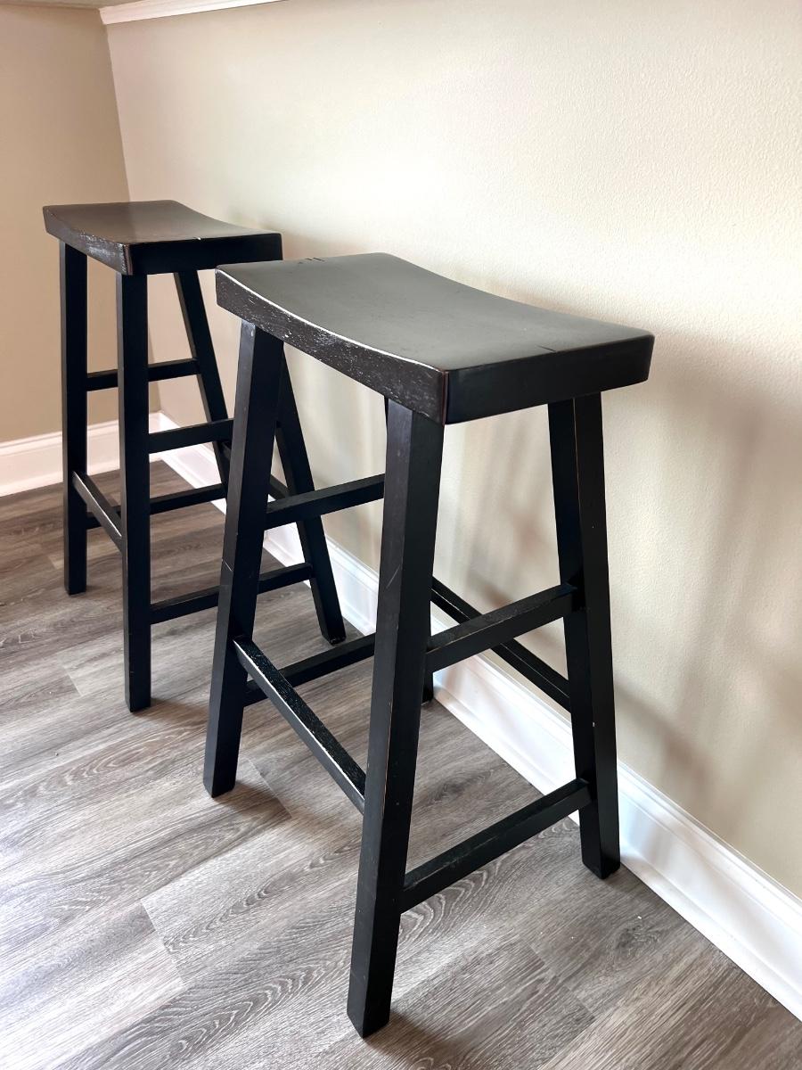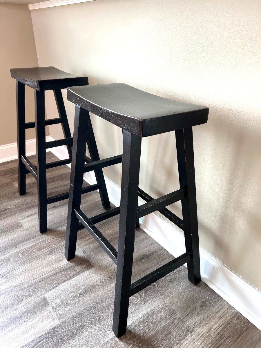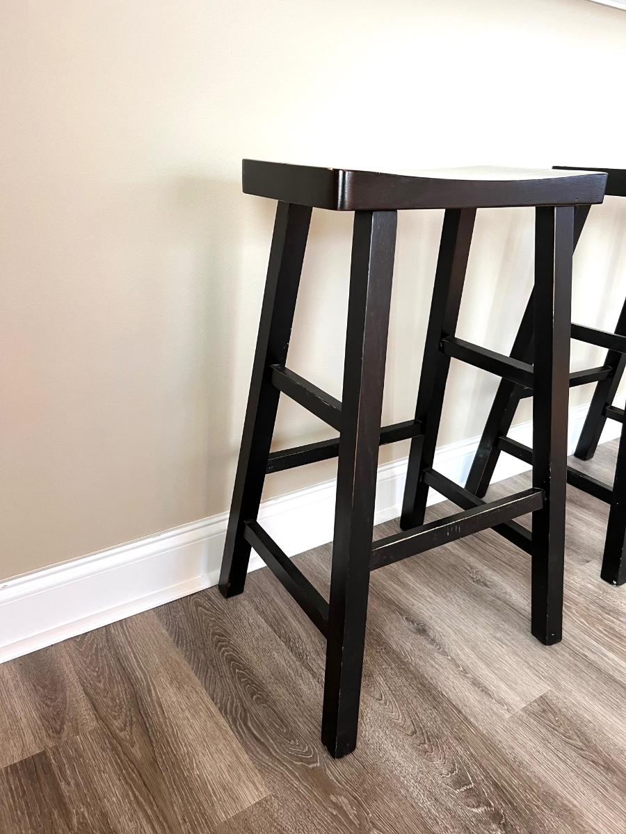 Distressed Dark Wooden Barstool Pair made in Malaysia. Measures 29 inches Tall, 17 1/2 inches wide and 16 inches deep.