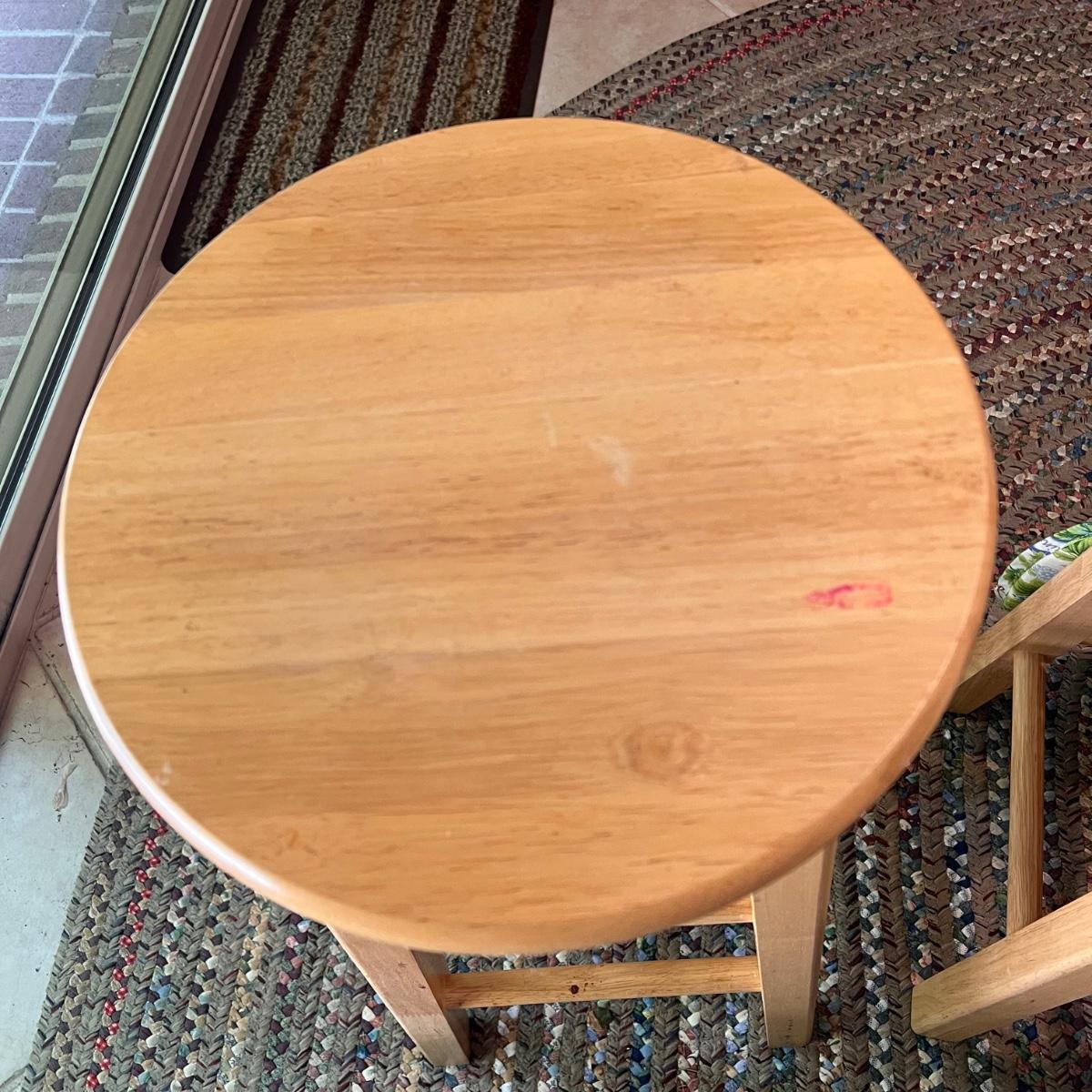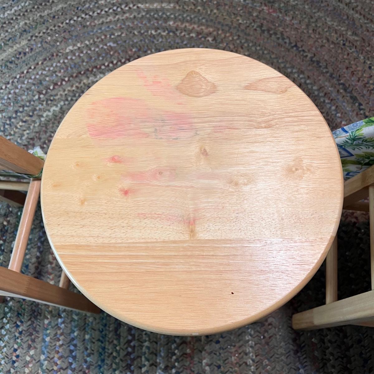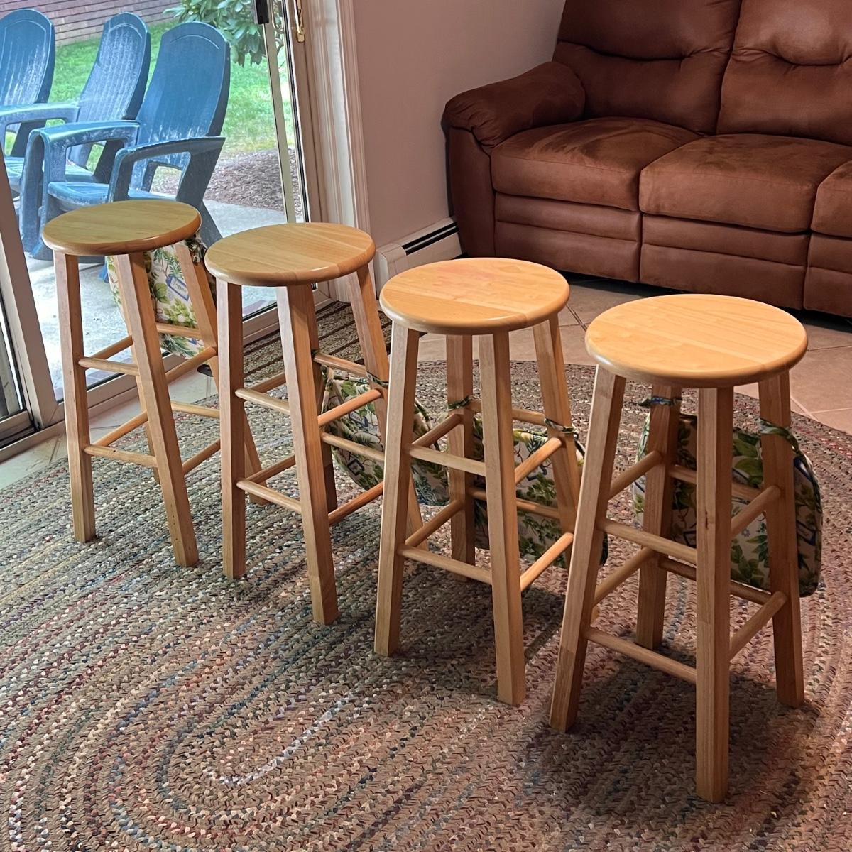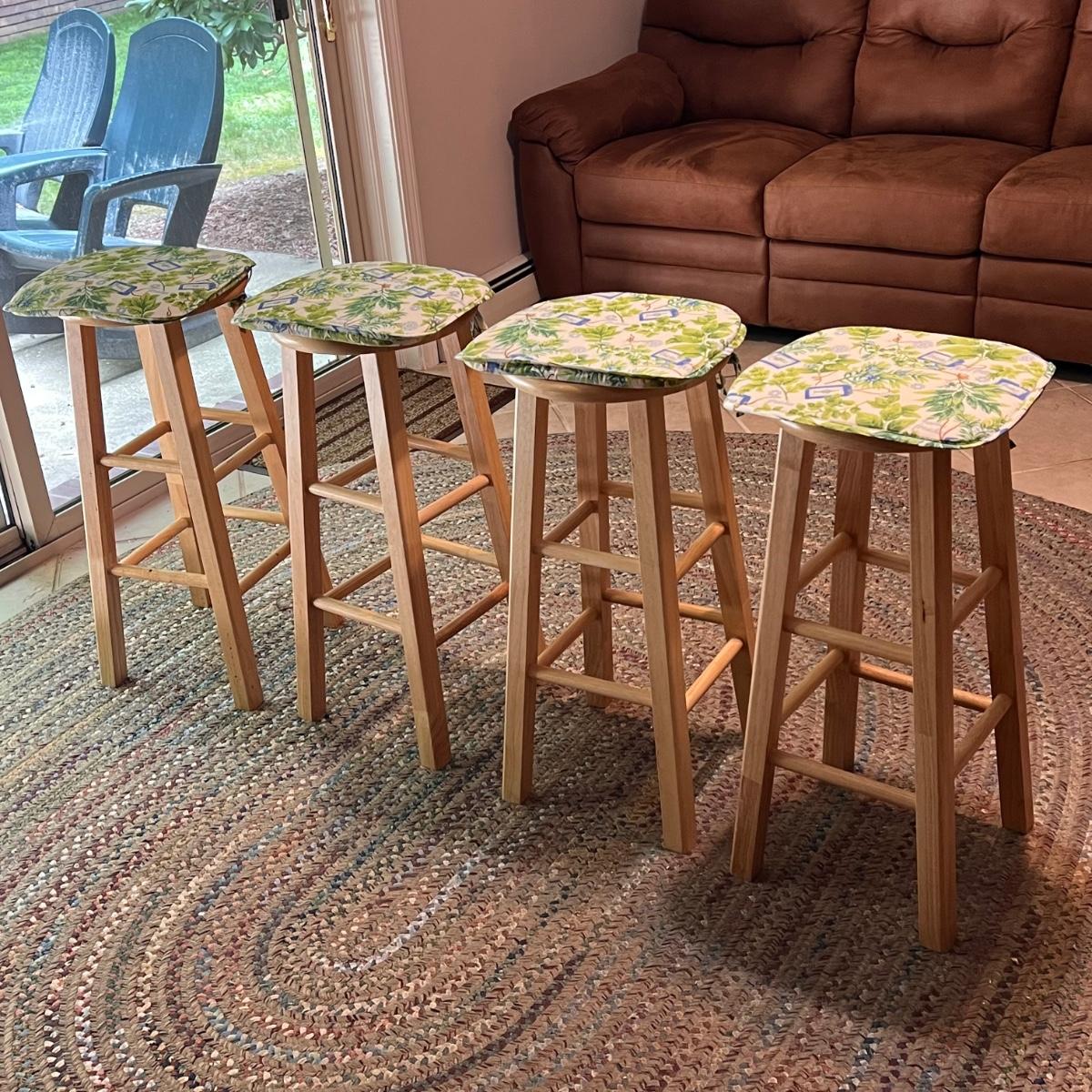 Lot includes four wooden barstools with removable cushions tied onto each one. The barstools are in nice condition, aside from the stains on the top of two - see pictures included. The stools measure 13”D x 29”H. Local pickup only.