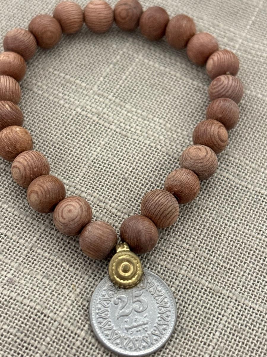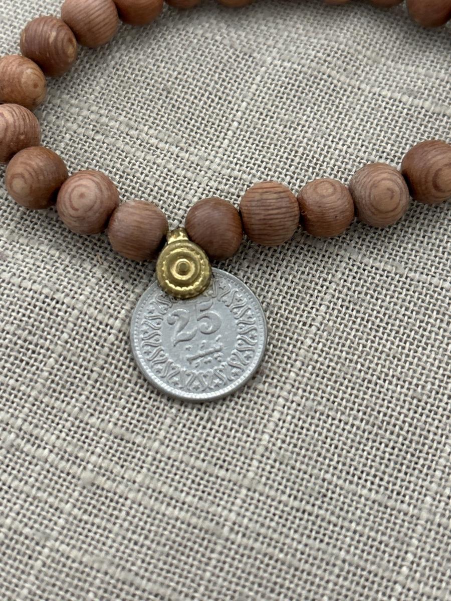 Wooden beaded bracelet with old coin