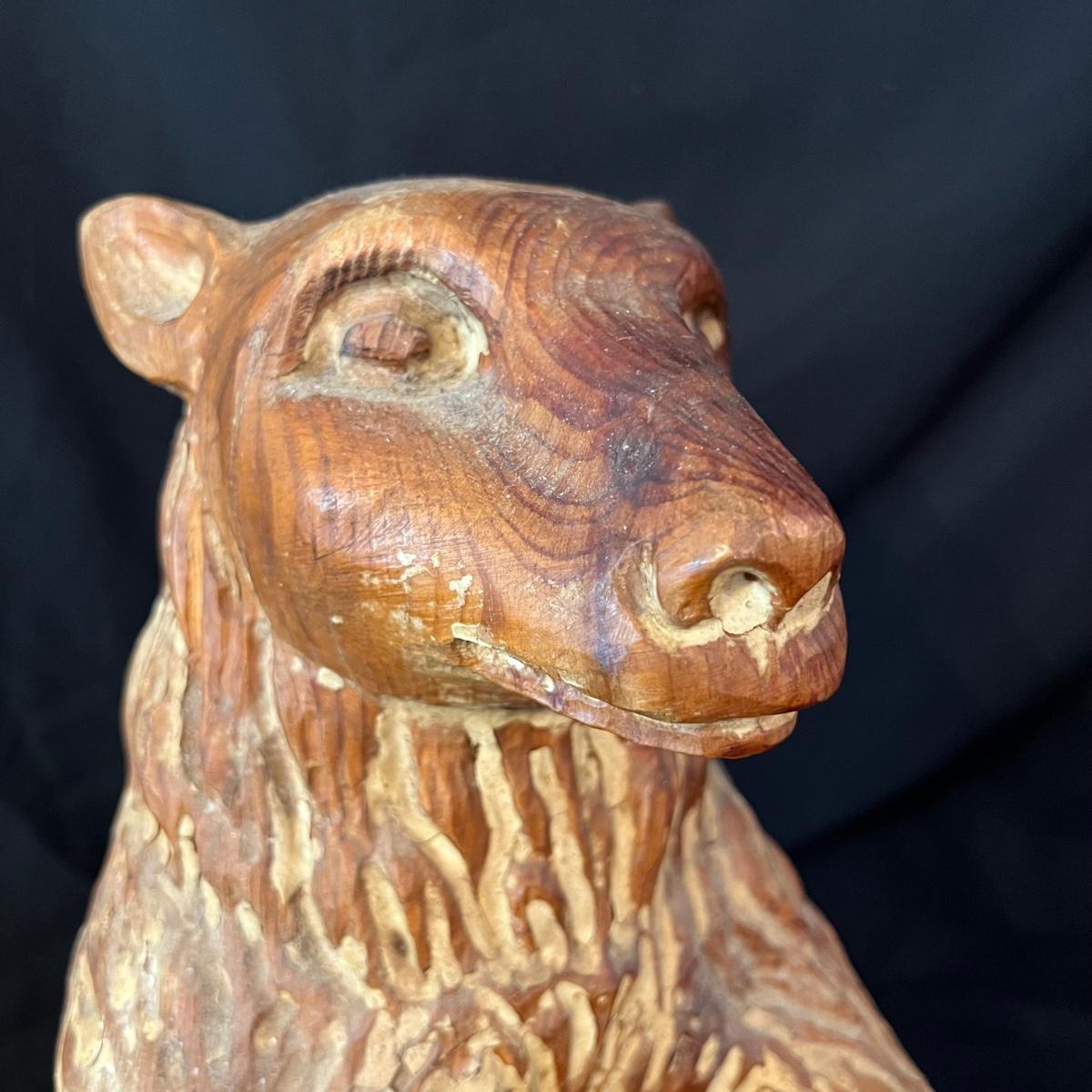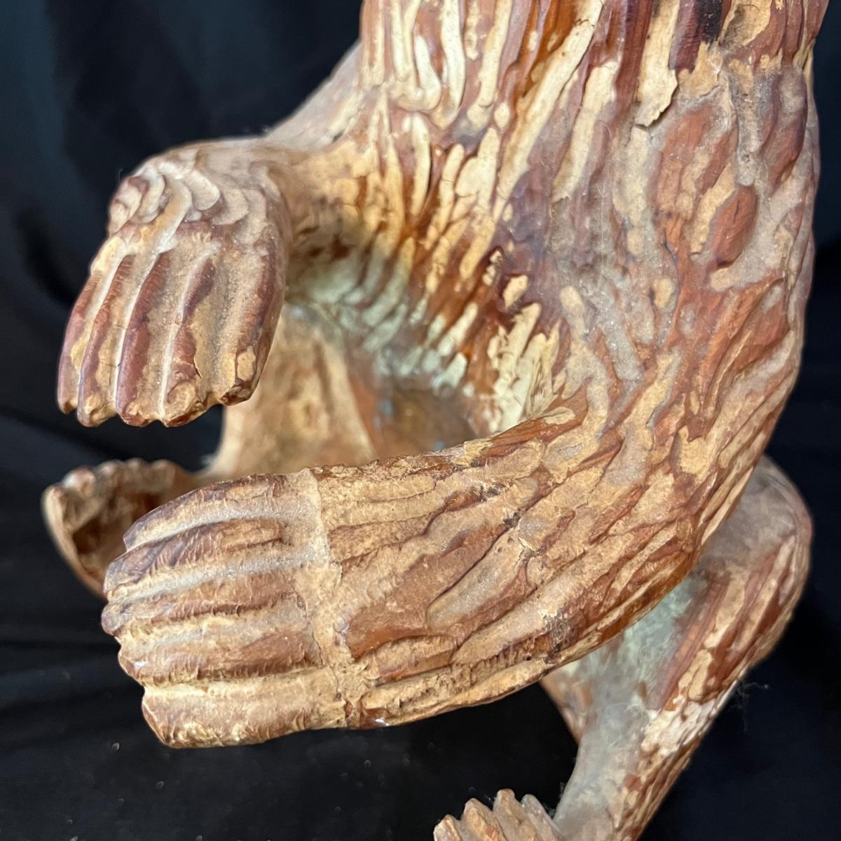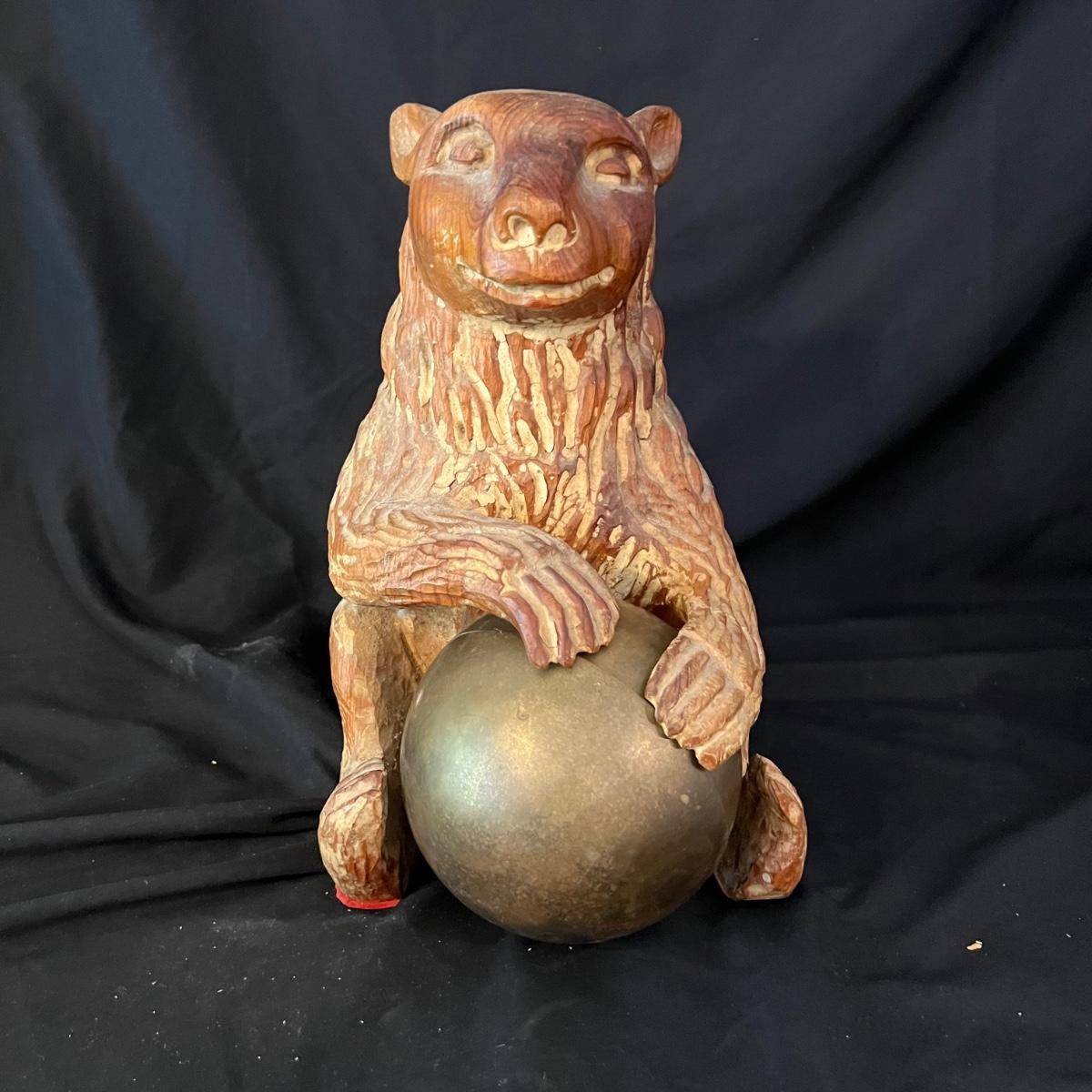 This sculpture of a wooden bear and a brass ball is potentially Inspired by or actually a carved wood bear by Sarried. The piece is circa mid-20th century modern vintage and the finish is intentionally distressed. It measures approximately 8" x 9" x 13.25"H.