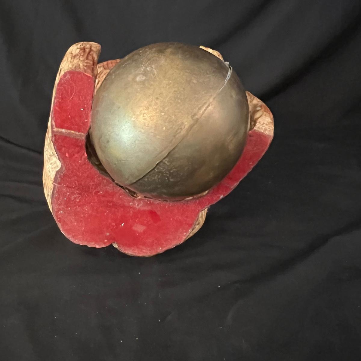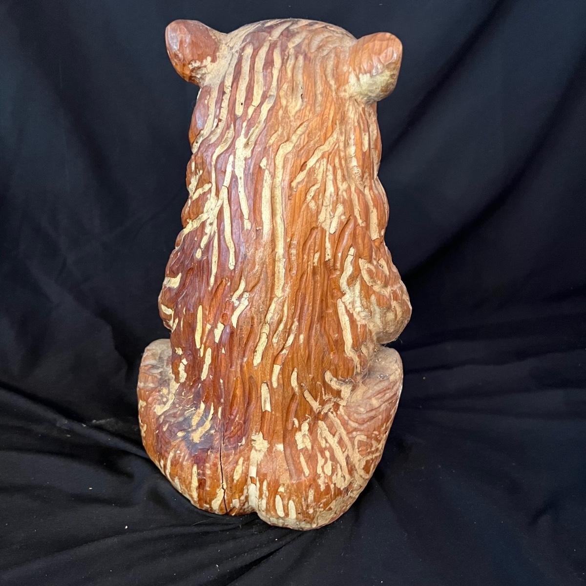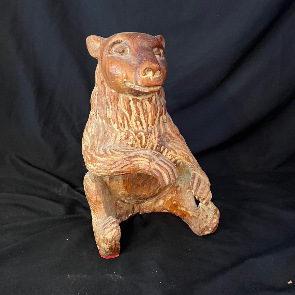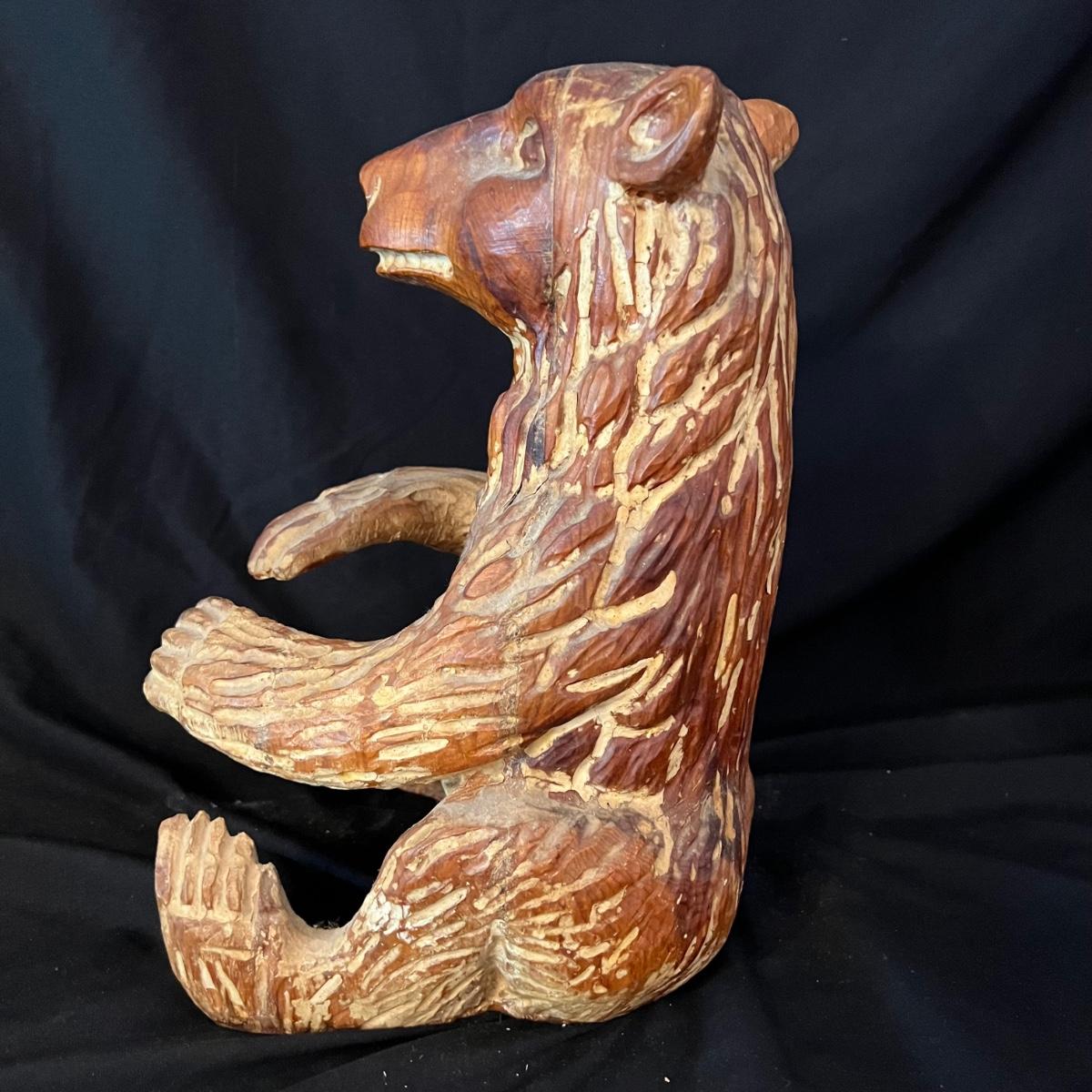 This sculpture of a wooden bear and a brass ball is potentially Inspired by or actually a carved wood bear by Sarried. The piece is circa mid-20th century modern vintage and the finish is intentionally distressed. It measures approximately 8" x 9" x 13.25"H.