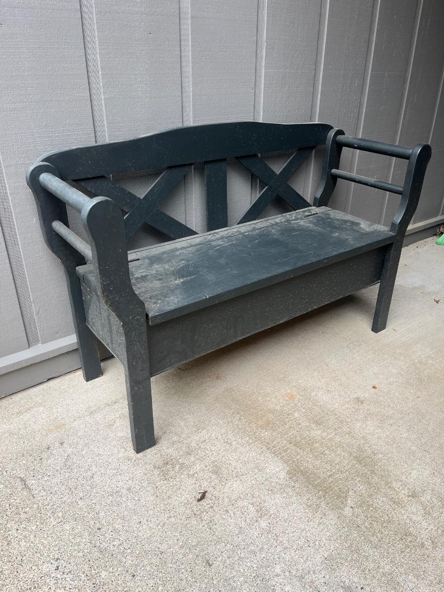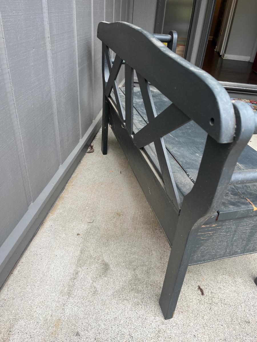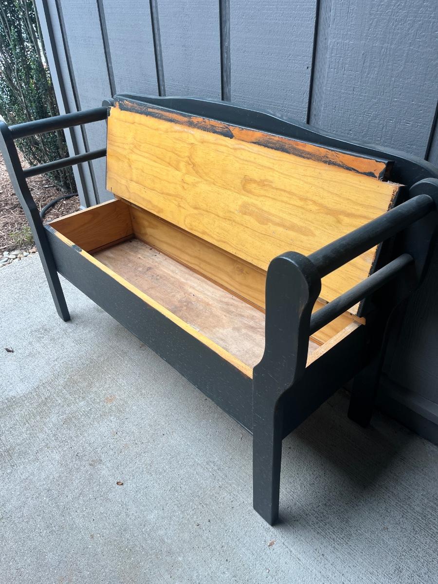 Lot includes a black painted wooden bench with storage under the seat. The bench is sturdy and measures 17.5" x 49" x 30"H with a 17" seat height.