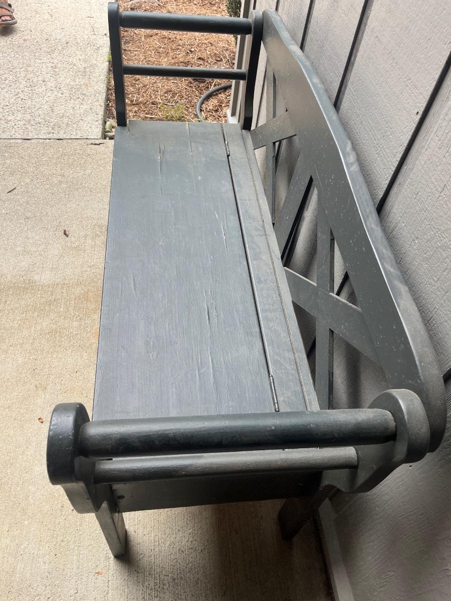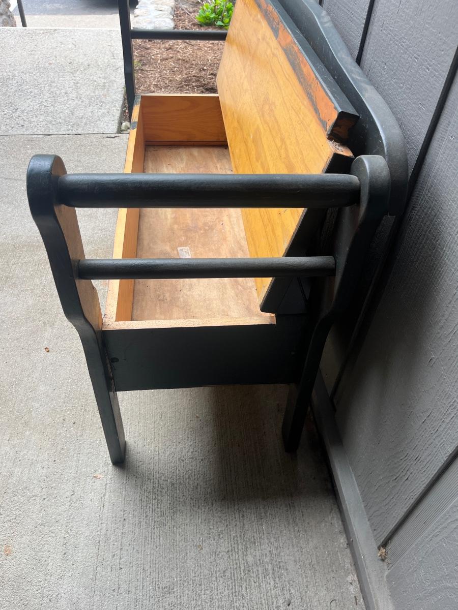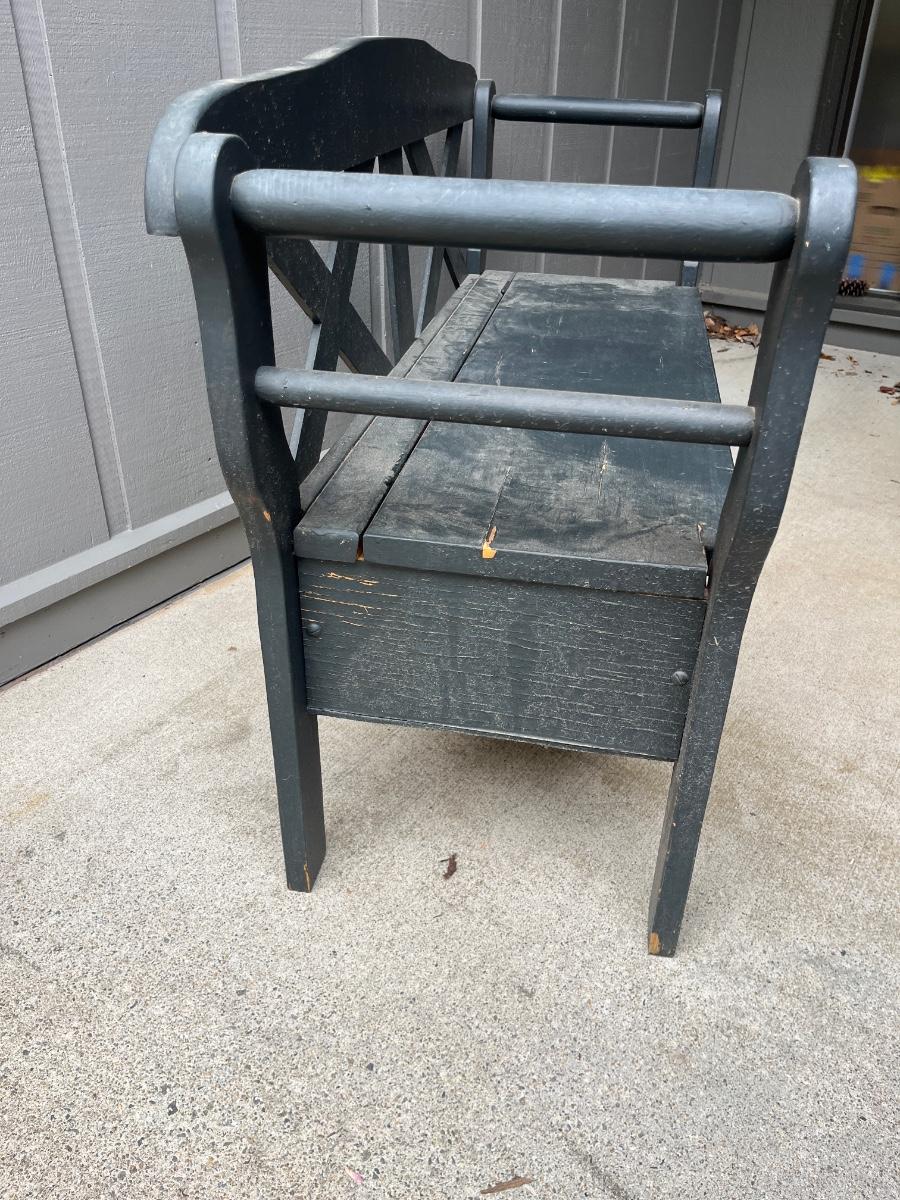 Lot includes a black painted wooden bench with storage under the seat. The bench is sturdy and measures 17.5" x 49" x 30"H with a 17" seat height.