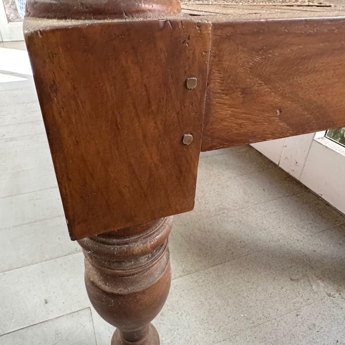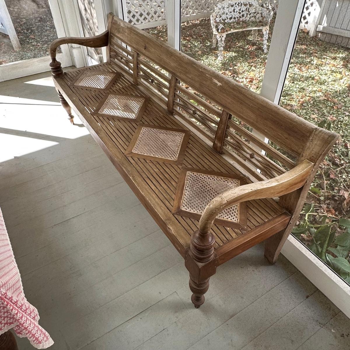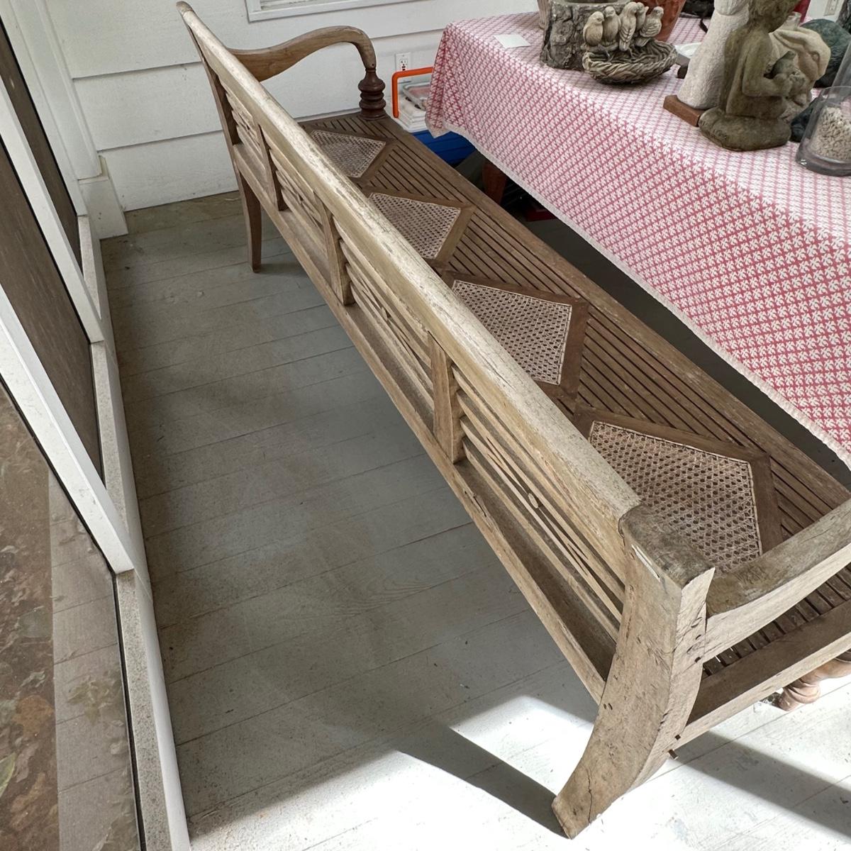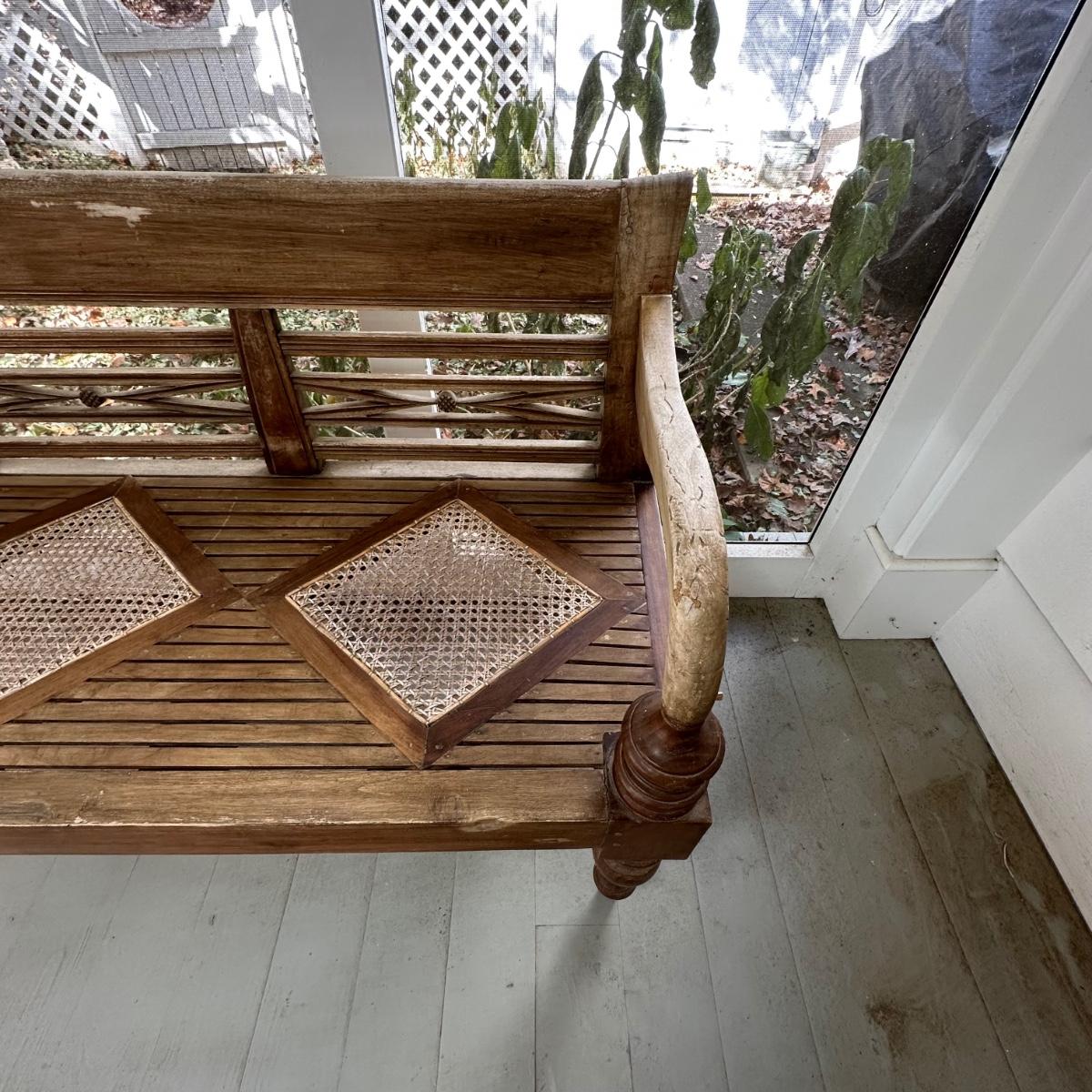 Four seat wooden bench with woven seat accents. Measures 83” x 22” x 34”H. Bench has some wear from age, but is still in good, sturdy condition. Local pickup only. Winning bidder must bring assistance to help move and load this item due to its weight and/or size.