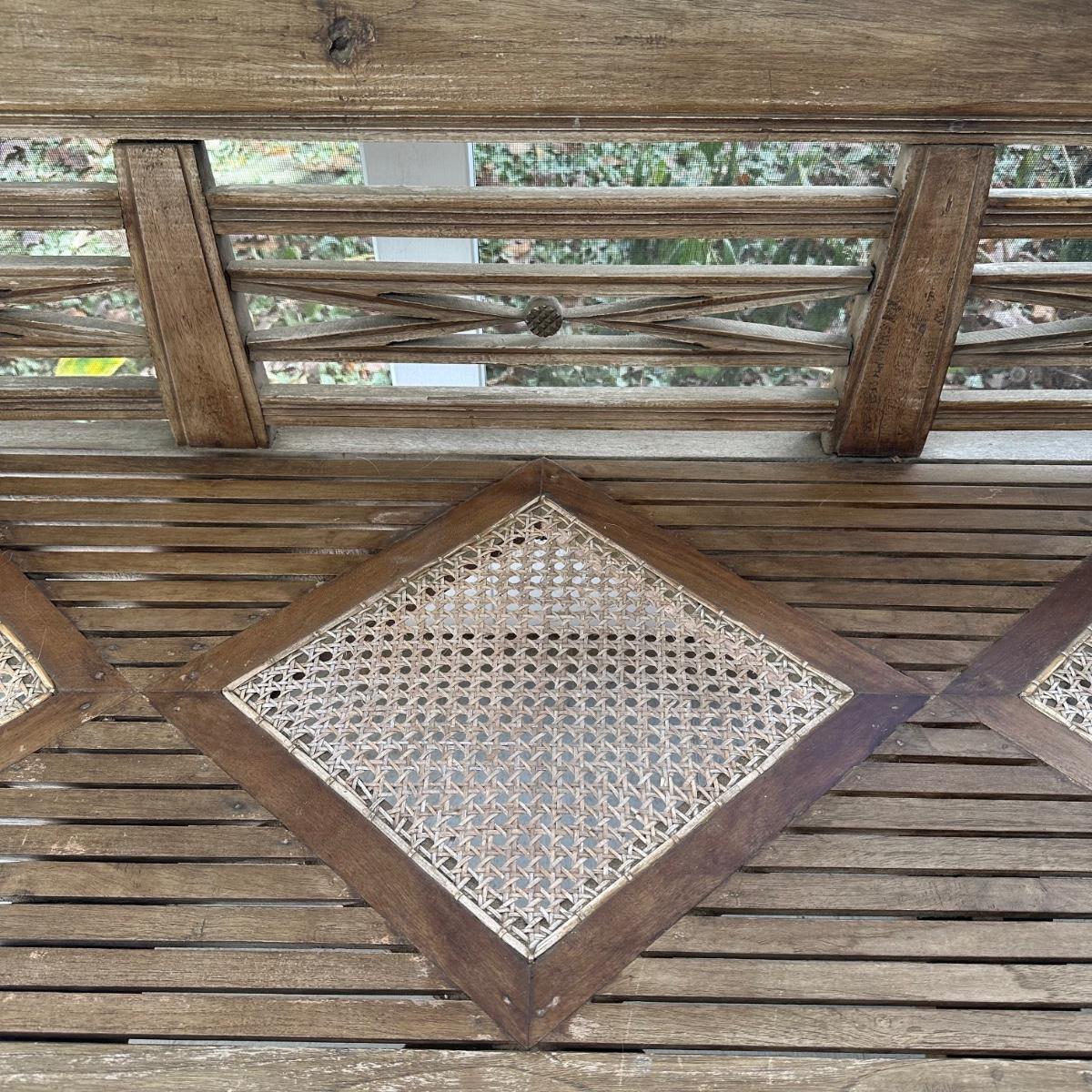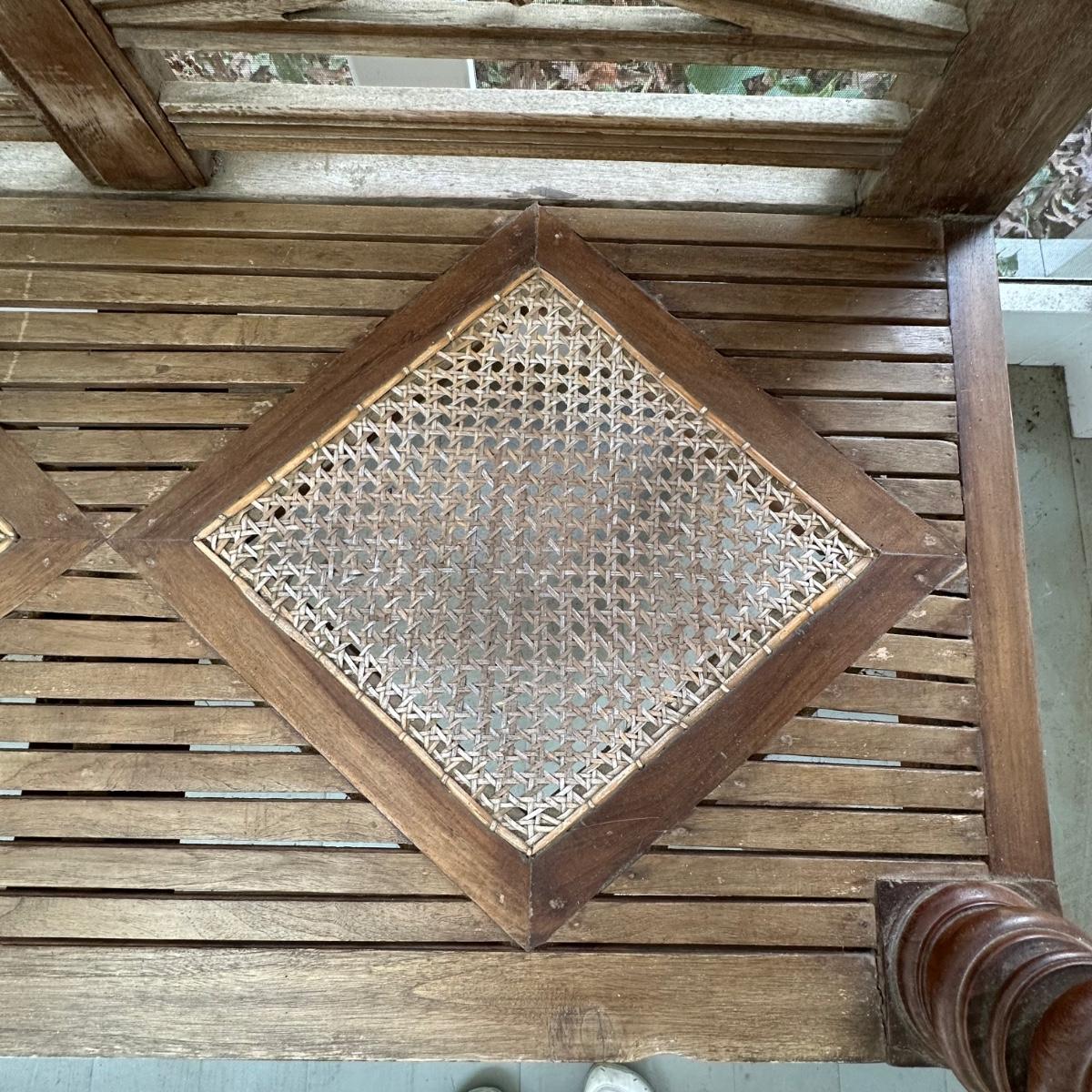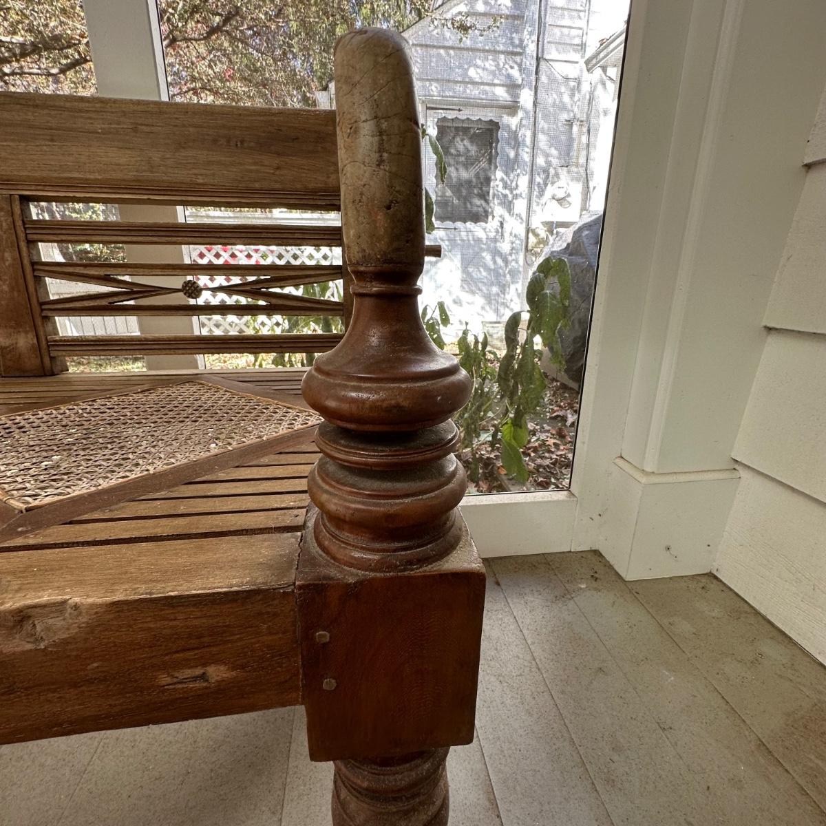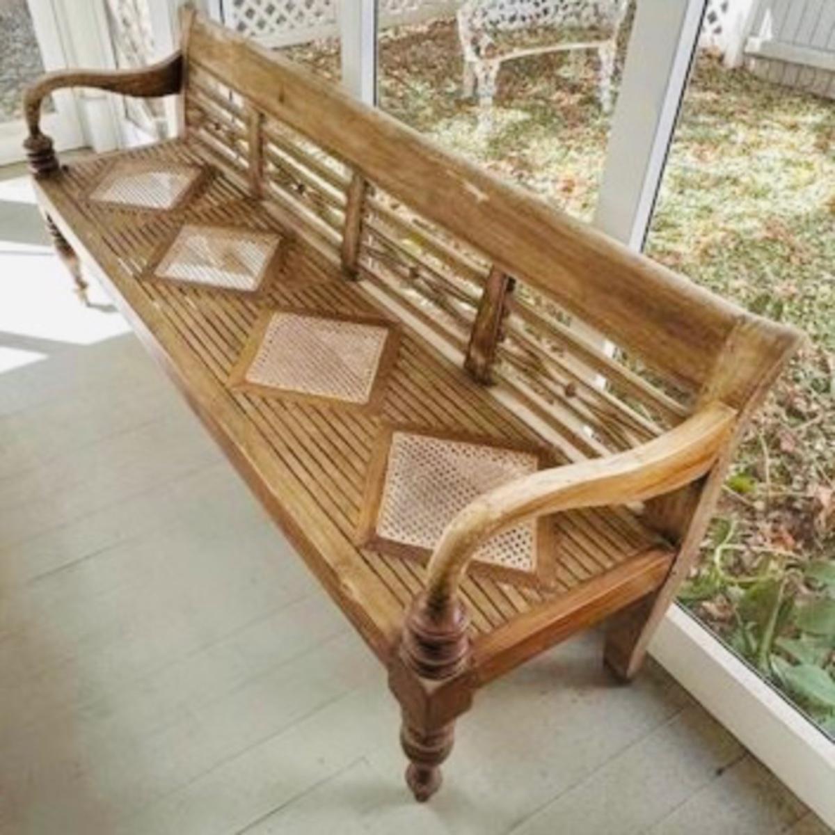 Four seat wooden bench with woven seat accents. Measures 83” x 22” x 34”H. Bench has some wear from age, but is still in good, sturdy condition. Local pickup only. Winning bidder must bring assistance to help move and load this item due to its weight and/or size.