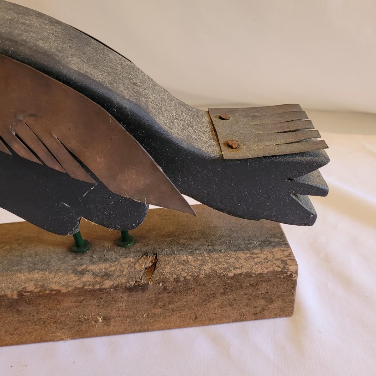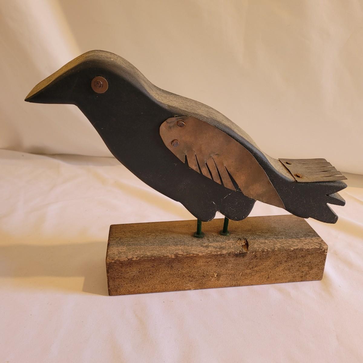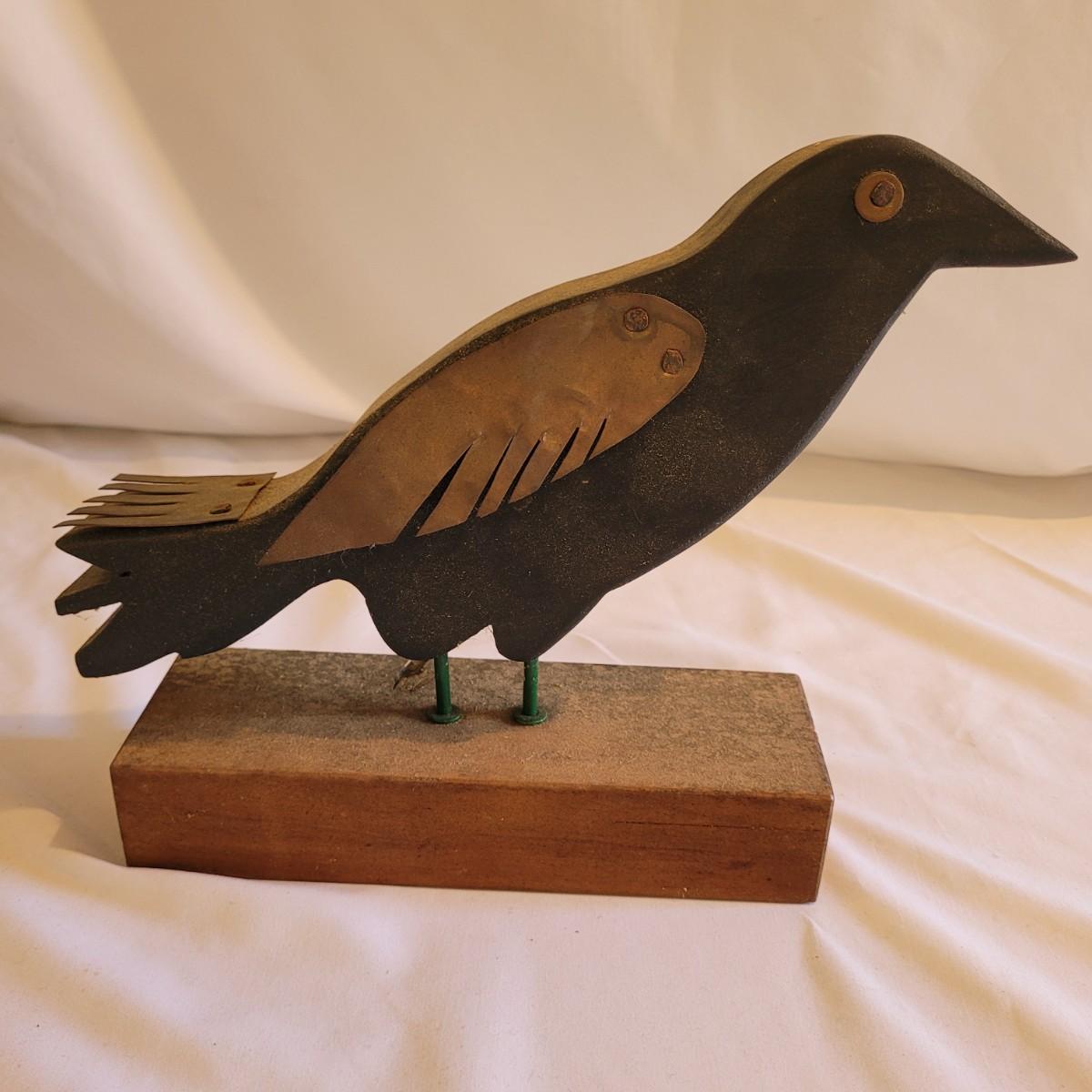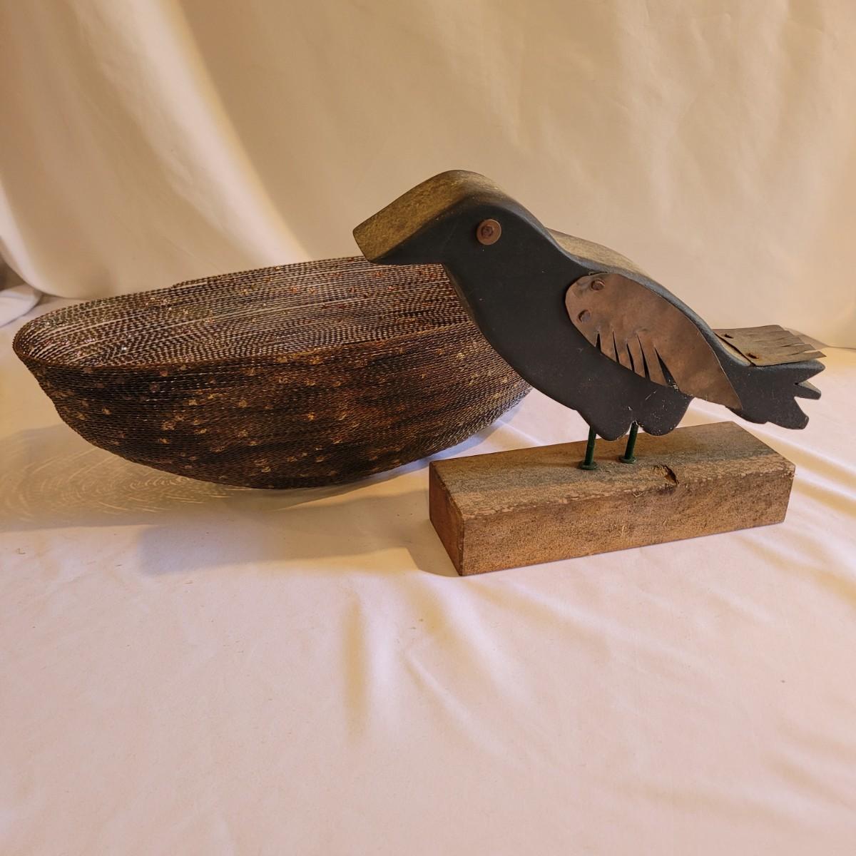 This lot includes a wooden and metal sculpture of a bird and a woven metal basket. The bird is mounted on a wooden block and features wings and feathers made from sheet metal. It is signed and dated on the bottom and appears to be an original piece. The basket is made from woven metal and features spot welding and a soft coating. Basket measures 18" x 7" x 5"H.