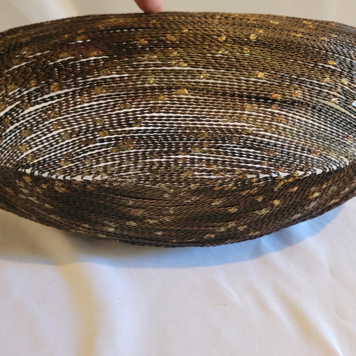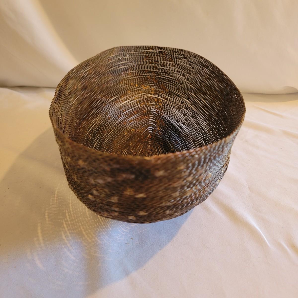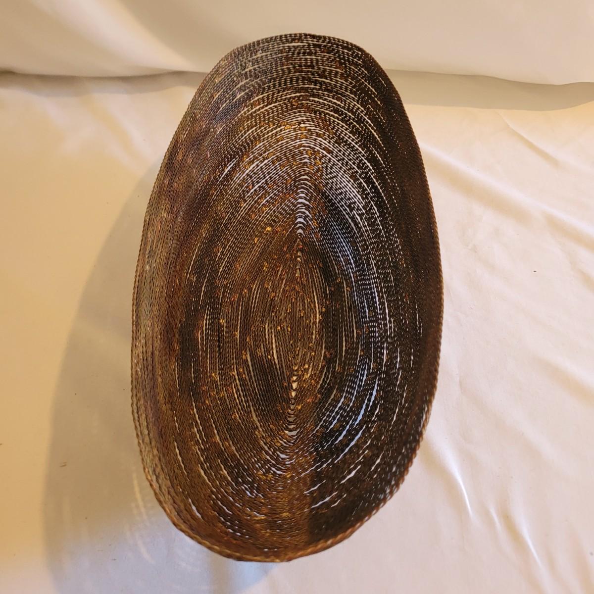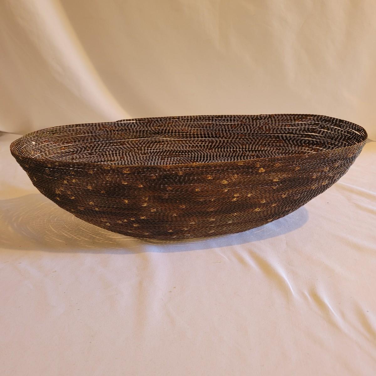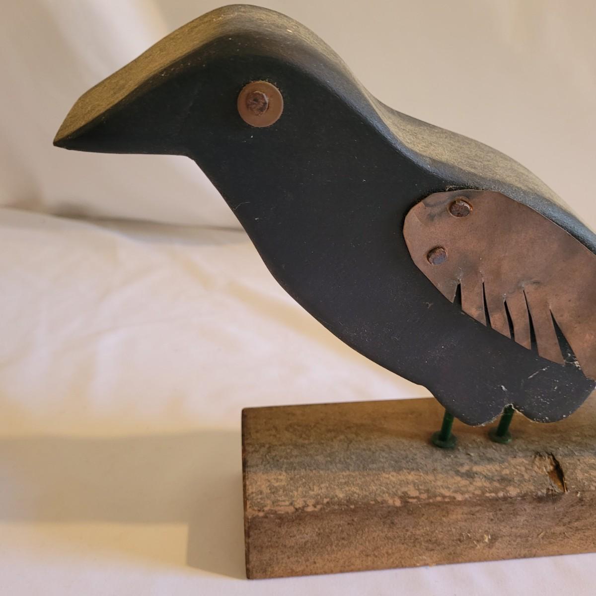 This lot includes a wooden and metal sculpture of a bird and a woven metal basket. The bird is mounted on a wooden block and features wings and feathers made from sheet metal. It is signed and dated on the bottom and appears to be an original piece. The basket is made from woven metal and features spot welding and a soft coating. Basket measures 18" x 7" x 5"H.