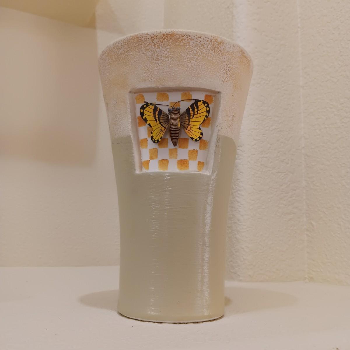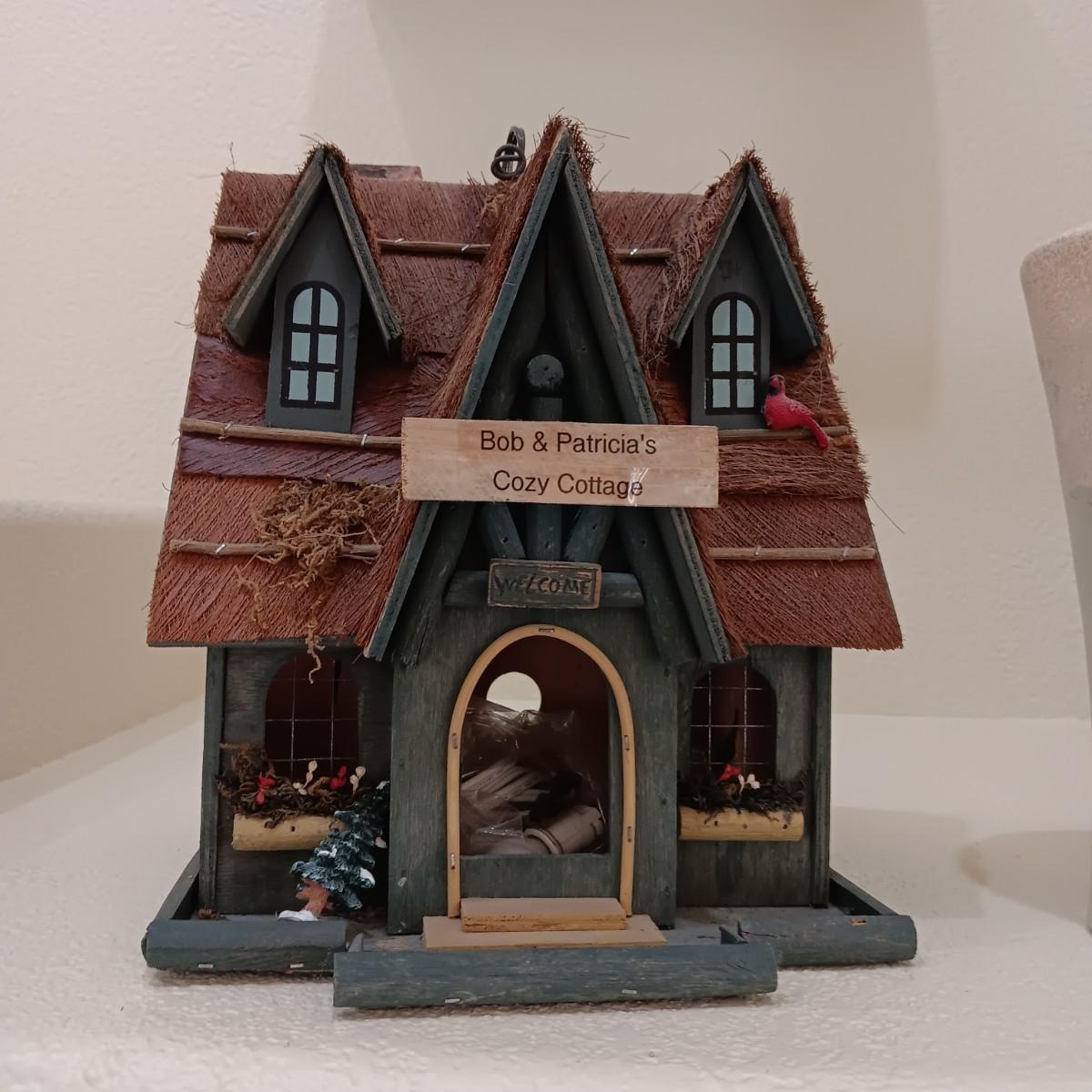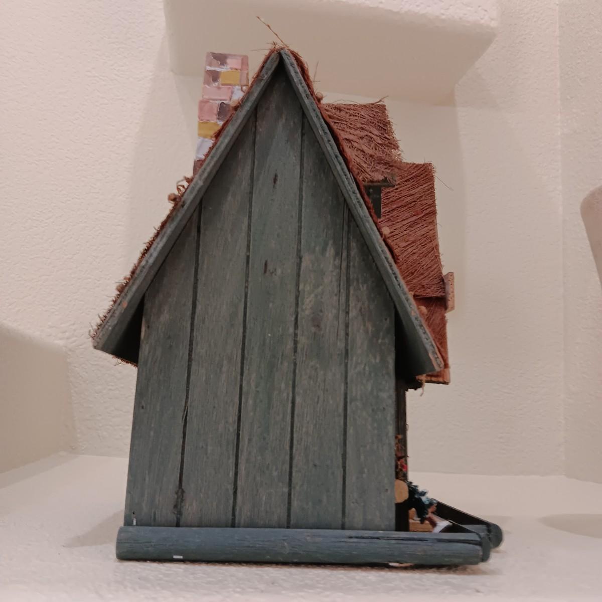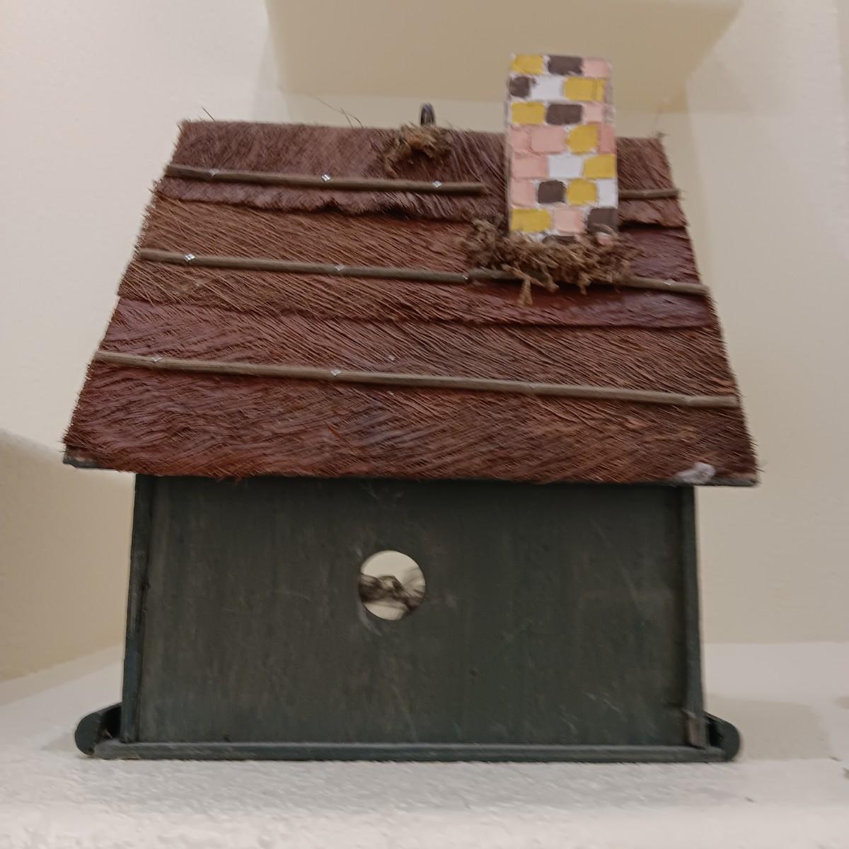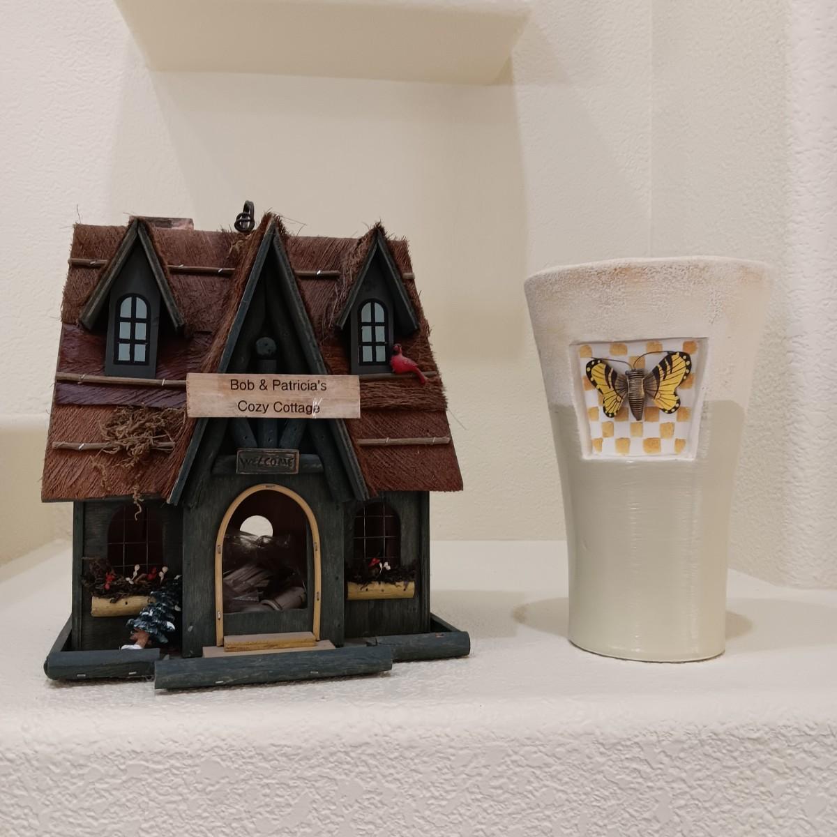 WOODEN BIRDHOUSE AND A CERAMIC VASE