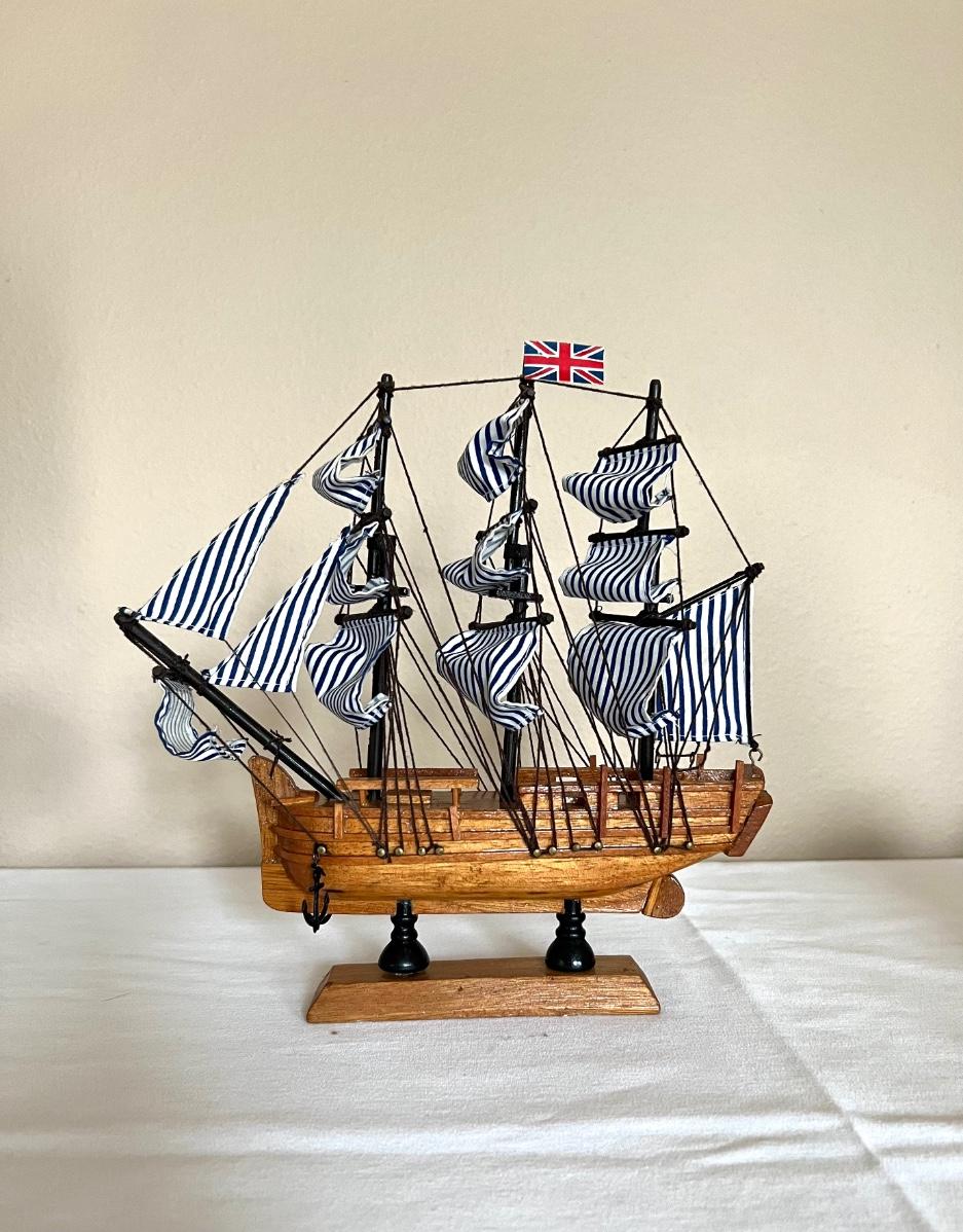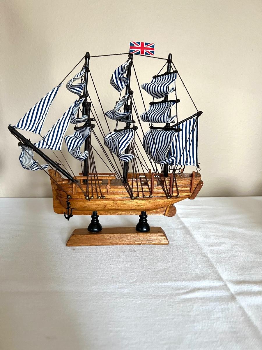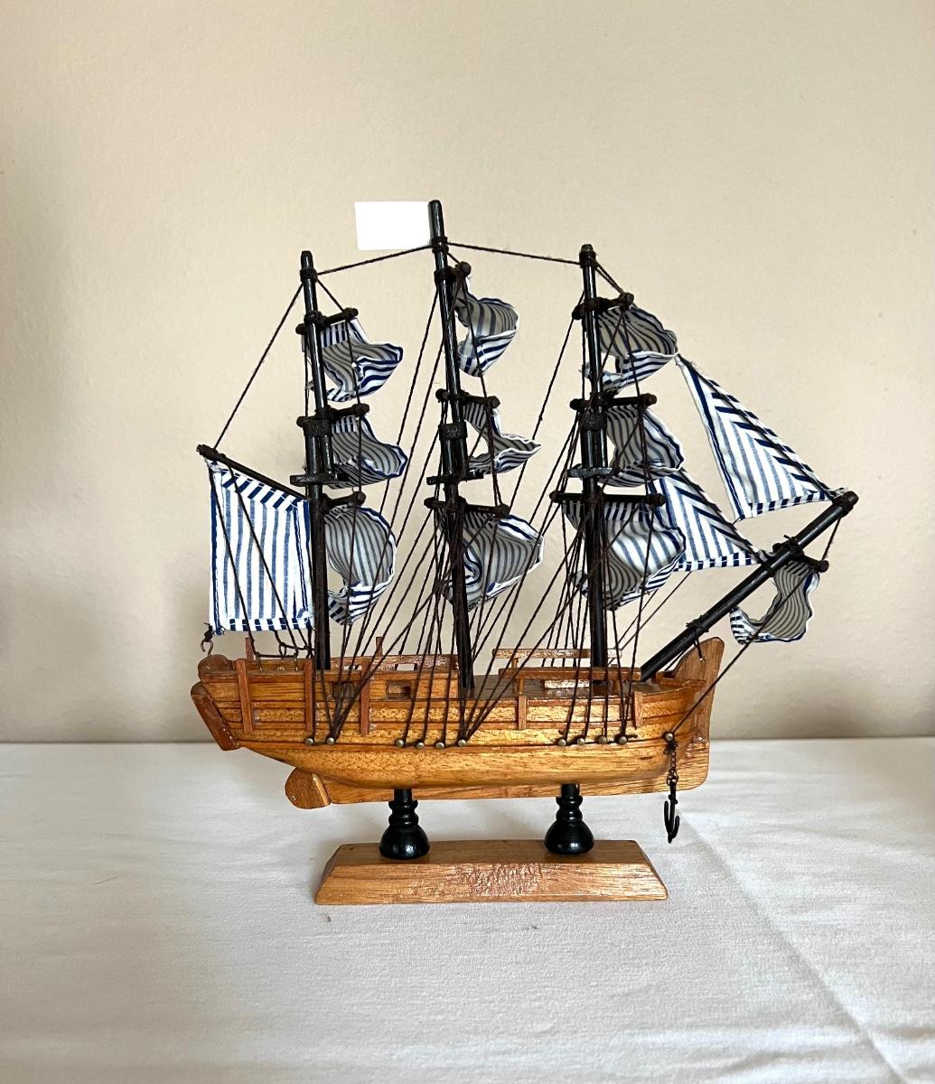 Pictures front of boat will need to be glued, anchor tie off is missing** second wooden ship measures 9 1/2 inches tall, 9 inches wide