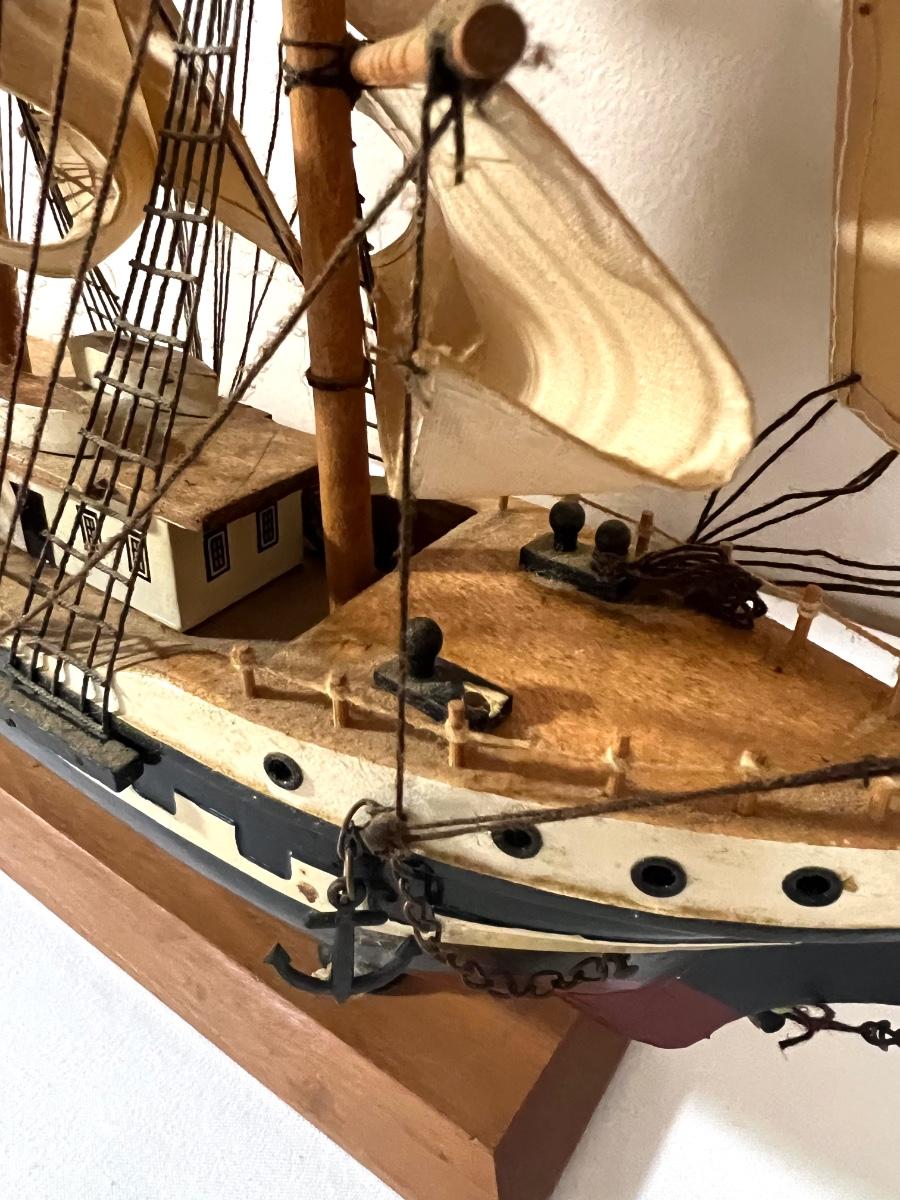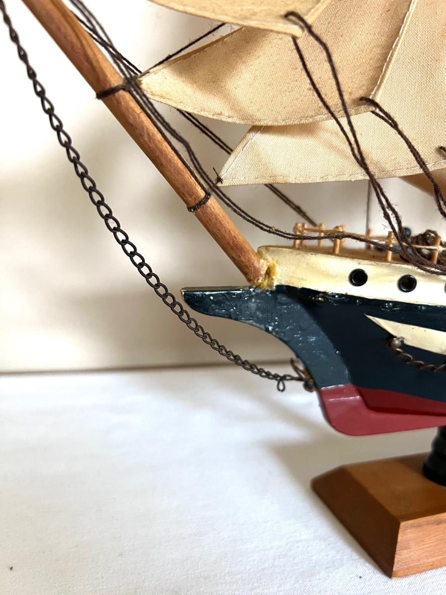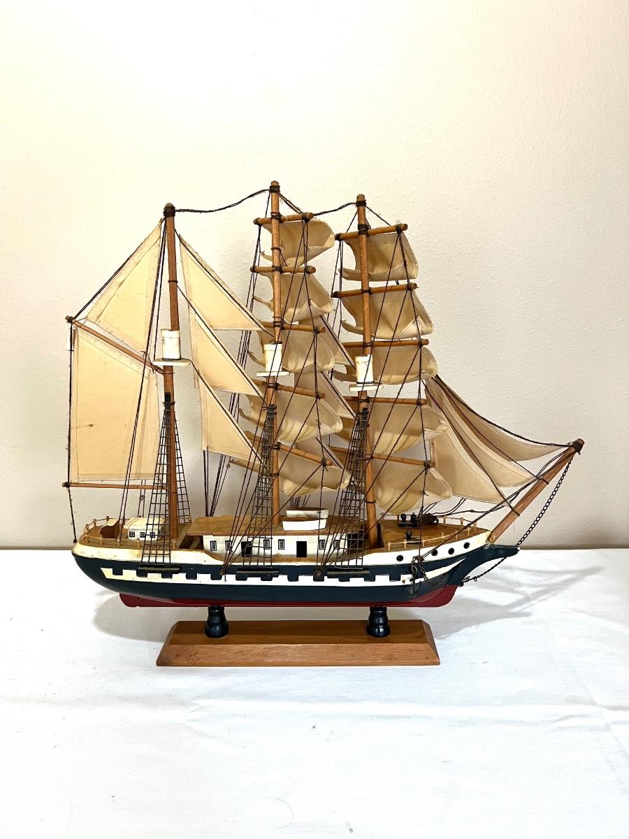 Pictures front of boat will need to be glued, anchor tie off is missing** second wooden ship measures 9 1/2 inches tall, 9 inches wide