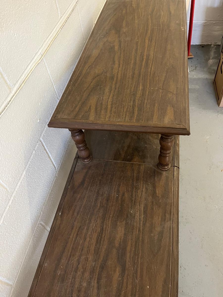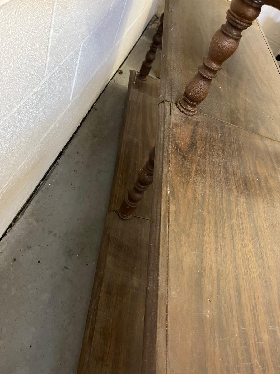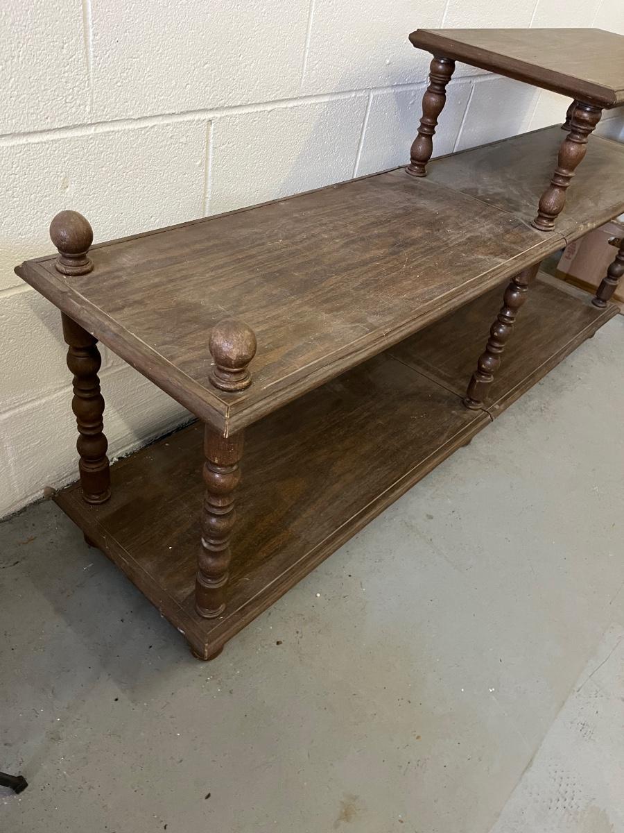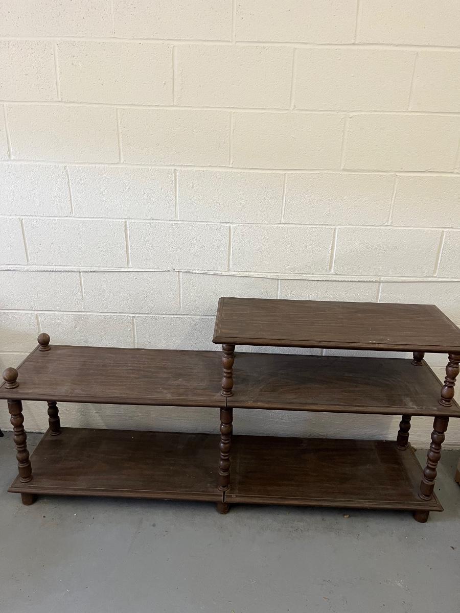 Lot includes a wooden bookcase that measures 62” x 16” x 30”H. Piece appears to be Formica with wood trim and spindles.